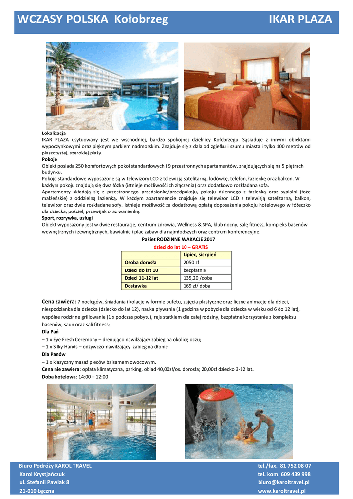 WCZASY POLSKA Kołobrzeg IKAR PLAZA Lokalizacja IKAR PLAZA usytuowany jest we wschodniej, bardzo spokojnej dzielnicy Kołobrzegu. Sąsiaduje z innymi obiektami wypoczynkowymi oraz pięknym parkiem nadmorskim. Znajduje się z dala od zgiełku i szumu miasta i tylko 100 metrów od piaszczystej, szerokiej plaży. Pokoje Obiekt posiada 250 komfortowych pokoi standardowych i 9 przestronnych apartamentów, znajdujących się na 5 piętrach budynku. Pokoje standardowe wyposażone są w telewizory LCD z telewizją satelitarną, lodówkę, telefon, łazienkę oraz balkon. W każdym pokoju znajdują się dwa łóżka (istnieje możliwość ich złączenia) oraz dodatkowo rozkładana sofa. Apartamenty składają się z przestronnego przedsionka/przedpokoju, pokoju dziennego z łazienką oraz sypialni (łoże małżeńskie) z oddzielną łazienką. W każdym apartamencie znajduje się telewizor LCD z telewizją satelitarną, balkon, telewizor oraz dwie rozkładane sofy. Istnieje możliwość za dodatkową opłatą doposażenia pokoju hotelowego w łóżeczko dla dziecka, pościel, przewijak oraz wanienkę. Sport, rozrywka, usługi Obiekt wyposażony jest w dwie restauracje, centrum zdrowia, Wellness & SPA, klub nocny, salę fitness, kompleks basenów wewnętrznych i zewnętrznych, bawialnię i plac zabaw dla najmłodszych oraz centrum konferencyjne. Pakiet RODZINNE WAKACJE 2017 dzieci do lat 10 – GRATIS Lipiec, sierpień Osoba dorosła 2050 zł Dzieci do lat 10 bezpłatnie Dzieci 11-12 lat 135,20 /doba Dostawka 169 zł/ doba Cena zawiera: 7 noclegów, śniadania i kolacje w formie bufetu, zajęcia plastyczne oraz liczne animacje dla dzieci, niespodzianka dla dziecka (dziecko do lat 12), nauka pływania (1 godzina w pobycie dla dziecka w wieku od 6 do 12 lat), wspólne rodzinne grillowanie (1 x podczas pobytu), rejs statkiem dla całej rodziny, bezpłatne korzystanie z kompleksu basenów, saun oraz sali fitness; Dla Pań – 1 x Eye Fresh Ceremony – drenująco nawilżający zabieg na okolicę oczu; – 1 x Silky Hands – odżywczo-nawilżający zabieg na dłonie Dla Panów – 1 x klasyczny masaż pleców balsamem owocowym. Cena nie zawiera: opłata klimatyczna, parking, obiad 40,00zł/os. dorosła; 20,00zł dziecko 3-12 lat. Doba hotelowa: 14:00 – 12:00 Biuro Podróży KAROL TRAVEL Karol Krystjańczuk ul. Stefanii Pawlak 8 21-010 Łęczna tel./fax. 81 752 08 07 tel. kom. 609 439 998 [email protected] www.karoltravel.pl