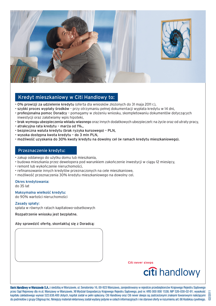 Kredyt mieszkaniowy w Citi Handlowy to: •0 % prowizji za udzielenie kredytu (oferta dla wniosków złożonych do 31 maja 2011 r.), • s zybki proces wypłaty środków – przy otrzymaniu pełnej dokumentacji wypłata kredytu w 14 dni, •p rofesjonalna pomoc Doradcy – pomagamy w złożeniu wniosku, skompletowaniu dokumentów dotyczących inwestycji oraz załatwiamy wpis hipoteki, •b rak wymogu ubezpieczenia wkładu własnego oraz innych dodatkowych ubezpieczeń: na życie oraz od utraty pracy, • atrakcyjna rata kredytu – marża od 1%., • bezpieczna waluta kredytu (brak ryzyka kursowego) – PLN, • wysoka dostępna kwota kredytu – do 3 mln PLN, • możliwość uzyskania do 30% kwoty kredytu na dowolny cel (w ramach kredytu mieszkaniowego). Przeznaczenie kredytu: • zakup oddanego do użytku domu lub mieszkania, • budowa mieszkania przez dewelopera pod warunkiem zakończenie inwestycji w ciągu 12 miesięcy, • remont lub wykończenie nieruchomości, • refinansowanie innych kredytów przeznaczonych na cele mieszkaniowe, • możliwość przeznaczenia 30% kredytu mieszkaniowego na dowolny cel. Okres kredytowania: do 35 lat Maksymalna wielkość kredytu: do 90% wartości nieruchomości Zasady spłaty: spłata w równych ratach kapitałowo-odsetkowych Rozpatrzenie wniosku jest bezpłatne. Bank Handlowy w Warszawie S.A. z siedzibą w Warszawie, ul. Senatorska 16, 00-923 Warszawa, zarejestrowany w rejestrze przedsiębiorców Krajowego Rejestru Sądowego przez Sąd Rejonowy dla m.st. Warszawy w Warszawie, XII Wydział Gospodarczy Krajowego Rejestru Sądowego, pod nr. KRS 000 000 1538; NIP 526-030-02-91; wysokość kapitału zakładowego wynosi 522.638.400 złotych, kapitał został w pełni opłacony. Citi Handlowy oraz Citi never sleeps są zastrzeżonymi znakami towarowymi należącymi do podmiotów z grupy Citigroup Inc. Niniejszy materiał reklamowy został wydany jedynie w celach informacyjnych i nie stanowi oferty w rozumieniu art. 66 Kodeksu cywilnego. 02/2011 Aby sprawdzić ofertę, skontaktuj się z Doradcą: