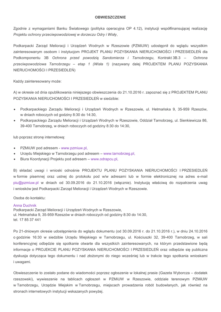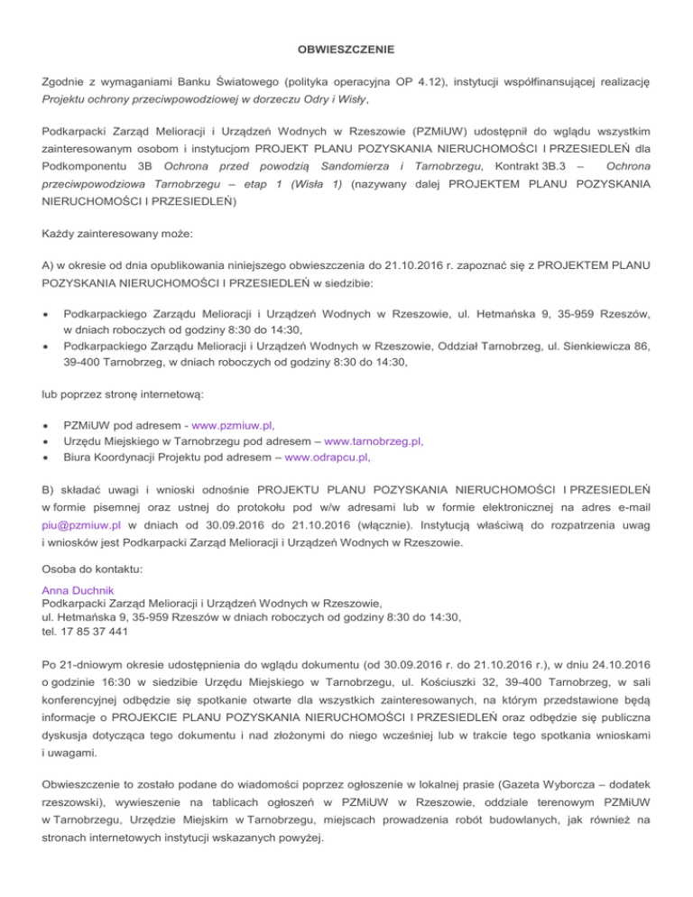 OBWIESZCZENIE Zgodnie z wymaganiami Banku Światowego (polityka operacyjna OP 4.12), instytucji współfinansującej realizację Projektu ochrony przeciwpowodziowej w dorzeczu Odry i Wisły, Podkarpacki Zarząd Melioracji i Urządzeń Wodnych w Rzeszowie (PZMiUW) udostępnił do wglądu wszystkim zainteresowanym osobom i instytucjom PROJEKT PLANU POZYSKANIA NIERUCHOMOŚCI I PRZESIEDLEŃ dla Podkomponentu 3B Ochrona przed powodzią Sandomierza i Tarnobrzegu, Kontrakt 3B.3 – Ochrona przeciwpowodziowa Tarnobrzegu – etap 1 (Wisła 1) (nazywany dalej PROJEKTEM PLANU POZYSKANIA NIERUCHOMOŚCI I PRZESIEDLEŃ) Każdy zainteresowany może: A) w okresie od dnia opublikowania niniejszego obwieszczenia do 21.10.2016 r. zapoznać się z PROJEKTEM PLANU POZYSKANIA NIERUCHOMOŚCI I PRZESIEDLEŃ w siedzibie: Podkarpackiego Zarządu Melioracji i Urządzeń Wodnych w Rzeszowie, ul. Hetmańska 9, 35-959 Rzeszów, w dniach roboczych od godziny 8:30 do 14:30, Podkarpackiego Zarządu Melioracji i Urządzeń Wodnych w Rzeszowie, Oddział Tarnobrzeg, ul. Sienkiewicza 86, 39-400 Tarnobrzeg, w dniach roboczych od godziny 8:30 do 14:30, lub poprzez stronę internetową: PZMiUW pod adresem - www.pzmiuw.pl, Urzędu Miejskiego w Tarnobrzegu pod adresem – www.tarnobrzeg.pl, Biura Koordynacji Projektu pod adresem – www.odrapcu.pl, B) składać uwagi i wnioski odnośnie PROJEKTU PLANU POZYSKANIA NIERUCHOMOŚCI I PRZESIEDLEŃ w formie pisemnej oraz ustnej do protokołu pod w/w adresami lub w formie elektronicznej na adres e-mail [email protected] w dniach od 30.09.2016 do 21.10.2016 (włącznie). Instytucją właściwą do rozpatrzenia uwag i wniosków jest Podkarpacki Zarząd Melioracji i Urządzeń Wodnych w Rzeszowie. Osoba do kontaktu: Anna Duchnik Podkarpacki Zarząd Melioracji i Urządzeń Wodnych w Rzeszowie, ul. Hetmańska 9, 35-959 Rzeszów w dniach roboczych od godziny 8:30 do 14:30, tel. 17 85 37 441 Po 21-dniowym okresie udostępnienia do wglądu dokumentu (od 30.09.2016 r. do 21.10.2016 r.), w dniu 24.10.2016 o godzinie 16:30 w siedzibie Urzędu Miejskiego w Tarnobrzegu, ul. Kościuszki 32, 39-400 Tarnobrzeg, w sali konferencyjnej odbędzie się spotkanie otwarte dla wszystkich zainteresowanych, na którym przedstawione będą informacje o PROJEKCIE PLANU POZYSKANIA NIERUCHOMOŚCI I PRZESIEDLEŃ oraz odbędzie się publiczna dyskusja dotycząca tego dokumentu i nad złożonymi do niego wcześniej lub w trakcie tego spotkania wnioskami i uwagami. Obwieszczenie to zostało podane do wiadomości poprzez ogłoszenie w lokalnej prasie (Gazeta Wyborcza – dodatek rzeszowski), wywieszenie na tablicach ogłoszeń w PZMiUW w Rzeszowie, oddziale terenowym PZMiUW w Tarnobrzegu, Urzędzie Miejskim w Tarnobrzegu, miejscach prowadzenia robót budowlanych, jak również na stronach internetowych instytucji wskazanych powyżej.
