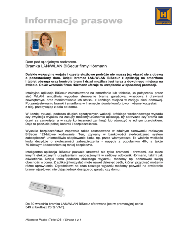 Dom pod specjalnym nadzorem. Bramka LAN/WLAN BiSecur firmy Hörmann Dalekie wakacyjne wojaże i częste służbowe podróże nie muszą już wiązać się z obawą o pozostawiony dom. Dzięki bramce LAN/WLAN BiSecur z aplikacją na smartfona i tablet obsługa oraz kontrola bram i drzwi możliwa jest teraz z dowolnego miejsca na świecie. Do 30 września firma Hörmann oferuje to urządzenie w specjalnej promocji. Intuicyjna aplikacja BiSecur zainstalowana na smartfonie lub tablecie, po połączeniu przez sieć WLAN, umożliwia wygodne sterowanie bramą garażową, wjazdową i drzwiami zewnętrznymi oraz monitorowanie ich statusu z każdego miejsca w zasięgu sieci domowej. Po zarejestrowaniu bramki i smartfona w Internecie równie komfortowo możemy korzystać z niej, przebywając z dala od domu. W każdej sytuacji, podczas długich egzotycznych wakacji, krótkiego weekendowego wypadu czy zwykłego wyjazdu na zakupy możemy uruchomić aplikację, by sprawdzić czy brama lub drzwi są zamknięte, a w razie konieczności zamknąć lub otworzyć je jednym przyciskiem. Daje to poczucie pełnej kontroli i bezpieczeństwa. Wysokie bezpieczeństwo zapewnia także zastosowane w zdalnym sterowaniu radiowym BiSecur 128-bitowe kodowanie. Ten, używany w bankowości elektronicznej, system zabezpieczeń uniemożliwia skopiowanie kodu, np. przez włamywacza. To właśnie wielkość kodu decyduje o skuteczności zabezpieczenia - napędy z popularnym 40-, a także 70-bitowym kodowaniem są mniej bezpieczne. Inteligentna aplikacja BiSecur pozwala sterować nie tylko bramami i drzwiami, ale także innymi elektrycznymi urządzeniami wyposażonymi w radiowy odbiornik Hörmann, takimi jak oświetlenie. Dzięki temu podczas dłuższego wyjazdu, możemy np. pozorować swoją obecność w domu. Z aplikacji korzystać może nawet dziesięć osób, którym przypisać możemy różne uprawnienia. Ogrodnikowi na czas naszego wyjazdu możemy pozwolić na otwieranie bramy wjazdowej, nie dając jednak dostępu do garażu czy domu. Do 30 września bramka LAN/WLAN BiSecur oferowana jest w promocyjnej cenie 549 zł brutto (z 23 % VAT). Hörmann Polska /Tekst DS / Strona 1 z 1