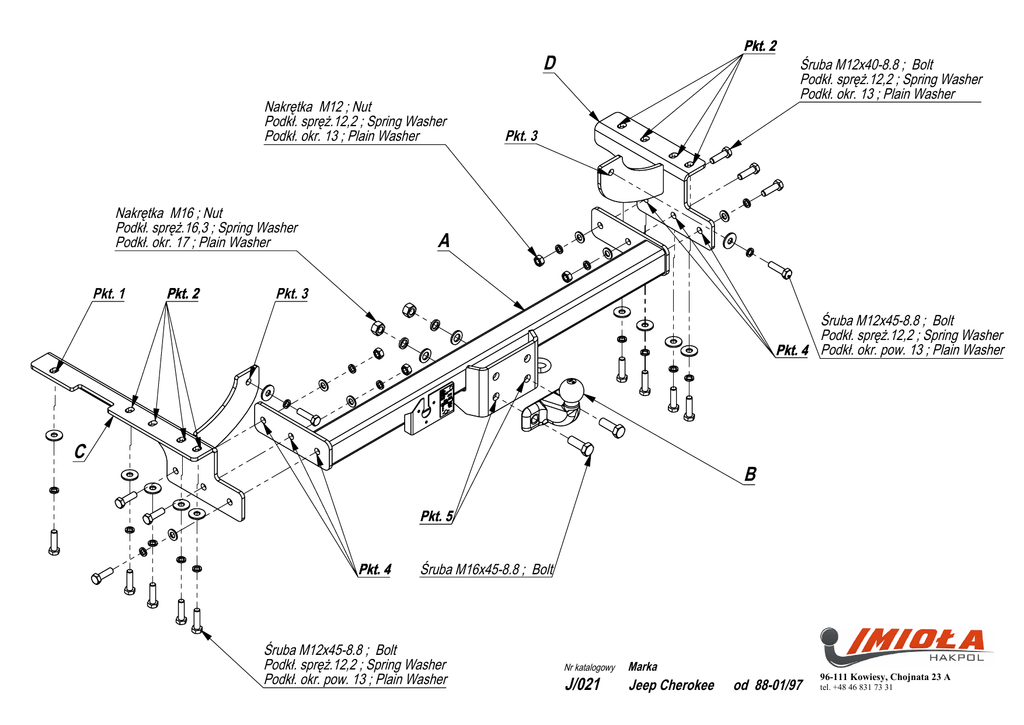 Pkt. 2 D Nakrętka M12 ; Nut Podkł. spręż.12,2 ; Spring Washer Podkł. okr. 13 ; Plain Washer Nakrętka M16 ; Nut Podkł. spręż.16,3 ; Spring Washer Podkł. okr. 17 ; Plain Washer Pkt. 1 Pkt. 2 Śruba M12x40-8.8 ; Bolt Podkł. spręż.12,2 ; Spring Washer Podkł. okr. 13 ; Plain Washer Pkt. 3 A Pkt. 3 Śruba M12x45-8.8 ; Bolt Podkł. spręż.12,2 ; Spring Washer Pkt. 4 Podkł. okr. pow. 13 ; Plain Washer C B Pkt. 5 Pkt. 4 Śruba M16x45-8.8 ; Bolt Śruba M12x45-8.8 ; Bolt Podkł. spręż.12,2 ; Spring Washer Podkł. okr. pow. 13 ; Plain Washer Nr katalogowy J/021 Marka Jeep Cherokee od 88-01/97 96-111 Kowiesy, Chojnata 23 A tel. +48 46 831 73 31 ZESTAW ŚRUBOWY: FASTENING MEANS: Gniazdo 7-biegunowe 12V z ruchomymi bolcami Symbol SWW 1135-812 Oznaczenie zacisku 31 L R 54 58L 58R + Zacisk do łączenia przewodów do masy pojazdu do świateł kierunku jazdy lewych do świateł kierunku jazdy prawych do świateł hamowania do świateł pozycyjnych lewych do świateł pozycyjnych prawych tylne światła przeciwmgłowe Moment skręcający dla śrub i nakrętek (8.8) Torgue settings for nuts and bolts (8.8) M8 25 Nm M12 M10 55 Nm M14 M16 195 Nm Kolory Biały , white śółty , yellow zielony, green czerwony, red czarny, black brązowy, brown niebieski , blue JEEP CHEROKEE 88 – 01/97 NO CAT.J/021 INSTRUKCJA MONTAśU: FITTING INSTRUCTION: • • • • • • 2szt 11szt 6szt -M16 -M12 -M16 -M12 2szt 17szt 2szt 17szt -M16 -M12 2szt 6szt 85 Nm 135 Nm • • • • -M16x45 8.8 -M12x45 8.8 -M12x40 8.8 Odkręcić zderzak. Do prawej podłuŜnicy przyłoŜyć element haka D, a do lewej – element haka C tak, aby otwory pokryły się z fabrycznymi otworami i skręcić śrubami M12x45 8.8 (pkt 1 i 2). Między elementy C i D wsunąć belkę haka A i skręcić śrubami M12x40 8.8 (pkt 4). Poprzez otwory w haku (pkt 3) wykonać otwory ø 12.5 w tylnym pasie i skręcić śrubami M12x45 8.8. Przykręcić zderzak. Przykręcić kulę i blachę gniazda elektrycznego. Dokręcić wszystkie śruby z momentem według tabeli. Podłączyć instalację elektryczną. • • • • • • Unscrew the bumper. Put the element D to the right metal clamp, and the element C to the left metal clamp in this way, so the holes agree with the technological holes and screw with bolts M12x45 8.8 (point 1 and 2). Insert the main bar A between the elements C and D and screw with bolts M12x40 8.8 (point 4). Drill the holes ø 12.5 in the rear belt through the holes in the tow bar (point 3) and screw with bolts M12x45 8.8. Screw the bumper. Fix the ball and electric plate. Tighten all the bolts according to the torque setting- see the table. Connect the electric wires. WARUNKI EKSPLOATACJI. Zakład Produkcyjno Handlowo Usługowy 96-111 Kowiesy, Chojnata 23A tel. (0-46) 831 73 31, fax 831 74 29 www.hakpol.pl POLAND Zaczep posiada tabliczkę znamionową obowiązującą uŜytkownika w zakresie prawidłowego i bezpiecznego obciąŜenia. R = 3300 kg D = 12,50 kN ⇓ Zaczep kulowy do samochodu: S = 130 kg JEEP CHEROKEE 88 - 01/97 Nr katalogowy J/021 KARTA GWARANCYJNA Warunki gwarancyjne i postępowanie reklamacyjne 1. 2. 3. 4. 5. Producent zobowiązuje się do wymiany wadliwego wyrobu w okresie 12 miesięcy od daty zakupu lub 24 miesięcy od daty produkcji, w terminie 14-dniowym. Wymianę wadliwego wyrobu dokonuje się w miejscu zakupu lub bezpośrednio u producenta. Nie podlega reklamacji gwarancyjnej zaczep kulowy, którego uszkodzenie nastąpiło: a) wskutek wypadku, b) wskutek nieprzestrzegania zasad prawidłowej obsługi, eksploatacji, konserwacji podanych w instrukcji. Karta gwarancyjna bez daty sprzedaŜy , pieczęci sklepu lub warsztatu montującego, nie moŜe słuŜyć jako podstawa do reklamacji. W skutek nie prawidłowego zamontowania zaczepu. W czasie całej eksploatacji naleŜy poszczególne elementy zaczepu utrzymywać w naleŜytym stanie technicznym (właściwie dokręcone elementy złączone, całość konstrukcji zabezpieczona przed działaniem korozji). Przyczepa musi być połączona z zaczepem kulowym dodatkowym złączem o odpowiedniej wytrzymałości (łańcuch, linka z zapięciem). UWAGA Uszkodzenia mechaniczne zaczepu kulowego np. w wyniku najechania, zaczepienia przeszkodę, wykluczają dalszą eksploatację zaczepu. Uszkodzony zaczep kulowy nie moŜe być naprawiany. Sprawdzić śruby mocujące zaczep kulowy po około 1000 km przebiegu eksploatacji. Nacisk pionowy na kulę zaczepu nie moŜe przekroczyć 130 kg. Po zamontowaniu zaczepu kulowego naleŜy dokonać przeglądu na stacji diagnostycznej! data sprzedaŜy............................ nr rej poj .................................... Data produkcji........-.................. m-c rok. Przeznaczenie Zaczep kulowy zamontowany do samochodu przeznaczony jest do holowania przyczep towarowych i turystycznych. Warunki zamontowania Zaczep moŜe być zamontowany i eksploatowany w samochodzie, który posiada właściwy stan techniczny elementów podwozia, poprzez które następuje podłączenie zaczepu. Elementy te nie mogą być uszkodzone mechanicznie ani poprzez działanie korozji. ............................ pieczęć sprzedawcy. Hak jest produkowany zgodnie z wytycznymi regulaminu EKG/ONZ: Nr certyfikatu zgodności: 10/09 10/09