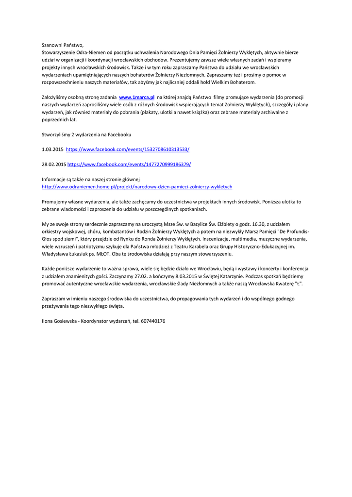 Szanowni Państwo, Stowarzyszenie Odra-Niemen od początku uchwalenia Narodowego Dnia Pamięci Żołnierzy Wyklętych, aktywnie bierze udział w organizacji i koordynacji wrocławskich obchodów. Prezentujemy zawsze wiele własnych zadań i wspieramy projekty innych wrocławskich środowisk. Także i w tym roku zapraszamy Państwa do udziału we wrocławskich wydarzeniach upamiętniających naszych bohaterów Żołnierzy Niezłomnych. Zapraszamy też i prosimy o pomoc w rozpowszechnieniu naszych materiałów, tak abyśmy jak najliczniej oddali hołd Wielkim Bohaterom. Założyliśmy osobną stronę zadania www.1marca.pl na której znajdą Państwo filmy promujące wydarzenia (do promocji naszych wydarzeń zaprosiliśmy wiele osób z różnych środowisk wspierających temat Żołnierzy Wyklętych), szczegóły i plany wydarzeń, jak również materiały do pobrania (plakaty, ulotki a nawet książka) oraz zebrane materiały archiwalne z poprzednich lat. Stworzyliśmy 2 wydarzenia na Facebooku 1.03.2015 https://www.facebook.com/events/1532708610313533/ 28.02.2015 https://www.facebook.com/events/1477270999186379/ Informacje są także na naszej stronie głównej http://www.odraniemen.home.pl/projekt/narodowy-dzien-pamieci-zolnierzy-wykletych Promujemy własne wydarzenia, ale także zachęcamy do uczestnictwa w projektach innych środowisk. Poniższa ulotka to zebrane wiadomości i zaproszenia do udziału w poszczególnych spotkaniach. My ze swoje strony serdecznie zapraszamy na uroczystą Msze Św. w Bazylice Św. Elżbiety o godz. 16.30, z udziałem orkiestry wojskowej, chóru, kombatantów i Rodzin Żołnierzy Wyklętych a potem na niezwykły Marsz Pamięci "De ProfundisGłos spod ziemi", który przejdzie od Rynku do Ronda Żołnierzy Wyklętych. Inscenizacje, multimedia, muzyczne wydarzenia, wiele wzruszeń i patriotyzmu szykuje dla Państwa młodzież z Teatru Karabela oraz Grupy Historyczno-Edukacyjnej im. Władysława Łukasiuk ps. MŁOT. Oba te środowiska działają przy naszym stowarzyszeniu. Każde poniższe wydarzenie to ważna sprawa, wiele się będzie działo we Wrocławiu, będą i wystawy i koncerty i konferencja z udziałem znamienitych gości. Zaczynamy 27.02. a kończymy 8.03.2015 w Świętej Katarzynie. Podczas spotkań będziemy promować autentyczne wrocławskie wydarzenia, wrocławskie ślady Niezłomnych a także naszą Wrocławska Kwaterę "Ł". Zapraszam w imieniu naszego środowiska do uczestnictwa, do propagowania tych wydarzeń i do wspólnego godnego przeżywania tego niezwykłego święta. Ilona Gosiewska - Koordynator wydarzeń, tel. 607440176