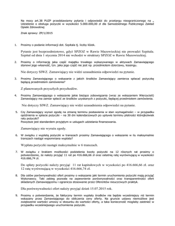 Na mocy art.38 PUZP przedstawiamy pytania i odpowiedzi do przetargu nieograniczonego na „ Udzielenie o obsługa pożyczki w wysokości 5.000.000,00 zł dla Samodzielnego Publicznego Zakład Opieki Zdrowotnej Znak sprawy: ZP/1/2015 1. Prosimy o podanie informacji dot. Szpitala tj. liczby łóżek. Pytanie jest bezprzedmiotowe, gdyż SPZOZ w Rawie Mazowieckiej nie prowadzi Szpitala. Szpital od dnia 1 stycznia 2014 nie wchodzi w struktury SPZOZ w Rawie Mazowieckiej. 2. Prosimy o informację jaka część majątku trwałego wykazywanego w aktywach Zamawiającego stanowi jego własność, tzn. jaka jego część nie jest np. przedmiotem dzierżawy, leasingu. Nie dotyczy SIWZ. Zamawiający nie widzi uzasadnienia odpowiedzi na pytanie. 3. Prosimy Zamawiającego o wskazanie z jakich środków Zamawiający zamierza spłacać pożyczkę będącą przedmiotem zamówienia? Z planowanych przyszłych przychodów. 4. Prosimy Zamawiającego o wskazanie jakie bieżące zobowiązania (wraz ze wskazaniem Wierzycieli) Zamawiający ma zamiar spłacić ze środków uzyskanych z pożyczki, będącej przedmiotem zamówienia. Nie dotyczy SIWZ. Zamawiający nie widzi uzasadnienia odpowiedzi na pytanie. 5. Czy Zamawiający wyrazi zgodę na zmianę terminu postawienia w stan wymagalności – w przypadku opóźnienia w spłacie pożyczki – na 30 dni kalendarzowych po upływie terminu płatności którejkolwiek raty pożyczki? Powyższe jest standardem przyjętym w usługach udzielania finansowania. Zamawiający nie wyraża zgody. 6. W związku z wypłatą pożyczki w transzach prosimy Zamawiającego o wskazanie w ilu maksymalnie transzach nastąpi wspomniana wyplata? Wypłata pożyczki nastąpi maksymalnie w 6 transzach. 7. W związku z brakiem możliwości podzielenia kwoty pożyczki na 12 równych rat prosimy o potwierdzenie, że należy przyjąć 11 rat po 416.666,66 zł oraz ostatnią ratę wyrównującą w wysokości 416.666,74 zł. Do spłaty pożyczki należy przyjąć 11 rat kapitałowych w wysokości po 416.666,66 zł. oraz 12 ratę wyrównującą w wysokości 416.666,74 zł. 8. Dla celów porównywalności ofert prosimy o wskazanie jaki termin uruchomienia pożyczki mają przyjąć Wykonawcy. Taki zabieg pozwala na zapewnienie porównywalności oraz transparentności ofert składanych Zamawiającemu i ogranicza stosowanie przez Oferentów nieuczciwych praktyk. Dla porównywalności ofert należy przyjąć dzień 15.07.2015 rok. 9. Prosimy o potwierdzenie, że faktyczny termin wypłaty środków nie będzie wcześniejszy niż termin wskazany przez Zamawiającego do obliczenia ceny oferty. Na gruncie ustawy niemożliwe jest zwiększenie wartości umowy w stosunku do wartości oferty, a taka konieczność mogłaby zaistnieć w przypadku wcześniejszego uruchomienia pożyczki. Faktyczny termin wypłaty środków nie będzie wcześniejszy niż termin wskazany przez Wykonawcę w ofercie. 10. Prosimy Zamawiającego o wskazanie terminu spłaty pierwszej raty odsetkowej. Czy data spłaty pierwszej raty odsetkowej wypada na koniec miesiąca, w którym nastąpiła wypłata środków pierwszej transzy? Data spłaty pierwszej raty odsetkowej przypada na koniec miesiąca, w którym nastąpiła wypłata środków pierwszej transzy pożyczki. 11. W nawiązaniu do zapisów §2 ust. 3 wzoru umowy pożyczki, prosimy Zamawiającego o wskazanie jakie dni Zamawiający uznaje za dni robocze? Za dni robocze Zamawiający uznaje dni od poniedziałku do piątku z wyłączeniem dni ustawowo wolnych od pracy. 12. W związku z zapisami §2 ust. 3 wzoru umowy pożyczki, prosimy Zamawiającego o potwierdzenie, że w celu przygotowania harmonogramu i wyliczenia ceny oferty Wykonawcy mają przyjąć spłatę rat kapitałowych i odsetkowych na koniec każdego miesiąca kalendarzowego (odsetki bieżące będą naliczane do ostatniego dnia kalendarzowego). W przypadku odmiennej interpretacji prosimy o wskazanie sposobu naliczana odsetek bieżących. Tak 13. Prosimy o potwierdzenie, że zapis: „Zamawiający dopuszcza zmianę wysokości spłat rat kapitałowych w okresie spłaty pożyczki/kredytu.”, dotyczy jedynie sytuacji zmiany wysokości rat bez wpływu na ich ilość czy też wydłużenie okresu finansowania. Dodatkowo prosimy o potwierdzenie, że wspomniane zmiany będą możliwe za zgodą obydwu stron i będą wymagały formy pisemnej tj. zawarcia aneksu do umowy pożyczki. Zapis należy rozumieć w ten sposób, że dopuszcza się zmianę ilości rat i ich wysokości bez wydłużenia okresu finansowania. Odpowiedź na drugą część pytania znajduje się w § 3 ust. 8 wzoru umowy pożyczki. 14. Ze względu na brak precyzyjnego określenia kosztu umowy pożyczki w postaci prowizji, a co za tym idzie, brak pewności Wykonawców co do oczekiwanego sposobu kalkulacji ceny ofertowej, prosimy o doprecyzowanie maksymalnej wartości prowizji. Wysokość prowizji ustala Wykonawca w złożonej ofercie. Zamawiający odmawia ustalenia maksymalnej wysokości prowizji. 15. Prosimy o zmianę Zapisu §5 ust. 1 wzoru umowy pożyczki i nadanie mu brzmienia: „ Niespłacone w terminie określonym w niniejszej umowie należności określone w §3 oraz należności wymagalne w trybie określonym w §4 traktowane są jako zadłużenie przeterminowane.” Zamawiający zmienia zapis § 5 ust. 1 wzoru umowy pożyczki i nadaje mu brzmienie: „Niespłacone w terminie określonym w niniejszej umowie należności określone w § 3, oraz należności wymagalne w trybie określone w § 4 traktowane są jako zadłużenie przeterminowane.” 16. Czy Zamawiający potwierdza, że zabezpieczenia umowy pożyczki będą obejmować wartość umowy wraz z całkowitym kosztem jej udzielenia? Tak 17. Czy Zamawiający dopuszcza wprowadzenie do umowy pożyczki zapisu, zgodnie z którym udostępnienie Zamawiającemu kwoty pożyczki nastąpi pod warunkiem ustanowienia zabezpieczenia w postaci weksla in blanco? W przypadku odmownej odpowiedzi prosimy o podanie terminu, w 