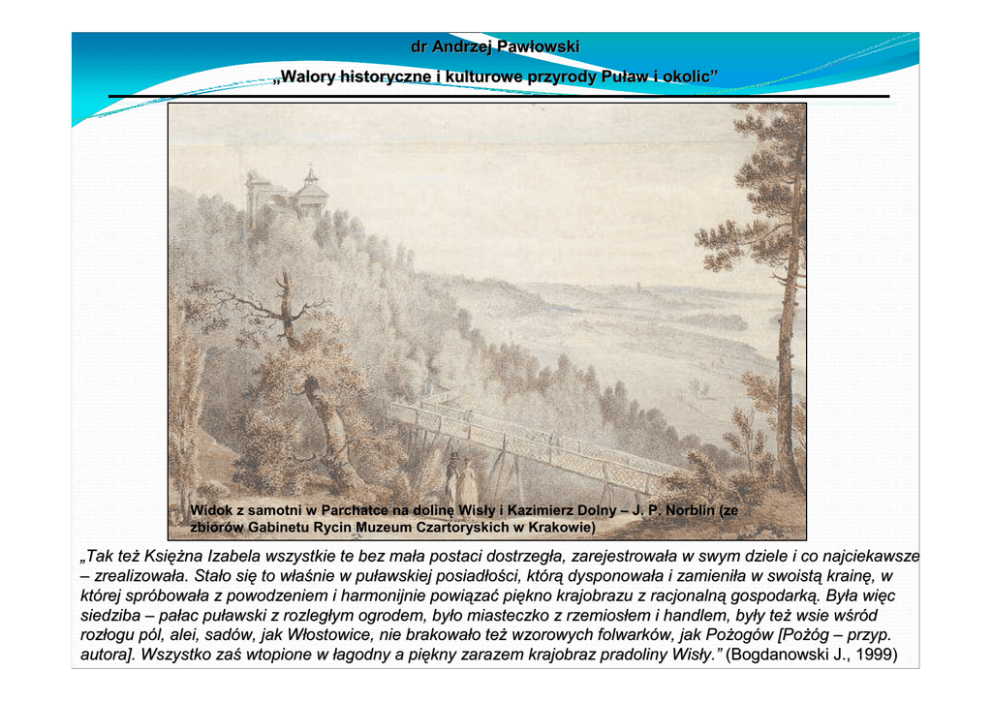 dr Andrzej Pawł Pawłowski „Walory historyczne i kulturowe przyrody Puł Puław i okolic” okolic” Widok z samotni w Parchatce na dolinę Wisły i Kazimierz Dolny – J. P. Norblin (ze zbiorów Gabinetu Rycin Muzeum Czartoryskich w Krakowie) „Tak teŜ na Izabela wszystkie te bez mał teŜ KsięŜ KsięŜna mała postaci dostrzegł dostrzegła, zarejestrował zarejestrowała w swym dziele i co najciekawsze – zrealizował zrealizowała. Stał Stało się się to wł właśnie w puł puławskiej posiadł posiadłości, któ którą dysponował dysponowała i zamienił zamieniła w swoistą swoistą krainę krainę, w któ której spró spróbował bowała z powodzeniem i harmonijnie powią powiązać zać pię piękno krajobrazu z racjonalną racjonalną gospodarką gospodarką. Był Była wię więc siedziba – pał pałac puł puławski z rozległ rozległym ogrodem, był było miasteczko z rzemiosł rzemiosłem i handlem, był były teŜ teŜ wsie wś wśród rozł rozłogu pó pól, alei, sadó sadów, jak Włostowice, ostowice, nie brakował brakowało teŜ teŜ wzorowych folwarkó folwarków, jak PoŜ PoŜogó ogów [PoŜ [PoŜóg – przyp. autora]. Wszystko zaś zaś wtopione w łagodny a pię piękny zarazem krajobraz pradoliny Wisł Wisły.” y.” (Bogdanowski J., 1999)