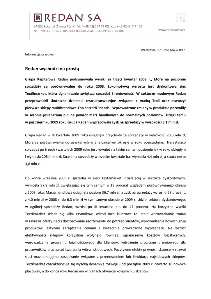 Warszawa, 17 listopada 2009 r. Informacja prasowa Redan wychodzi na prostą Grupa Kapitałowa Redan podsumowała wyniki za trzeci kwartał 2009 r., które na poziomie sprzedaży są porównywalne do roku 2008. Lokomotywą wzrostu jest dyskontowa sied Textilmarket, która dynamicznie zwiększa sprzedaż i rentownośd. W sektorze modowym Redan przeprowadził skuteczne działania restrukturyzacyjne związane z marką Troll oraz otworzył pierwsze sklepy multibrandowe Top Secret&Friends. Wprowadzone zmiany w produkcie pozwoliły w sezonie jesieo/zima b.r. na powrót marż handlowych do normalnych poziomów. Dzięki temu w październiku 2009 roku Grupa Redan wypracowała zysk na sprzedaży w wysokości 3,1 mln zł. Grupa Redan w III kwartale 2009 roku osiągnęła przychody ze sprzedaży w wysokości 70,0 mln zł, które są porównywalne do uzyskanych w analogicznym okresie w roku poprzednim. Narastająco sprzedaż po trzech kwartałach 2009 roku jest również na takim samym poziomie jak w roku ubiegłym i wyniosła 208,4 mln zł. Strata na sprzedaży w trzecim kwartale b.r. wyniosła 4,4 mln zł, a strata netto 3,8 mln zł. Do kooca września 2009 r. sprzedaż w sieci Textilmarket, działającej w sektorze dyskontowym, wyniosła 97,8 mln zł, zwiększając się tym samym o 18 procent względem porównywanego okresu z 2008 roku. Marża handlowa osiągnęła poziom 36,7 mln zł, a zysk na sprzedaży wzrósł o 58 procent, z 4,0 mln zł w 2008 r. do 6,3 mln zł w tym samym okresie w 2009 r. Udział sektora dyskontowego, w ogólnej sprzedaży Redan, wzrósł po III kwartale b.r. do 47 procent. Na korzystne wyniki Textilmarket składa się kilka czynników, wśród nich kluczowe to: stałe wprowadzanie zmian w zakresie oferty sieci i dostosowanie asortymentu do potrzeb klientów, wprowadzenie nowych grup produktów, aktywne zarządzanie cenami i skutecznie prowadzone wyprzedaże. Na wzrost efektywności sklepów korzystnie wpłynęło również: ograniczenie kosztów logistycznych, wprowadzenie programu lojalnościowego dla klientów, wdrożenie programu premiowego dla pracowników oraz zasad tworzenia witryn sklepowych. Pozytywne efekty przynosi skuteczny rozwój sieci oraz umiejętne zarządzanie związane z przenoszeniem lub likwidacją najsłabszych sklepów. Textilmarket charakteryzuje się wysoką dynamiką rozwoju - od początku 2009 r. otwarto 18 nowych placówek, a do kooca roku Redan ma w planach otwarcie kolejnych 5 sklepów. W ocenie Spółki wprowadzenie zmiany sposobu sprzedaży marki Troll pozwoli na przywrócenie jej rentowności. Grupa widzi korzystne perspektywy wynikające z wprowadzonych zmian w sieci dystrybucji marki Troll w minionych trzech kwartałach 2009 r. Dalsze funkcjonowanie marki Troll opiera się na franczyzowym modelu biznesu. Zostały zlikwidowane nierentowne sklepy własne (28 z 36 na początku roku) oraz wprowadzono ubrania tej marki do nowej sieci sklepów multibrandowych Top Secret&Friends. Poprawie kondycji marki pomogło również ograniczenie kosztów centrali Troll, które w III kwartale b.r. spadły o 52 procent w porównaniu do roku poprzedniego. Oprócz tych działao Redan zakooczy restrukturyzację pozostałych 8 sklepów własnych Troll – docelowo zostanie jeden sklep flagowy. Plan uwzględnia także dalszy rozwój sklepów multibrandowych. Do kooca b.r. zostaną otwarte 2 nowe i 4 powstaną poprzez przekształcenie dotychczasowych placówek Top Secret, dzięki czemu marka Troll będzie miała zapewnioną sied dystrybucji w dużych miastach. Sprzedaż marki Top Secret działającej w sektorze modowym wzrosła i wyniosła 69,8 mln zł w trzech kwartałach b.r. Odwrotna tendencja dotyczyła marży handlowej, która osiągnęła poziom 44,4%, to jest o prawie 17 punktów procentowych mniej niż rok temu. Na jej spadek wpłynęło przede wszystkim bardzo znaczące i szybkie osłabienie polskiej waluty wobec amerykaoskiego dolara oraz prowadzenie agresywnych przecen wynikających z obniżenia się popytu wśród klientów. Receptą Redanu na takie warunki rynkowe były zmiany w produkcie. Dzięki temu w październiku b.r. marża handlowa w Top Secret wróciła do poziomów z lat poprzednich. Pozwala to Grupie Redan oczekiwad, że tendencja ta będzie utrzymana, co zapewni powrót zysków w marce Top Secret. Potwierdzeniem tego są wyniki października b.r., w którym Grupa Redan uzyskała zysk na sprzedaży na poziomie 3,1 mln zł. *** Redan SA jest operatorem znanych detalicznych marek odzieżowych: Top Secret, Troll i Textilmarket. Spółka funkcjonuje w ramach Grupy Kapitałowej, która zajmuje się projektowaniem, marketingiem oraz dystrybucją odzieży. Redan zleca swoją produkcję fabrykom w Polsce, Chinach, Indiach, Turcji, Korei i Bangladeszu. W Polsce grupa kapitałowa zatrudnia ponad półtora tysiąca osób. Sprzedaż jest prowadzona w 3 sieciach detalicznych: Troll, Top Secret oraz Textilmarket liczących prawie 350 sklepów. Redan powstał w 1995 roku. W 2003 roku akcje spółki zostały dopuszczone do publicznego obrotu na Giełdzie Papierów Wartościowych w Warszawie. Centrala spółki znajduje się w Łodzi. Dodatkowych informacji udziela: Anna Nesterowicz tel.: 022 833 35 02 wew. 106 kom.: 664 926 910 e-mail: [email protected]