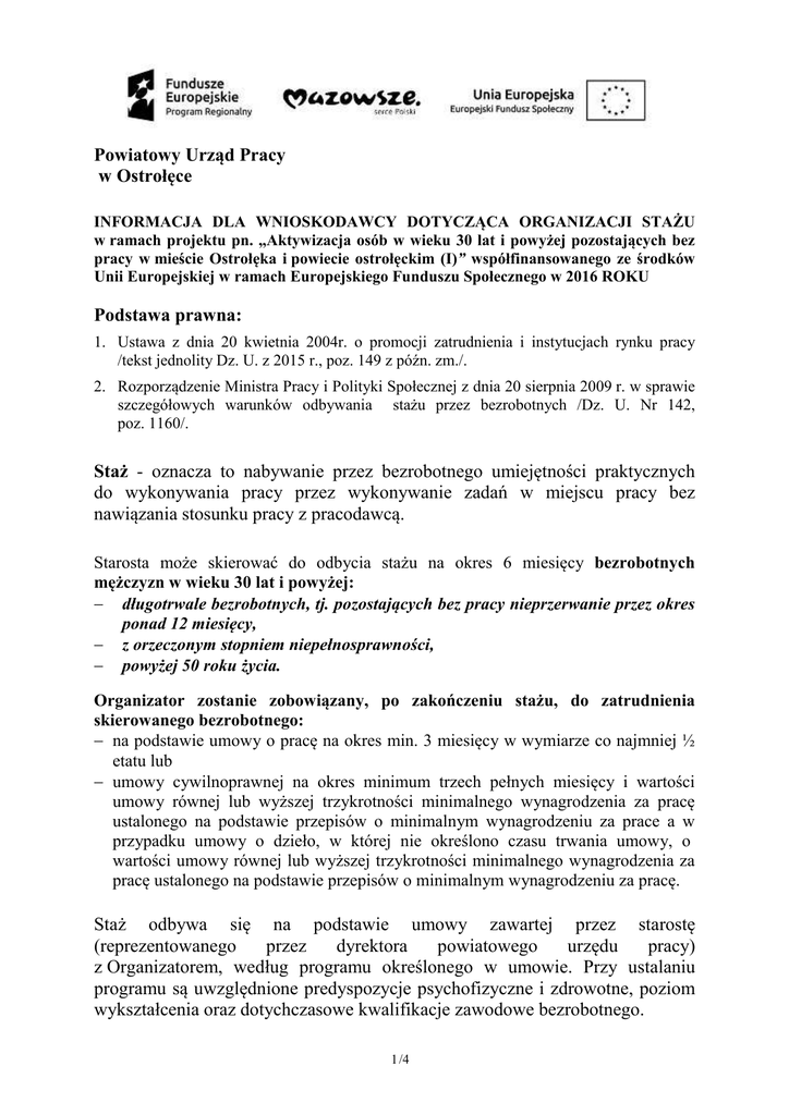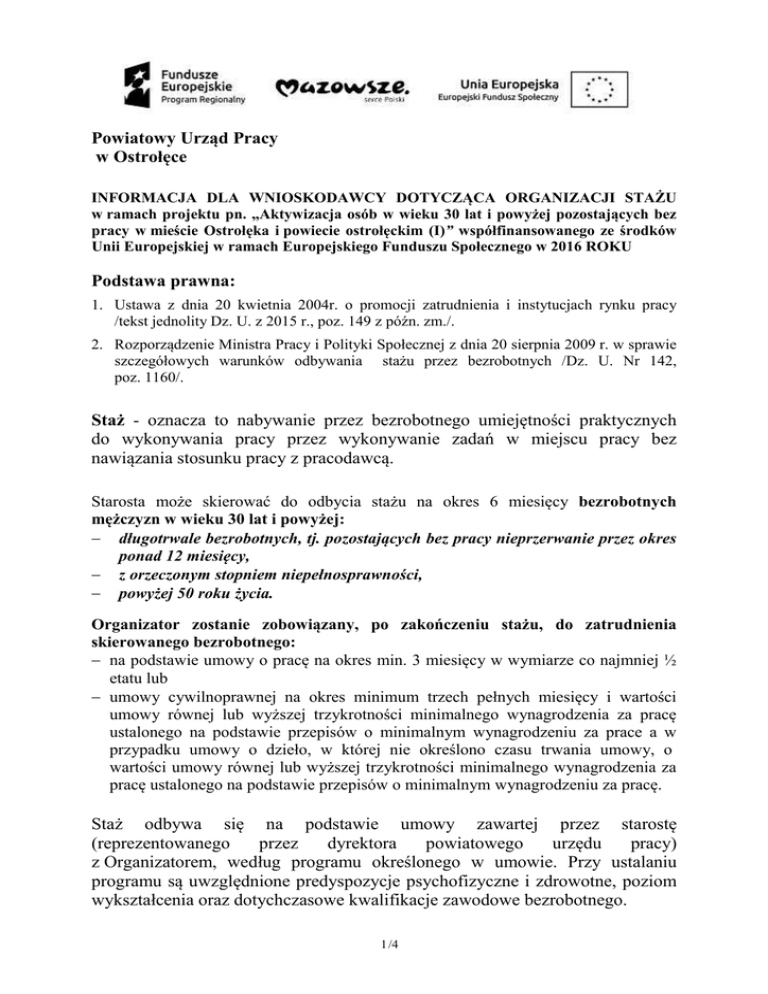 Powiatowy Urząd Pracy w Ostrołęce INFORMACJA DLA WNIOSKODAWCY DOTYCZĄCA ORGANIZACJI STAŻU w ramach projektu pn. „Aktywizacja osób w wieku 30 lat i powyżej pozostających bez pracy w mieście Ostrołęka i powiecie ostrołęckim (I)” współfinansowanego ze środków Unii Europejskiej w ramach Europejskiego Funduszu Społecznego w 2016 ROKU Podstawa prawna: 1. Ustawa z dnia 20 kwietnia 2004r. o promocji zatrudnienia i instytucjach rynku pracy /tekst jednolity Dz. U. z 2015 r., poz. 149 z późn. zm./. 2. Rozporządzenie Ministra Pracy i Polityki Społecznej z dnia 20 sierpnia 2009 r. w sprawie szczegółowych warunków odbywania stażu przez bezrobotnych /Dz. U. Nr 142, poz. 1160/. Staż - oznacza to nabywanie przez bezrobotnego umiejętności praktycznych do wykonywania pracy przez wykonywanie zadań w miejscu pracy bez nawiązania stosunku pracy z pracodawcą. Starosta może skierować do odbycia stażu na okres 6 miesięcy bezrobotnych mężczyzn w wieku 30 lat i powyżej: − długotrwale bezrobotnych, tj. pozostających bez pracy nieprzerwanie przez okres ponad 12 miesięcy, − z orzeczonym stopniem niepełnosprawności, − powyżej 50 roku życia. Organizator zostanie zobowiązany, po zakończeniu stażu, do zatrudnienia skierowanego bezrobotnego: − na podstawie umowy o pracę na okres min. 3 miesięcy w wymiarze co najmniej ½ etatu lub − umowy cywilnoprawnej na okres minimum trzech pełnych miesięcy i wartości umowy równej lub wyższej trzykrotności minimalnego wynagrodzenia za pracę ustalonego na podstawie przepisów o minimalnym wynagrodzeniu za prace a w przypadku umowy o dzieło, w której nie określono czasu trwania umowy, o wartości umowy równej lub wyższej trzykrotności minimalnego wynagrodzenia za pracę ustalonego na podstawie przepisów o minimalnym wynagrodzeniu za pracę. Staż odbywa się na podstawie umowy zawartej przez starostę (reprezentowanego przez dyrektora powiatowego urzędu pracy) z Organizatorem, według programu określonego w umowie. Przy ustalaniu programu są uwzględnione predyspozycje psychofizyczne i zdrowotne, poziom wykształcenia oraz dotychczasowe kwalifikacje zawodowe bezrobotnego. 1 /4 Program powinien określać: 1) nazwę zawodu lub specjalności, której program dotyczy; 2) zakres zadań wykonywanych przez bezrobotnego; 3) rodzaj uzyskiwanych kwalifikacji lub umiejętności zawodowych: 4) sposób potwierdzenia nabytych kwalifikacji lub umiejętności zawodowych: 5) opiekuna osoby objętej programem stażu. Na organizowane miejsca stażu nie będą kierowane osoby, które są współmałżonkiem, zstępnym, wstępnym w linii prostej w pierwszym stopniu pokrewieństwa pracodawcy. Przyjęcie bezrobotnego(ych) w ramach stażu może nastąpić jedynie po podpisaniu umowy z powiatowym urzędem pracy. ♦ U organizatora stażu, który jest pracodawcą, staż mogą odbywać jednocześnie bezrobotni w liczbie nieprzekraczającej liczby pracowników zatrudnionych u organizatora w dniu składania wniosku w przeliczeniu na pełny wymiar czasu pracy. ♦ U organizatora stażu, który nie jest pracodawcą, staż może odbywać jednocześnie jeden bezrobotny. Bezrobotny stażysta czynności ujęte w opisie zadań wykonuje pod nadzorem wskazanego opiekuna, którego rolą jest udzielanie bezrobotnemu m.in. wskazówek i pomocy w wypełnianiu powierzonych zadań oraz poświadczenie własnym podpisem prawdziwości informacji zawartych w sprawozdaniu bezrobotnego z przebiegu stażu. Opiekun bezrobotnego odbywającego staż może jednocześnie sprawować opiekę nad nie więcej niż 3 osobami bezrobotnymi odbywającymi staż. ♦ Czas pracy bezrobotnego odbywającego staż nie może przekraczać 8 godzin na dobę i 40 godzin tygodniowo a bezrobotnego będącego osobą niepełnosprawną zaliczoną do znacznego lub umiarkowanego stopnia niepełnosprawności - 7 godzin na dobę i 35 godzin tygodniowo. ♦ Bezrobotny nie może odbywać stażu w niedziele i święta, w porze nocnej, w systemie pracy zmianowej ani w godzinach nadliczbowych. Na wniosek bezrobotnego odbywającego staż Organizator jest obowiązany do udzielenia dni wolnych w wymiarze 2 dni za każde 30 dni kalendarzowych odbywania stażu. Za dni wolne przysługuje stypendium. Za ostatni miesiąc odbywania stażu pracodawca jest obowiązany udzielić dni wolnych przed upływem terminu zakończenia stażu. Nadzór nad odbywaniem stażu przez bezrobotnego sprawuje starosta. 2 /4 Organizator po zakończeniu realizacji programu wydaje opinię zawierającą informacje o zadaniach realizowanych przez bezrobotnego i umiejętnościach praktycznych pozyskanych w trakcie stażu. Bezrobotny po zakończeniu stażu sporządza sprawozdanie z przebiegu stażu zawierające informacje o wykonywanych zadaniach oraz uzyskanych kwalifikacjach lub umiejętnościach zawodowych. Po otrzymaniu opinii i sprawozdania bezrobotnego z odbycia stażu Starosta wydaje bezrobotnemu zaświadczenie o odbyciu stażu. W okresie odbywania stażu bezrobotnemu przysługuje stypendium płatne przez powiatowy urząd pracy (na dzień 01.01.2016 r. wysokość stypendium wynosi – 997,40 zł brutto). Uprawniony podmiot (zwany Organizatorem) zamierzający zorganizować staż dla bezrobotnych składa w powiatowym urzędzie pracy wniosek o zawarcie umowy o zorganizowanie stażu dla bezrobotnych. Wniosek o zawarcie umowy o zorganizowanie stażu może złożyć: − Pracodawca, tj. jednostka organizacyjna, chociażby nie posiadała osobowości prawnej, a także osoba fizyczna, jeżeli zatrudniają one co najmniej jednego pracownika, − Przedsiębiorca, niezatrudniający pracownika na zasadach przewidzianych dla pracodawców, − Pełnoletnia osoba fizyczna, zamieszkująca i prowadząca na terytorium RP, osobiście i na własny rachunek, działalność w zakresie produkcji roślinnej lub zwierzęcej, w tym ogrodniczej, sadowniczej, pszczelarskiej i rybnej, w pozostającym w jej posiadaniu gospodarstwie rolnym obejmującym obs