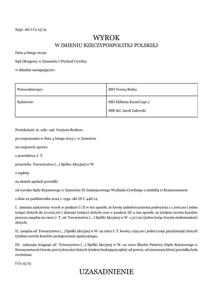 Sygn. akt I Ca 15/15 WYROK W IMIENIU RZECZYPOSPOLITEJ POLSKIEJ Dnia 4 lutego 2015r. Sąd Okręgowy w Zamościu I Wydział Cywilny w składzie następującym : Przewodniczący: SSO Teresa Bodys Sędziowie: SSO Elżbieta Koszel (spr.) SSR del. Jacek Zalewski Protokolant: st. sekr. sąd. Grażyna Rozkres po rozpoznaniu w dniu 4 lutego 2015 r. w Zamościu na rozprawie sprawy z powództwa J. T. przeciwko Towarzystwu (...) Spółce Akcyjnej w W. o zapłatę na skutek apelacji powódki od wyroku Sądu Rejonowego w Zamościu IX Zamiejscowego Wydziału Cywilnego z siedzibą w Krasnymstawie z dnia 22 października 2014 r. sygn. akt IX C 448/14 I. zmienia zaskarżony wyrok w punkcie I i II w ten sposób, że kwotę zadośćuczynienia podwyższa z 1.000,00 ( jeden tysiąc) złotych do 10.000,00 ( dziesięć tysięcy) złotych oraz w punkcie III w ten sposób, że tytułem zwrotu kosztów procesu zasądza na rzecz J. T. od Towarzystwa (...) Spółki Akcyjnej w W. 1.317,00 (jeden tysiąc trzysta siedemnaście) złotych; II. zasądza od Towarzystwa (...) Spółki Akcyjnej w W. na rzecz J. T. kwotę 1.050,00 ( jeden tysiąc pięćdziesiąt) złotych tytułem zwrotu kosztów postępowania apelacyjnego; III. nakazuje ściągnąć od Towarzystwa (...) Spółki Akcyjnej w W. na rzecz Skarbu Państwa (Sądu Rejonowego w Krasnymstawie) kwotę 400 (czterysta) złotych tytułem brakującej opłaty od pozwu, od uiszczenia której powódka była zwolniona. I Ca 15/15 UZASADNIENIE Wyrokiem z dnia 22 października 2014 r. Sąd Rejonowy w Zamościu IX Zamiejscowy Wydział Cywilny z siedzibą w Krasnymstawie zasądził od Towarzystwa (...) Spółki Akcyjnej w W. na rzecz J. T. tytułem zadośćuczynienia kwotę 1 000 zł z ustawowymi odsetkami od dnia 1 marca 2014 r. do dnia zapłaty, w pozostałym zakresie powództwo oddalił, a koszty procesu między stronami wzajemnie zniósł. Sąd Rejonowy ustalił, że dziadek powódki (z linii macierzystej) C. S. w dniu 25 lutego 2005 r. został potrącony na przejściu dla pieszych przez samochód osobowy F. (...) kierowany przez A. Z. i na skutek odniesionych obrażeń zmarł następnego dnia. Powódka pozostawała w bliskich relacjach z dziadkiem, który w dzieciństwie spędzał z nią czas, udzielał rad i pomocy w nauce. Po zawarciu związku małżeńskiego powódka z mężem zamieszkała u dziadka C. S.. J. T. z mężem i dzieckiem zajmowali samodzielną część domu, a drugą część zajmował dziadek z żoną i synem. Dziadek wspierał powódkę finansowo, pomagał w wychowaniu jej córki, służył radą w podejmowaniu decyzji życiowych. Nagła śmierć dziadka spowodowała u powódki negatywne przeżycia emocjonalne, stała się przyczyną rozpaczy, smutku, trudności ze snem, niestabilności emocjonalnej. Pomimo upływu 9 lat od śmierci dziadka J. T. odczuwa jego brak w swoim życiu. W 2008 r. przyjmowała ona leki ziołowe, celem ustabilizowania swojego stanu emocjonalnego. W chwili śmierci dziadka powódka była osobą bezrobotną, rodzina utrzymywała się z dochodów męża J. T.. Obecnie powódka podjęła prace w charakterze doradcy finansowego i osiąga wynagrodzenie w wysokości 400 zł brutto. Taki stan faktyczny Sąd Rejonowy ustalił na podstawie dowodów z dokumentów, zeznań powódki oraz świadków A. K. i Z. T., uznając je za wiarygodne. Sąd Rejonowy dokonał następującej oceny prawnej. Odpowiedzialność pozwanej Spółki ma podstawę prawną w art. 436 § 1 k.c. w zw. z art. 34 ust. 1 ustawy z dnia 22 maja 2003 r. o ubezpieczeniach obowiązkowych, Ubezpieczeniowym Funduszu Gwarancyjnym i Polskim Biurze Ubezpieczycieli Komunikacyjnych (Dz.U. Nr 124, poz. 1152, ze zm.). Niesporną między stronami była kwestia odpowiedzialności kierowcy pojazdu objętego polisą ubezpieczeniową OC u pozwanej Spółki. Nie jest przez stronę pozwaną kwestionowana okoliczność istnienia między powódką a dziadkiem C. S. więzi emocjonalnych dających podstawę do uznania, iż zmarły był osobą bliską powódki. Powołując się na ugruntowane poglądy wyrażone w judykaturze Sąd I instancji uznał, że śmierć osoby bliskiej, jaką był dla powódki dziadek, naruszyła jej dobra osobiste, przez zerwanie więzi rodzinnej, co na mocy art. 448 k.c. w zw. z art. 24 § 1 k.c. uzasadnia przyznanie jej zadośćuczynienia pieniężnego za doznaną krzywdę. Zadośćuczynienie należne osobie bliskiej poszkodowanej deliktem ma na celu złagodzenie doznanych cierpień. Wysokość zadośćuczynienia musi zatem pozostawać w zależności od intensywności tych cierpień, czasu ich trwania oraz ujemnych skutków, jakie ta osoba będzie musiała znosić w przyszłości. Kwota zadośćuczynienia zależy od konkretnej sytuacji, jaka panowała w rodzinie przed śmiercią osoby bliskiej i jakiej można by się spodziewać, gdyby do tej śmierci nie doszło. Oceniając wysokość zadośćuczynienia należnego powódce od pozwanej Sąd Rejonowy miał na uwadze okoliczność, że w chwili śmierci dziadka była ona osobą dorosłą, zamężną, posiadającą dziecko. Prowadziła wraz z mężem oddzielne gospodarstwo domowe, pomimo zamieszkiwania w tym samym budynku, co zmarły. Dziadek nie był więc dla niej jedyną i najważniejszą osobą, w której znajdowała oparcie. Śmierć dziadka była dla powódki trudnym przeżyciem, jednak jej cierpienia nie przekroczyły przeciętnej miary, a żałoba nie przekroczyła cech patologicznych. Strata dziadka, jakkolwiek bolesna dla powódki, nie mogła w istotny sposób wpłynąć na jej sytuację ekonomiczną, bowiem J. T. była i jest osobą zdolną do pracy. Twierdzenia powódki, że do chwili obecnej nie pogodziła się ze śmiercią swego dziadka mają charakter wyolbrzymiony, nieadekwatny do rzeczywistych przeżyć. Powódka nie podejmowała leczenia po śmierci dziadka i brak jest jednoznacznych dowodów, że pogorszenie jej stanu zdrowia w 2008 r. (po upływie trzech lat od śmierci dziadka) pozostawało w związku pr