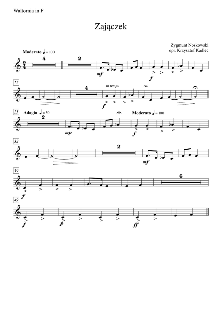 Waltornia in F Zajączek Zygmunt Noskowski opr. Krzysztof Kadlec Moderato q = 100 12 25 32 39 49 in tempo Adagio q = 50 rit. Moderato q = 100