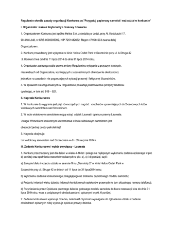 Regulamin określa zasady organizacji Konkursu pn.”Przygotuj papierowy samolot i weź udział w konkursie” I. Organizator i zakres terytorialny i czasowy Konkursu 1. Organizatorem Konkursu jest spółka Helios S.A. z siedzibą w Łodzi, przy Al. Kościuszki 17, 90-418 Łódź, nr KRS 0000005092, NIP 7251482632, Regon 471544933 zwana dalej Organizatorem. 2. Konkurs prowadzony jest wyłącznie w kinie Helios Outlet Park w Szczecinie przy ul. A.Struga 42 .3. Konkurs trwa od dnia 11 lipca 2014 do dnia 31 lipca 2014 roku. 4. Organizator zastrzega sobie prawo zmiany Regulaminu wyłącznie z przyczyn istotnych, niezależnych od Organizatora, wynikających z uzasadnionych obiektywnie okoliczności, jednakże na zasadach nie pogorszających sytuacji prawnej i faktycznej Uczestników. 5. W sprawach nieuregulowanych w Regulaminie posiadają zastosowanie przepisy Kodeksu cywilnego, w tym art. 919 – 921. II. Nagroda Konkursowa 1. W Konkursie do wygrania jest pięć równorzędnych nagród: voucherów uprawniających do 2-osobowych lotów widokowych samolotem nad Szczecinem. 2. W locie widokowym samolotem mogą wziąć udział: Laureat i opiekun prawny Laureata. Uwaga! Warunkiem koniecznym uczestnictwa w locie widokowym samolotem jest obecność jednej osoby pełnoletniej! 3. Nagroda obejmuje: Lot widokowy samolotem nad Szczecinem w dn. 09 sierpnia 2014 r. III. Zadanie Konkursowe i wybór zwycięzcy - Laureata 1. Konkurs przeznaczony jest dla dzieci w wieku 4-16 lat i polega na najlepszym wykonaniu zadania opisanego w pkt. b) poniżej oraz spełnieniu warunków opisanych w pkt: a), c) i d) poniżej, czyli: a) Zakupie biletu i wzięciu udziału w seansie filmu „Samoloty 2” w kinie Helios Outlet Park w Szczecinie przy ul. Struga 42 w dniach od 11 lipca do 31 lipca2014 roku; b) Wykonaniu zadania konkursowego polegającego na zrobieniu papierowego modelu samolotu; c) Podaniu imienia i wieku dziecka i danych kontaktowych opiekunów prawnych (w tym aktualnego numeru telefonu); d) Przyniesieniu przez Opiekuna prawnego dziecka gotowego modelu samolotu do biura rezerwacji kina do dnia 31 lipca 2014roku. wraz z podpisanymi oświadczeniami, opisanymi w pkt. 6 poniżej. 2. Zadanie konkursowe wykonuje dziecko, natomiast czynności wymagane do zgłoszenia udziału i złożenie oświadczeń opisanych niżej wykonuje opiekun prawny dziecka. Celem rozstrzygnięcia Konkursu i przyznania nagród zostanie powołana przez Organizatora Komisja Konkursowa (Jury), która wybierze 5 najbardziej kreatywnych i twórczych prac w kategoriach wiekowych: a) 4-6 lat b) 7-8 lat c) 9-10 lat d) 11-13 lat e) 14-16 lat 3. Organizator wyłoni w dniu 1-2 sierpnia 2014 roku 5 zwycięzców Konkursu – Laureatów. 4. Opiekunowie prawni Laureatów Konkursu zostaną powiadomieni o wynikach Konkursu drogą telefoniczną w terminie do 04 sierpnia 2014 roku, do godz. 15:00. 5. Opiekunowie prawni Laureatów Konkursu odbiorą nagrody w postaci vouchera na 2-osobowy lot widokowy samolotem nad Szczecinem w biurze rezerwacji kina do dnia 07 sierpnia do godz.15:00. 6. Warunkiem udziału w konkursie jest jest podpisanie przez opiekuna prawnego Laureata oświadczeń o treści następującej: „Ja niżej podpisany/a (imię i nazwisko) jako opiekun prawny (należy wskazać stosunek prawny: np. rodzic, opiekun, itp.) niepełnoletniego (należy wskazać dane Uczestnika): Wyrażam zgodę na udział (dane uczestnika) w Konkursie o nazwie: „Samoloty 2 ”, znam treść Regulaminu Konkursu i akceptuję w pełni jego treść i warunki. Wyrażam zgodę na i upoważniam Organizatora do przetwarzania danych osobowych moich i (dane uczestnika) na zasadach wskazanych w Regulaminie, dla celów realizacji Konkursu.” 7. Warunkiem odbioru nagrody – vouchera na lot widokowy nad Szczecinem, przez Uczestnika jest stawienie się Uczestnika celem odbioru nagrody wraz z opiekunem prawnym, lub samego opiekuna prawnego. 8. Nadzór nad Laureatami podczas odbioru nagrody sprawuje ich opiekun prawny. Wszelką i wyłączną odpowiedzialność związaną z realizacją nagrody ponosi Aeroklub Szczeciński– Realizator lotów. Opiekun prawny dziecka jest zobowiązany do ustalenia z Realizatorem lotów wszelkich szczegółów dotyczących lotu, i bezwzględnie podporządkować się jego poleceniom w zakresie bezpieczeństwa. Opiekun prawny dziecka jest zobowiązany poinformować Realizatora lotów o wszelkich okolicznościach stanowiących przeciwwskazania do odbycia lotu przez dziecko i pełnoletniego uczestnika, Realizator lotu ma prawo odmówić lotu w razie uznania iż są ku temu przeciwwskazania. W takiej sytuacji uczestnikowi nie przysługuje prawo do innej nagrody. Organizator nie ponosi odpowiedzialności za uczestników lotu. 9. Wyniki Konkursu zostaną opublikowane na stronie www.helios.pl najpóźniej w dniu 4 Sierpnia 2014 r. IV. Warunki uczestnictwa w Konkursie 1. Uczestnikami Konkursu mogą być konsumenci, osoby fizyczne, które ukończyły 4 rok życia, zamieszkałe na terytorium Rzeczypospolitej Polskiej, spełniające warunki określone w Regulaminie. i tylko za zgodą swoich rodziców lub opiekunów prawnych, dostarczoną w formie pismenej, najpóźniej przy dostarczeniu modelu samolotu. 2. Uczestnikami Konkursu nie mogą być pracownicy Organizatora, jak również ich małżonkowie, dzieci, rodzice oraz rodzeństwo. Uczestnikami Konkursu nie mogą być osoby, które nie ukończyły 4 roku życia. 3. Uczestnikami Konkursu mogą być wyłącznie osoby, które zakupią bilet na pokaz filmu „Samoloty 2” odbywający się w kinie sieci Helios Outlet Park w Szczecinie przy ul. Struga 42 w dniach 18 lipca 2014 r. – 31 lipca 2014 r. , zrobią papierowy model Samolotu, przyniosą pracę wraz z danymi kontaktowymi do biura rezerwacji kina do dnia 31 lipca 2014 roku. 4. Przystąpienie do Konkursu jest równoznaczne z akceptacją przez uczestnika Regulaminu w całości. Uczestnik zobowiązuje się do przestrzegania określonych w nim zasad, jak również p