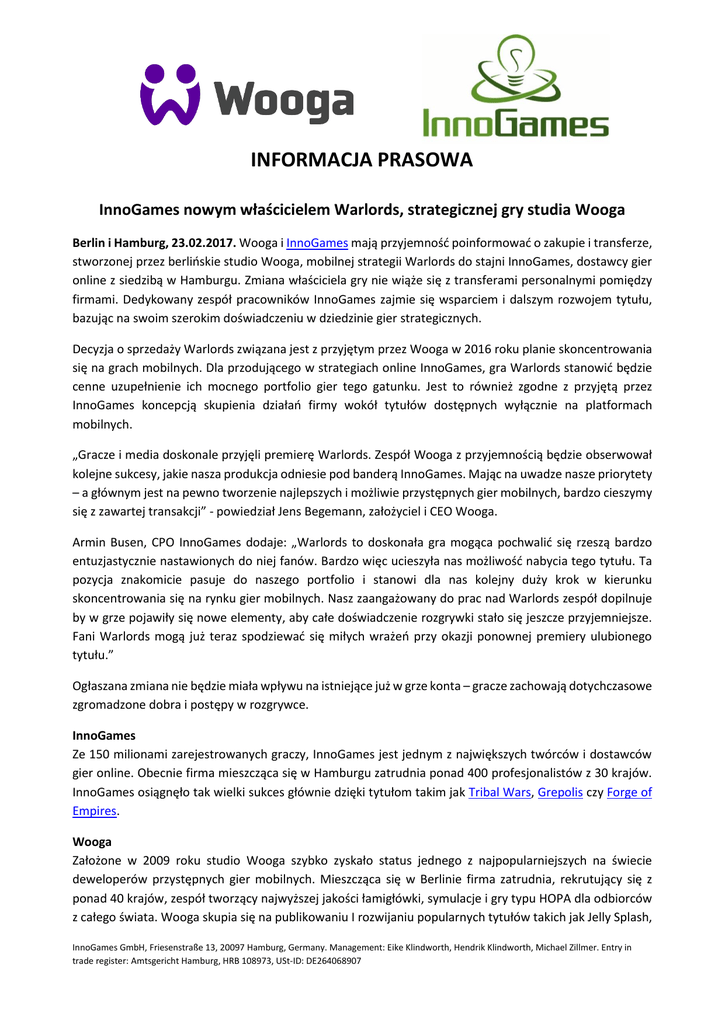 INFORMACJA PRASOWA InnoGames nowym właścicielem Warlords, strategicznej gry studia Wooga Berlin i Hamburg, 23.02.2017. Wooga i InnoGames mają przyjemność poinformować o zakupie i transferze, stworzonej przez berlińskie studio Wooga, mobilnej strategii Warlords do stajni InnoGames, dostawcy gier online z siedzibą w Hamburgu. Zmiana właściciela gry nie wiąże się z transferami personalnymi pomiędzy firmami. Dedykowany zespół pracowników InnoGames zajmie się wsparciem i dalszym rozwojem tytułu, bazując na swoim szerokim doświadczeniu w dziedzinie gier strategicznych. Decyzja o sprzedaży Warlords związana jest z przyjętym przez Wooga w 2016 roku planie skoncentrowania się na grach mobilnych. Dla przodującego w strategiach online InnoGames, gra Warlords stanowić będzie cenne uzupełnienie ich mocnego portfolio gier tego gatunku. Jest to również zgodne z przyjętą przez InnoGames koncepcją skupienia działań firmy wokół tytułów dostępnych wyłącznie na platformach mobilnych. „Gracze i media doskonale przyjęli premierę Warlords. Zespół Wooga z przyjemnością będzie obserwował kolejne sukcesy, jakie nasza produkcja odniesie pod banderą InnoGames. Mając na uwadze nasze priorytety – a głównym jest na pewno tworzenie najlepszych i możliwie przystępnych gier mobilnych, bardzo cieszymy się z zawartej transakcji” - powiedział Jens Begemann, założyciel i CEO Wooga. Armin Busen, CPO InnoGames dodaje: „Warlords to doskonała gra mogąca pochwalić się rzeszą bardzo entuzjastycznie nastawionych do niej fanów. Bardzo więc ucieszyła nas możliwość nabycia tego tytułu. Ta pozycja znakomicie pasuje do naszego portfolio i stanowi dla nas kolejny duży krok w kierunku skoncentrowania się na rynku gier mobilnych. Nasz zaangażowany do prac nad Warlords zespół dopilnuje by w grze pojawiły się nowe elementy, aby całe doświadczenie rozgrywki stało się jeszcze przyjemniejsze. Fani Warlords mogą już teraz spodziewać się miłych wrażeń przy okazji ponownej premiery ulubionego tytułu.” Ogłaszana zmiana nie będzie miała wpływu na istniejące już w grze konta – gracze zachowają dotychczasowe zgromadzone dobra i postępy w rozgrywce. InnoGames Ze 150 milionami zarejestrowanych graczy, InnoGames jest jednym z największych twórców i dostawców gier online. Obecnie firma mieszcząca się w Hamburgu zatrudnia ponad 400 profesjonalistów z 30 krajów. InnoGames osiągnęło tak wielki sukces głównie dzięki tytułom takim jak Tribal Wars, Grepolis czy Forge of Empires. Wooga Założone w 2009 roku studio Wooga szybko zyskało status jednego z najpopularniejszych na świecie deweloperów przystępnych gier mobilnych. Mieszcząca się w Berlinie firma zatrudnia, rekrutujący się z ponad 40 krajów, zespół tworzący najwyższej jakości łamigłówki, symulacje i gry typu HOPA dla odbiorców z całego świata. Wooga skupia się na publikowaniu I rozwijaniu popularnych tytułów takich jak Jelly Splash, InnoGames GmbH, Friesenstraße 13, 20097 Hamburg, Germany. Management: Eike Klindworth, Hendrik Klindworth, Michael Zillmer. Entry in trade register: Amtsgericht Hamburg, HRB 108973, USt-ID: DE264068907 Pearl’s Peril czy Diamond Dash. Ostatio wydaną produkcją Wooga jest Bubble Island 2 na iOS i Android. Więcej na temat Wooga: www.wooga.com. Kontakt prasowy: Mariusz Pietraszek E-Mail: [email protected] Telefon: +48 502 046 679 InnoGames GmbH, Friesenstraße 13, 20097 Hamburg, Germany. Management: Eike Klindworth, Hendrik Klindworth, Michael Zillmer. Entry in trade register: Amtsgericht Hamburg, HRB 108973, USt-ID: DE264068907