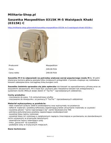 Militaria-Shop.pl Saszetka Maxpedition 0315K M-5 Waistpack Khaki (0315K) C http://militaria-shop.pl/produkt/saszetka-maxpedition-0315k-m-5-waistpack-khaki-0315k-c Producent Maxpedition Cena 249.00 PLN Cena netto 249.00 PLN Saszetka M-5 to odpowiedź na potrzebę większej wersji popularnego modu M-1. W pełni otwierana komora główna posiada kilka mniejszych przegródek. Z przodu znajduje się rozkładana kieszeń zabezpieczona rozciągliwą linką bungee cord. Saszetka świetnie sprawdza się jako apteczka lub kieszeń na aparat/kamerę cyfrową wraz ze wszystkimi akcesoriami. M-5 może być używana jako niezależna kieszeń lub zintegrowana z systemem ALICE /MOLLE dzięki dwóm 5" TacTie™ (sprzedawanych oddzielnie). Cechy produktu: - mocowanie do pasa: 7,6 centymetrowa szlufka - mocowanie do ekwipunku: za pomocą 5" TacTie™ (sprzedawanych oddzielnie) Materiał wykorzystany w produkcie: - lekki materiał Cordura 1000-D wodoodporny oraz wytrzymały na przetarcia - teflon® materiał z powłoką teflonową zapewniającą łatwe utrzymanie materiału w czystości - wysokiej jakości “samo naprawiające się” zamki błyskawiczne YKK - potrójna poliuretanowa powłoka zapewniająca wodoodporność - wysokiej klasy taśmy nylonowe - wysokiej klasy nić nylonowa o zwiększonym napięciu (mocniejsza w porównaniu ze standardowymi nićmi używanymi w przemyśle tekstylnym) - wewnętrzne taśmy osłaniające szwy - linka „paracord” na suwakach - podwójne szwy w krytycznych miejscach. Dane techniczne: Strona 1 z 2 Kolor: khaki Wymiary komory głównej: 180 mm x 127 mm x 63 mm Wymiary kieszeni frontowej: 152 mm x 114 mm x 102 mm Producent: Maxpedition, USA Strona 2 z 2