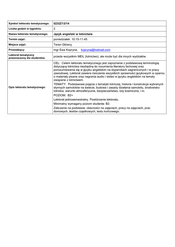 Symbol lektoratu tematycznego: 023/Z/13/14 Liczba godzin w tygodniu: 2 Nazwa lektoratu tematycznego: Język angielski w lotnictwie Termin zajęć: poniedziałek 10:15-11:45 Miejsce zajęć: Teren Główny Prowadzący: mgr Ewa Kopryna, Lektorat tematyczny przeznaczony dla studentów: przede wszystkim MEiL (lotnictwo), ale może być dla innych wydziałów. Opis lektoratu tematycznego: CEL: Celem lektoratu tematycznego jest zapoznanie z podstawową terminologią dotyczącą lotnictwa niezbędną do rozumienia literatury fachowej oraz porozumiewania się w języku angielskim na stypendiach zagranicznych i w pracy zawodowej. Lektorat zawiera ćwiczenie wszystkich sprawności językowych w oparciu o materiały pisane oraz nagrania audio i wideo w języku angielskim na tematy związane z lotnictwem. TEMATY: Podstawowe pojęcia z tematyki lotniczej, historia i konstrukcja wybranych słynnych samolotów na świecie, budowa i zasady działania samolotu, środowisko lotniska, warunki atmosferyczne, bezpieczeństwo, loty kosmiczne, i in. POZIOM: B2+ Lektorat jednosemestralny. Powtórzenie lektoratu. Minimalny wymagany poziom studenta: B2. Zaliczenie na podstawie: obecności na zajęciach, pracy na zajęciach, prac domowych, testów cząstkowych, testu końcowego. [email protected]
