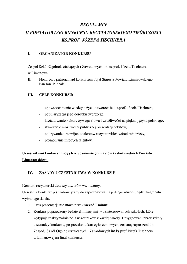 REGULAMIN II POWIATOWEGO KONKURSU RECYTATORSKIEGO TWÓRCZOŚCI KS.PROF. JÓZEFA TISCHNERA I. ORGANIZATOR KONKURSU Zespół Szkół Ogólnokształcących i Zawodowych im.ks.prof. Józefa Tischnera w Limanowej. II. Honorowy patronat nad konkursem objął Starosta Powiatu Limanowskiego Pan Jan Puchała. III. CELE KONKURSU: - upowszechnienie wiedzy o życiu i twórczości ks.prof. Józefa Tischnera, - popularyzacja jego dorobku twórczego, - kształtowanie kultury żywego słowa i wrażliwości na piękno języka polskiego, - stwarzanie możliwości publicznej prezentacji tekstów, - odkrywanie i rozwijanie talentów recytatorskich wśród młodzieży, - promowanie młodych talentów. Uczestnikami konkursu mogą być uczniowie gimnazjów i szkół średnich Powiatu Limanowskiego. IV. ZASADY UCZESTNICTWA W KONKURSIE Konkurs recytatorski dotyczy utworów ww. twórcy. Uczestnik konkursu jest zobowiązany do zaprezentowania jednego utworu, bądź fragmentu wybranego dzieła. 1. Czas prezentacji nie może przekraczać 7 minut. 2. Konkurs poprzedzony będzie eliminacjami w zainteresowanych szkołach, które wytypują maksymalnie po 3 uczestników z każdej szkoły. Desygnowani przez szkoły uczestnicy konkursu, po przesłaniu kart zgłoszeniowych, zostaną zaproszeni do Zespołu Szkół Ogólnokształcących i Zawodowych im.ks.prof.Józefa Tischnera w Limanowej na finał konkursu. 3. Rywalizacja będzie odbywać się w dwóch kategoriach: 1- gimnazjum, 2- szkoły ponadgimnazjalne. 4. Prezentacje konkursowe oceniane będą przez specjalnie powołaną Komisję Konkursową. Jury w ocenie będzie brało pod uwagę: dobór tekstu, zrozumienie treści, poprawność dykcji, prawidłową interpretację, ogólny wyraz artystyczny. 5. Osoby biorące udział w konkursie powinny wypełnić kartę zgłoszeniową i przesłać na adres pocztowy szkoły z dopiskiem „Konkurs Recytatorski” (Zespół Szkół Ogólnokształcących i Zawodowych im.ks.prof. Józefa Tischnera w Limanowej ul. Jana Pawła II 42a, 34-600 Limanowa). Kartę zgłoszeniową można również wypełnić elektronicznie ( jest ona zamieszczona na stronie www.tischner.limanowa.edu.pl ) i przesłać mailowo na adres [email protected] Termin nadsyłania zgłoszeń do 10 marca 2013 r. Finał konkursu planujemy przeprowadzić w drugiej połowie marca 2013r. 6. Ogłoszenie wyników i przyznanie nagród odbędzie się bezpośrednio po zakończeniu prezentacji. 7. Za najlepsze prezentacje organizator przewiduje przyznanie za zajęcie miejsc od I-III , w każdej grupie wiekowej, dyplomów oraz nagród rzeczowych. Na wniosek Jury Konkursu liczba przyznanych nagród może ulec zmianie. Wszelkie informacje o konkursie można uzyskać pod numerem telefonu (018 ) 3371886 oraz pisząc na adres [email protected] ZAPRASZAMY DO UDZIAŁU !!!