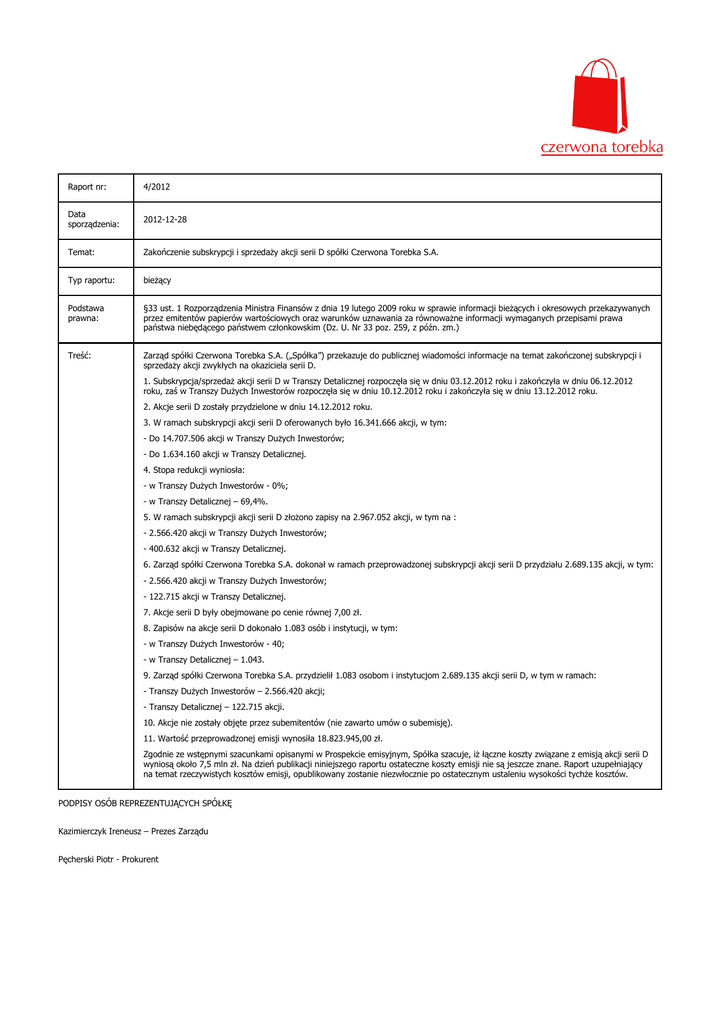 Raport nr: 4/2012 Data sporządzenia: 2012-12-28 Temat: Zakończenie subskrypcji i sprzedaży akcji serii D spółki Czerwona Torebka S.A. Typ raportu: bieżący Podstawa prawna: §33 ust. 1 Rozporządzenia Ministra Finansów z dnia 19 lutego 2009 roku w sprawie informacji bieżących i okresowych przekazywanych przez emitentów papierów wartościowych oraz warunków uznawania za równoważne informacji wymaganych przepisami prawa państwa niebędącego państwem członkowskim (Dz. U. Nr 33 poz. 259, z późn. zm.) Treść: Zarząd spółki Czerwona Torebka S.A. („Spółka”) przekazuje do publicznej wiadomości informacje na temat zakończonej subskrypcji i sprzedaży akcji zwykłych na okaziciela serii D. 1. Subskrypcja/sprzedaż akcji serii D w Transzy Detalicznej rozpoczęła się w dniu 03.12.2012 roku i zakończyła w dniu 06.12.2012 roku, zaś w Transzy Dużych Inwestorów rozpoczęła się w dniu 10.12.2012 roku i zakończyła się w dniu 13.12.2012 roku. 2. Akcje serii D zostały przydzielone w dniu 14.12.2012 roku. 3. W ramach subskrypcji akcji serii D oferowanych było 16.341.666 akcji, w tym: - Do 14.707.506 akcji w Transzy Dużych Inwestorów; - Do 1.634.160 akcji w Transzy Detalicznej. 4. Stopa redukcji wyniosła: - w Transzy Dużych Inwestorów - 0%; - w Transzy Detalicznej – 69,4%. 5. W ramach subskrypcji akcji serii D złożono zapisy na 2.967.052 akcji, w tym na : - 2.566.420 akcji w Transzy Dużych Inwestorów; - 400.632 akcji w Transzy Detalicznej. 6. Zarząd spółki Czerwona Torebka S.A. dokonał w ramach przeprowadzonej subskrypcji akcji serii D przydziału 2.689.135 akcji, w tym: - 2.566.420 akcji w Transzy Dużych Inwestorów; - 122.715 akcji w Transzy Detalicznej. 7. Akcje serii D były obejmowane po cenie równej 7,00 zł. 8. Zapisów na akcje serii D dokonało 1.083 osób i instytucji, w tym: - w Transzy Dużych Inwestorów - 40; - w Transzy Detalicznej – 1.043. 9. Zarząd spółki Czerwona Torebka S.A. przydzielił 1.083 osobom i instytucjom 2.689.135 akcji serii D, w tym w ramach: - Transzy Dużych Inwestorów – 2.566.420 akcji; - Transzy Detalicznej – 122.715 akcji. 10. Akcje nie zostały objęte przez subemitentów (nie zawarto umów o subemisję). 11. Wartość przeprowadzonej emisji wynosiła 18.823.945,00 zł. Zgodnie ze wstępnymi szacunkami opisanymi w Prospekcie emisyjnym, Spółka szacuje, iż łączne koszty związane z emisją akcji serii D wyniosą około 7,5 mln zł. Na dzień publikacji niniejszego raportu ostateczne koszty emisji nie są jeszcze znane. Raport uzupełniający na temat rzeczywistych kosztów emisji, opublikowany zostanie niezwłocznie po ostatecznym ustaleniu wysokości tychże kosztów. PODPISY OSÓB REPREZENTUJĄCYCH SPÓŁKĘ Kazimierczyk Ireneusz – Prezes Zarządu Pęcherski Piotr - Prokurent