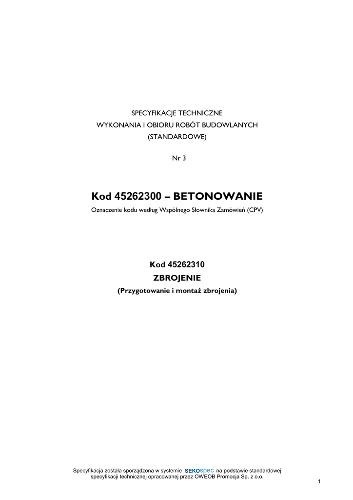 SPECYFIKACJE TECHNICZNE WYKONANIA I OBIORU ROBÓT BUDOWLANYCH (STANDARDOWE) Nr 3 Kod 45262300 – BETONOWANIE Oznaczenie kodu według Wspólnego Słownika Zamówień (CPV) Kod 45262310 ZBROJENIE (Przygotowanie i montaż zbrojenia) Specyfikacja została sporządzona w systemie SEKOspec SEKOspec na podstawie standardowej specyfikacji technicznej OWEOB opracowanej Promocjaprzez Sp. zOWEOB o.o. 2005Promocja Sp. z o.o. 1 SPIS TREŚCI 1. WSTĘP ................................................................................................. 3 1.1. Przedmiot ST .................................................................................... 3 1.2. Zakres stosowania ST .................................................................... 3 1.3. Zakres robót objętych ST ............................................................. 3 1.4. Określenia podstawowe ................................................................ 3 1.5. Ogólne wymagania dotyczące robót .......................................... 3 2. MATERIAŁY ........................................................................................ 3 3. SPRZĘT ................................................................................................ 5 4. TRANSPORT ...................................................................................... 5 5. WYKONANIE ROBÓT .................................................................. 5 6. KONTROLA JAKOŚCI ROBÓT ................................................... 7 7. OBMIAR ROBÓT .............................................................................. 8 8. ODBIÓR ROBÓT ............................................................................. 8 9. PODSTAWA PŁATNOŚCI ............................................................. 9 10. PRZEPISY ZWIĄZANE ................................................................. 9 Najważniejsze oznaczenia i skróty: ST – Specyfikacja Techniczna SST – Szczegółowa Specyfikacja Techniczna ITB – Instytut Techniki Budowlanej PZJ – Program Zabezpieczenia Jakości Specyfikacja została sporządzona w systemie SEKOspec SEKOspec na podstawie standardowej specyfikacji technicznej OWEOB opracowanej Promocjaprzez Sp. zOWEOB o.o. 2005Promocja Sp. z o.o. 2 1. 1.1. WSTĘP Przedmiot ST Przedmiotem niniejszej standardowej specyfikacji technicznej (ST) są wymagania dotyczące wykonania i odbioru zbrojenia betonu w konstrukcjach żelbetowych wykonywanych na mokro w budynkach oraz obiektach budownictwa inżynieryjnego. 1.2. Zakres stosowania ST Specyfikacja techniczna (ST) stanowi podstawę opracowania szczegółowej specyfikacji technicznej (SST) stosowanej jako dokument przetargowy i kontraktowy przy zlecaniu i realizacji robót wymienionych w pkt. 1.1. Znaczy to, iż projektant sporządzający dokumentację projektową i odpowiednie szczegółowe specyfikacje techniczne wykonania i odbioru robót budowlanych może wprowadzać do niniejszej standardowej specyfikacji zmiany, uzupełnienia lub uściślenia, odpowiednie dla przewidzianych projektem robót, uwzględniające wymagania Zamawiającego oraz konkretne warunki realizacji robót, które są niezbędne do określania ich standardu i jakości. Odstępstwa od wymagań podanych w niniejszej specyfikacji mogą mieć miejsce tylko w przypadkach małych prostych robót i konstrukcji drugorzędnych o niewielkim znaczeniu, dla których istnieje pewność, że podstawowe wymagania będą spełnione przy zastosowaniu metod wykonania na podstawie doświadczenia i przy przestrzeganiu zasad sztuki budowlanej. 1.3. Zakres robót objętych ST Ustalenia zawarte w niniejszej Specyfikacji mają zastosowanie przy wykonywaniu zbrojenia konstrukcji budynków oraz obiektów budownictwa inżynieryjnego. Roboty, których dotyczy Specyfikacja, obejmują wszystkie czynności mające na celu wykonanie robót związanych z: – przygotowaniem zbrojenia, – montażem zbrojenia, – kontrolą jakości robót i materiałów. Zakres robót obejmuje elementy konstrukcyjne fundamentów, podpór, murów, konstrukcje szkieletowe, płyty, belki, podciągi, gzymsy oraz konstrukcje związane z wyposażeniem i obsługą obiektów. 1.4. Określenia podstawowe Określenia podane w niniejszej Specyfikacji są zgodne z odpowiednimi normami oraz określeniami podanymi w ST Kod CPV 45000000-7 „Wymagania ogólne”. Pręty stalowe wiotkie – pręty stalowe o przekroju kołowym żebrowane o średnicy do 40 mm. Zbrojenie niesprężajace – zbrojenie konstrukcji betonowej niewprowadzające do niej naprężeń w sposób czynny. 1.5. Ogólne wymagania dotyczące robót Wykonawca robót jest odpowiedzialny za jakość ich wykonania oraz za zgodność z dokumentacją projektową, ST i poleceniami Inspektora nadzoru. Ogólne wymagania dotyczące robót podano w ST Kod CPV 45000000-7. 2. MATERIAŁY Ogólne wymagania dotyczące materiałów, ich pozyskiwania i składowania podano w ST Kod CPV 45000000-7 „Wymagania ogólne” pkt 2. Specyfikacja została sporządzona w systemie SEKOspec SEKOspec na podstawie standardowej specyfikacji technicznej OWEOB opracowanej Promocjaprzez Sp. zOWEOB o.o. 2005Promocja Sp. z o.o. 3 2.1. Stal zbrojeniowa 2.1.1. Asortyment stali zbrojeniowej Do zbrojenia konstrukcji żelbetowych prętami wiotkimi w obiektach budowlanych objętych zakresem kontraktu stosuje się stal klas i gatunków wg dokumentacji projektowej, wg normy PN-H-84023/6: AIIIN, gatunku RB500W/BSt 500S-O.T.B. oraz stal klasy AI, gatunku St3SX-b. 2.1.2. Właściwości mechaniczne i technologiczne stali zbrojeniowej Pręty okrągłe żebrowane ze stali gatunku RB500W/BSt500S-Q.T.B. (Aprobata Techniczna IBDiM Nr AT/2001-041115) o następujących parametrach: – średnica pręta w mm – granica plastyczności Re (min) w MPa 500 – wytrzymałość na rozciąganie Rm (min) w MPa 550 – wytrzymałość charakterystyczna w MPa 490 – wytrzymałość obliczeniowa w MPa 375 – wydłużenie (min) w % – zginanie do kąta 60