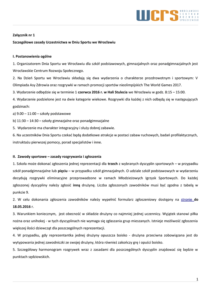 Załącznik nr 1 Szczegółowe zasady Uczestnictwa w Dniu Sportu we Wrocławiu I. Postanowienia ogólne 1. Organizatorem Dnia Sportu we Wrocławiu dla szkół podstawowych, gimnazjalnych oraz ponadgimnazjalnych jest Wrocławskie Centrum Rozwoju Społecznego. 2. Na Dzień Sportu we Wrocławiu składają się dwa wydarzenia o charakterze prozdrowotnym i sportowym: V Olimpiada Asy Zdrowia oraz rozgrywki w ramach promocji sportów nieolimpijskich The World Games 2017. 3. Wydarzenie odbędzie się w terminie 1 czerwca 2016 r. w Hali Stulecia we Wrocławiu w godz. 8:15 – 15:00. 4. Wydarzenie podzielone jest na dwie kategorie wiekowe. Rozgrywki dla każdej z nich odbędą się w następujących godzinach: a) 9.00 – 11:00 – szkoły podstawowe b) 11:30 – 14:30 – szkoły gimnazjalne oraz ponadgimnazjalne 5. Wydarzenie ma charakter integracyjny i służy dobrej zabawie. 6. Na uczestników Dnia Sportu czekać będą dodatkowe atrakcje w postaci zabaw ruchowych, badań profilaktycznych, instruktażu pierwszej pomocy, porad specjalistów i inne. II. Zawody sportowe – zasady rozgrywania i zgłoszenia 1. Szkoła może dokonać zgłoszenia jednej reprezentacji dla trzech z wybranych dyscyplin sportowych – w przypadku szkół ponadgimnazjalne lub pięciu – w przypadku szkół gimnazjalnych. O udziale szkół podstawowych w wydarzeniu decydują rozgrywki eliminacyjne przeprowadzone w ramach Młodzieżowych Igrzysk Sportowych. Do każdej zgłoszonej dyscypliny należy zgłosić inną drużynę. Liczba zgłoszonych zawodników musi być zgodna z tabelą w punkcie 9. 2. W celu dokonania zgłoszenia zawodników należy wypełnić formularz zgłoszeniowy dostępny na stronie do 18.05.2016 r. 3. Warunkiem koniecznym, jest obecność w składzie drużyny co najmniej jednej uczennicy. Wyjątek stanowi piłka nożna oraz unihokej - w tych dyscyplinach nie wymaga się zgłaszania grup mieszanych. Istnieje możliwość zgłoszenia większej ilości dziewcząt dla poszczególnych reprezentacji. 4. W przypadku, gdy reprezentantka jednej drużyny opuszcza boisko - drużyna przeciwna zobowiązana jest do wytypowania jednej zawodniczki ze swojej drużyny, która również zakończy grę i opuści boisko. 5. Szczegółowy harmonogram rozgrywek wraz z zasadami dla poszczególnych dyscyplin znajdować się będzie w punktach sędziowskich. 1 6. Harmonogram Olimpiady: a) Szkoły podstawowe: 8:15 – 8: 50 rejestracja uczestników 8:50 – losowanie kolejności startowej na punktach sędziowskich dla poszczególnych dyscyplin 9:00 - 11:00 – zawody sportowe, „Zbieraj punkty, łap nagrodę” 11.30 - rozdanie nagród zwycięzcom b) Szkoły gimnazjalne i ponadgimnazjalne 10:45 – 11:20 rejestracja uczestników 11:20 – losowanie kolejności startowej na punktach sędziowskich dla poszczególnych dyscyplin 11:30 – 14:30 – zawody sportowe, „Zbieraj punkty, łap nagrodę” 14:30 – 15:00 – rozdanie nagród zwycięzcom 15:00 – zakończenie Dnia Sportu we Wrocławiu 7. Za rozgrzewkę każdej drużyny przed meczem odpowiedzialny jest nauczyciel – opiekun. 8. Medale i/lub nagrody zostaną przyznane trzem najlepszym w klasyfikacji drużynom/zawodnikom, w każdej dyscyplinie, w każdej kategorii wiekowej. 9. Lista dyscyplin sportowych: Lp. Dyscyplina Czas trwania rozgrywek* Liczba zawodników w drużynie Łączna maks. liczba drużyn dla danej dyscypliny SZKOŁY PODSTAWOWE - udziale szkół podstawowych w wydarzeniu decydują rozgrywki eliminacyjne przeprowadzone w ramach Młodzieżowych Igrzysk Sportowych. 1 Przeciąganie liny 9:00 – 11:00 10 2 Speedrower (klasy 4-6) 9:00 – 11:00 2 3 Kręgle (klasy 1-3) 9:00 – 11:00 2 4 Strzały do celu 9:00 – 11:00 3 5 Frisbee rzuty na czas (klasy 4-6) 9:00 – 11:00 4 6 Frisbee rzuty do celu (klasy 1-3) 9:00 – 11:00 4 7 Sumo (klasy 4-6) 9:00 – 11:00 2 8 Tchoukball (klasy 4-6) 9:00 – 11:00 16 2 9 Unihokej slalom na czas (klasy 1-3) 9:00 – 11:00 10 SZKOŁY GIMNAZJALNE 1 Przeciąganie liny 11:30 - 14:30 8 16 2 Unihokej 11:30 - 14:30 5 (w tym 2 rezerwowych) 12 3 Sumo chłopców 11:30 - 14:30 1 16 4 Sumo dziewcząt 11:30 - 14:30 1 16 5 Frisbee – gra do 5 podań 11:30 - 14:30 5 (w tym 2 rezerwowych) 12 6 Bule 11:30 - 14:30 4 16 7 Tchoukball 11:30 - 14:30 7 (w tym 2 rezerwowych) 16 8 Dwa ognie 11:30 - 14:30 9 (w tym 2 rezerwowych) 16 9 Koszykówka (streetball) 11:30 - 14:30 6 (w tym 2 rezerwowych) 16 10 Piłka nożna (street soccer) 11:30 - 14:30 5 (w tym 2 rezerwowych) 16 11 Ringo 11:30 - 14:30 8 (w tym 2 rezerwowych) 16 SZKOŁY PONADGIMNAZJALNE 1 Korfball 11:30 - 14:30 6 (w tym 2 rezerwowe, w tym przynajmniej 2 dziewczyny) 8 2 Ergowiosła 11:30 - 14:30 4 16 3 Przeciąganie liny 11:30 - 14:30 8 16 * Może ulec zmianie III. „Zbieraj punkty, łap nagrodę” - szczegółowe zbierania punktów 1. Uczestnicy Dnia Sportu we Wrocławiu podczas wydarzenia mogą zdobywać punkty (w postaci naklejek) za dodatkowe aktywności zdrowotne, sportowe i inne, oferowane w ramach wybranych stoisk partnerskich. 2. Punkty można zdobywać w specjalnie oznaczonych stoiskach. 3. Punkty za dodatkowe aktywności mogą zbierać uczniowie (zarówno zawodnicy jak i kibice) oraz nauczyciele. 4. Punkty zbierane są na „Karty na punkty” (po 1 sztuce dla każdego zgłoszonego przez szkołę ucznia i nauczyciela), które zostaną rozdane opiekunom podczas rejestracji. 5. Jednej osobie przysługuje jedna Karta, przeznaczona do umieszczania zebranych przez uczestnika punktów. 3 6. Karty nie są imienne, należy jednak wskazać na nich nazwę szkoły, z której pochodzi uczestnik zabawy (patrz punkt IV. Klasyfikacja generalna) 7. Punkty przyznawane będą za wykonanie, określonej na danym stanowisku, aktywności. 8. Punkty zbierane są indywidualnie na konto uczestnika, który po uzbieraniu ich określonej liczby, wskazanej przez Organizatorów wydarzenia, będzie mógł wymienić kartę na nagrodę (w „Punkcie odbioru nagród”). 9. Każdy z uczestników Dnia Sportu w ramach za