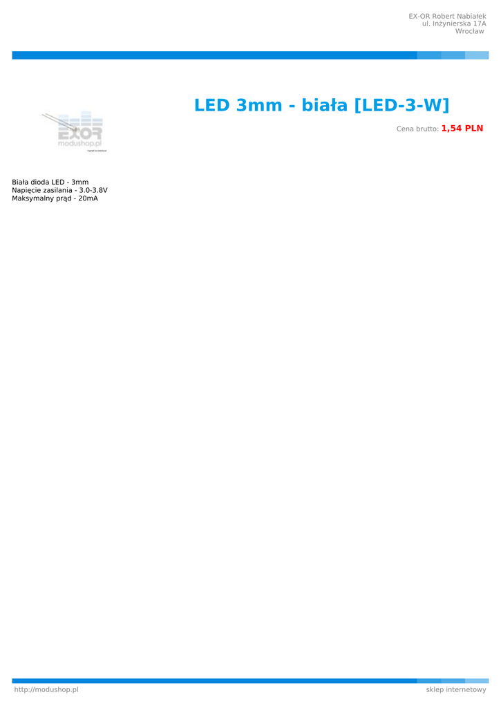 EX-OR Robert Nabiałek ul. Inżynierska 17A Wrocław LED 3mm - biała [LED-3-W] Cena brutto: 1,54 PLN Biała dioda LED - 3mm Napięcie zasilania - 3.0-3.8V Maksymalny prąd - 20mA http://modushop.pl sklep internetowy