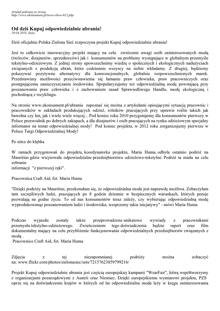 Artykuł pobrany ze strony http://www.ekonsument.pl/news-show-612.php Od dziś Kupuj odpowiedzialnie ubrania! 19.04.2010, Zuza Dziś oficjalnie Polska Zielona Sieć rozpoczyna projekt Kupuj odpowiedzialnie ubrania! Jest to całkowicie innowacyjny projekt mający na celu zwrócenie uwagi osób zainteresowanych modą (twórców, dizajnerów, sprzedawców) jak i konsumentów na problemy występujące w globalnym przemyśle tekstylno-odzieżowym. Z jednej strony upowszechnimy wiedzę o społecznych i ekologicznych nadużyciach związanych z produkcją ubrań, które codziennie wszyscy na siebie wkładamy. Z drugiej, będziemy pokazywać pozytywne alternatywy dla konwencjonalnych, globalnie rozpowszechnionych marek. Przedstawimy możliwości przeciwstawienia się łamaniu praw człowieka, praw pracowniczych oraz postępującemu zanieczyszczaniu środowiska. Spopularyzujemy też odpowiedzialną modę powstającą przy poszanowaniu praw człowieka i z zachowaniem zasad Sprawiedliwego Handlu, modę ekologiczną i pochodzącą z recyklingu. Na stronie www.ekonsument.pl/ubrania zapoznać się można z artykułami opisującymi sytuację pracownic i pracowników w zakładach produkujących odzież, rolników pracujących przy uprawie roślin takich jak bawełna czy len, jak i wiele wiele więcej... Pod koniec roku 2010 przygotujemy dla konsumentów pierwszy w Polsce przewodnik po dobrych zakupach, a dla dizajnerów i osób pracujących na rynku odzieżowym specjalny informator na temat odpowiedzialnej mody! Pod koniec projektu, w 2012 roku zorganizujemy pierwsze w Polsce Targi Odpowiedzialnej Mody! Po nitce do kłębka W ramach przygotowań do projektu, koordynatorka projektu, Maria Huma, odbyła ostatnio podróż na Mauritius gdzie wizytowała odpowiedzialne przedsiębiorstwa odzieżowo-tekstylne. Podróż ta miała na celu zebranie informacji "z pierwszej ręki". Pracownica Craft Aid, fot. Maria Huma "Dzięki podróży na Mauritius, przekonałam się, że odpowiedzialna moda jest naprawdę możliwa. Zobaczyłam tam szczęśliwych ludzi, pracujących po 8 godzin dziennie w bezpiecznych warunkach, których pensje pozwalają na godne życie. To od nas konsumentów teraz zależy, czy wybierając odpowiedzialną modę wyprodukowanąz poszanowaniem ludzi i środowiska, wesprzemy takie inicjatywy" - mówi Maria Huma Podczas wyjazdu zostały także przeprowadzone unikatowe wywiady z pracownikami przemysłu tekstylno-odzieżowego. Zwieńczeniem tego doświadczenia będzie raport oraz film dokumentalny mający na celu przybliżenie funkcjonowania odpowiedzialnych przedsiębiorstw związanych z modą . Pracownice Craft Aid, fot. Maria Huma Zdjęcia z tej niezapomnianej podróży na: www.flickr.com/photos/zielonasiec/sets/72157623859799216/ można zobaczyć Projekt Kupuj odpowiedzialnie ubrania jest częścią europejskiej kampanii "WearFair", którą współtworzymy z organizacjami pozarządowymi z Austrii oraz Niemiec. Dzięki europejskiemu wymiarowi projektu, PZS oprze się na doświadczeniu krajów w których od lat odpowiedzialna moda leży w kręgu zainteresowania rzeszy konsumentów. Wierzymy głęboko, że programy takie jak ten, które mają na celu zbliżenie konsumentów i producentów mogą doprowadzić do sytuacji, gdzie ubrania, które na co dzień kupujemy nie będą okupione łzami, potem i krwią ludzi z krajów mniej rozwiniętych. Kontakt: Zuzanna Zajczenko - promocja, informacje o projekcie Tel. 0-661 797 970 E-mail: [email protected] Maria Huma - informacje merytoryczne, relacje z wizyty w fabrykach odzieżowych na Mauritiusie Tel. 0-607 88 80 82 E-mail: [email protected] www.ekonsument.pl/ubrania * W ramach podróży na Mauritius wizytowaliśmy m.in. fabrykę Craft Aid Mauritius Ltd. Firma zatrudnia ok. 200 pracownic i pracowników, w tym 50 z nich to osoby niepełnosprawne. Draft Aid jest członkiem WFTO (Światowej Organizacji Sprawiedliwego Handlu), ma certyfikat GOTS (Global Organic Textile Standard) świadczący o wysokich standardach środowiskowych oraz certyfikat Fairtrade. Więcej o Craft Aid: www.craftaid.net Patronat nad projektem objęli: PATRONAT MERYTORYCZNY: