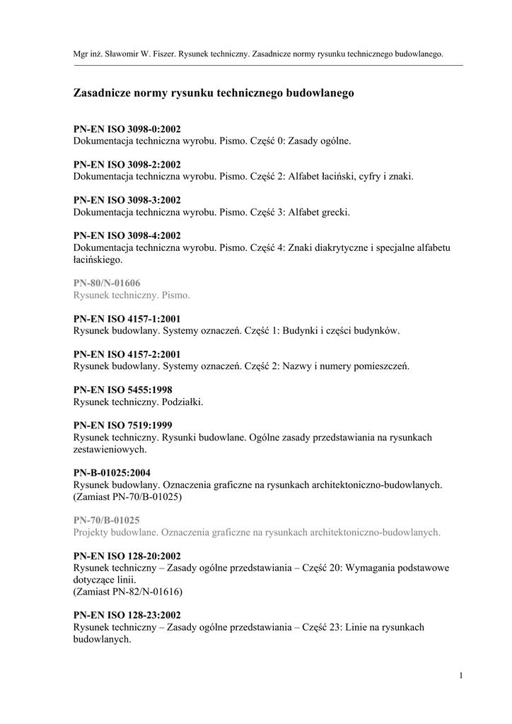 Mgr inż. Sławomir W. Fiszer. Rysunek techniczny. Zasadnicze normy rysunku technicznego budowlanego. Zasadnicze normy rysunku technicznego budowlanego PN-EN ISO 3098-0:2002 Dokumentacja techniczna wyrobu. Pismo. Część 0: Zasady ogólne. PN-EN ISO 3098-2:2002 Dokumentacja techniczna wyrobu. Pismo. Część 2: Alfabet łaciński, cyfry i znaki. PN-EN ISO 3098-3:2002 Dokumentacja techniczna wyrobu. Pismo. Część 3: Alfabet grecki. PN-EN ISO 3098-4:2002 Dokumentacja techniczna wyrobu. Pismo. Część 4: Znaki diakrytyczne i specjalne alfabetu łacińskiego. PN-80/N-01606 Rysunek techniczny. Pismo. PN-EN ISO 4157-1:2001 Rysunek budowlany. Systemy oznaczeń. Część 1: Budynki i części budynków. PN-EN ISO 4157-2:2001 Rysunek budowlany. Systemy oznaczeń. Część 2: Nazwy i numery pomieszczeń. PN-EN ISO 5455:1998 Rysunek techniczny. Podziałki. PN-EN ISO 7519:1999 Rysunek techniczny. Rysunki budowlane. Ogólne zasady przedstawiania na rysunkach zestawieniowych. PN-B-01025:2004 Rysunek budowlany. Oznaczenia graficzne na rysunkach architektoniczno-budowlanych. (Zamiast PN-70/B-01025) PN-70/B-01025 Projekty budowlane. Oznaczenia graficzne na rysunkach architektoniczno-budowlanych. PN-EN ISO 128-20:2002 Rysunek techniczny – Zasady ogólne przedstawiania – Część 20: Wymagania podstawowe dotyczące linii. (Zamiast PN-82/N-01616) PN-EN ISO 128-23:2002 Rysunek techniczny – Zasady ogólne przedstawiania – Część 23: Linie na rysunkach budowlanych. 1 Mgr inż. Sławomir W. Fiszer. Rysunek techniczny. Zasadnicze normy rysunku technicznego budowlanego. PN-82/N-01616 Rysunek techniczny. Linie rysunkowe. (Zamiast PN-70/B-01025 w zakresie p. 2.1.4.) PN-ISO 4069:1999 Rysunek budowlany. Oznaczanie powierzchni na przekrojach i widokach. Zasady ogólne. PN-B-01030:2000 Rysunek budowlany. Oznaczenia graficzne materiałów budowlanych. (Łącznie z normą PN-ISO 4069:1999 zamiast PN-70/B-01030) PN-70/B-01030 Projekty budowlane. Oznaczenia graficzne materiałów budowlanych. PN-B-01029:2000 Rysunek budowlany. Zasady wymiarowania na rysunkach architektoniczno-budowlanych. (Zamiast PN-60/B-01029) PN-60/B-01029 Projekty architektoniczno-budowlane. Wymiarowanie na rysunkach. PN-82/N-01614 Rysunek techniczny. Wymiarowanie. Zasady ogólne. (Zamiast PN-60/B-01029 w zakresie pp. 2.1, 2.2, 2.4, 2.11, 2.12, 2.16.4.) PN-ISO 129:1996 i PN-ISO 129/Ak Rysunek techniczny. Wymiarowanie. Zasady ogólne. Definicje. Metody wykonania i oznaczenia specjalne. (Zamiast PN-82/N-01614 w zakresie zasad porządkowych, sposobów wymiarowania i uproszczeń wymiarowych) PN-ISO 9431:1994 Rysunek budowlany. Części arkusza rysunkowego przeznaczone na rysunek, tekst i tabliczkę tytułową. PN-ISO 7200:1994 Rysunek techniczny. Tabliczki tytułowe. PN-80/N-01612 Rysunek techniczny. Formaty arkuszy. PN-86/N-01603 Rysunek techniczny. Składanie formatów arkuszy. 2 Mgr inż. Sławomir W. Fiszer. Rysunek techniczny. Zasadnicze normy rysunku technicznego budowlanego. PN-B-01040:1994 Rysunek konstrukcyjny budowlany. Zasady ogólne. PN-88/B-01040 Rysunek konstrukcyjny budowlany. Zasady ogólne. PN-88/B-01041 Rysunek konstrukcyjny budowlany. Konstrukcje betonowe, żelbetowe i sprężone. PN-B-01042:1999 Rysunek konstrukcyjny budowlany. Konstrukcje drewniane. PN-64/B-01042 Rysunek konstrukcyjny budowlany. Konstrukcje drewniane. PN-EN ISO 5261:2002 Rysunek techniczny. Przedstawianie uproszczone prętów i kształtowników. (Zamiast PN-ISO 5261:1994, PN-ISO 5261/Ak:1994) PN-ISO 5261:1994 i PN-ISO 5261/Ak:1994 Rysunek techniczny dla konstrukcji metalowych. PN-64/B-01043 wyd. 7 Rysunek konstrukcyjny budowlany. Konstrukcje stalowe. 3
