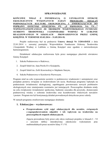 SPRAWOZDANIE KOŃCOWE WRAZ Z INFORMACJĄ O UZYSKANYM EFEKCIE EKOLOGICZNYM WYKONANYCH ZADAŃ PROGRAMU DZIAŁAŃ PODNOSZĄCYCH KULTURĘ EKOLOGICZNĄ I ZMIERZAJĄCYCH DO POPRAWY ESTETYKI OTOCZENIA PT. „Z EKOLOGIA NA TY…” WSPÓŁFINANSOWANEGO ZE ŚRODKÓW WOJEWÓDZKIEGO FUNDUSZU OCHRONY ŚRODOWISKA I GOSPODARKI WODNEJ W LUBLINIE REALIZOWANEGO W SZKOŁACH PROWADZONYCH PRZEZ GMINĘ KSIĘŻPOL W TERMINIE 03.02.2014 – 31.05.2014 R. Projekt realizowany był na podstawie Umowy dotacji Nr 3/2014/D/EE z dnia 22.01.2014 r. zawartej pomiędzy Wojewódzkim Funduszem Ochrony Środowiska i Gospodarki Wodnej w Lublinie a Gminą Księżpol oraz zgodnie z zatwierdzonym harmonogramem. Działalność edukacyjna realizowana była przez następujące placówki oświatowe Gminy Księżpol: 1. Szkoła Podstawowa w Rakówce, 2. Zespół Szkół im. Jana Pawła II w Księżpolu, 3. Zespół Szkół im. Zofii Krawieckiej w Majdanie Starym, 4. Szkoła Podstawowa w Korchowie Pierwszym. Program miał na celu wyposażenie uczniów w podstawowe wiadomości i umiejętności oraz pożądane postawy związane ze środowiskiem ich życia. Realizacja programu wpłynęła na podniesienie świadomości ekologicznej, zapobieganie powstawaniu nowych problemów ekologicznych oraz zmniejszanie rozmiarów już istniejących. Poszczególne działania miały na celu zwiększenie świadomości społecznej, budzenie szacunku dla przyrody, dostarczanie podstawowej wiedzy o ochronie środowiska oraz kształtowanie właściwych nawyków i postaw. Program ten był kontynuacją działań prowadzonych dotychczas przez szkoły. W ramach programu zrealizowano następujące działania: 1. Edukacyjno – wychowawcze: Przeprowadzono cykl zajęć edukacyjnych dla uczniów, związanych z zagospodarowaniem odpadów i ich wpływem na środowisko na poszczególnych etapach edukacyjnych. Zajęcia prowadzone były przez cały okres realizacji projektu w klasach I – VI z użyciem tablicy interaktywnej zakończone wykonaniem prac multimedialnych przez uczniów klasy V i VI. Zorganizowano Gminny Konkurs Recytatorski o tematyce ekologicznej dla uczniów I etapu edukacyjnego koordynowany przez nauczycieli Szkoły Podstawowej w Rakówce. Konkurs przebiegał w dwóch etapach: - I etap szkolny został zorganizowany w każdej szkole biorącej udział w projekcie, - II etap gminny odbył się 21 maja w Szkole Podstawowej w Rakówce. Uczniowie klas I-III recytowali wiersze o tematyce ekologicznej. Uczniowie, którzy zdobyli trzy pierwsze miejsca oraz wyróżnienia, otrzymali nagrody książkowe i dyplomy, a pozostali uczestnicy przybory szkolne i dyplomy. W Szkole Podstawowej w Rakówce zorganizowano warsztaty plastyczne „Ekologiczne dekoracje wiosenne”. W warsztatach plastycznych wzięli udział uczniowie z klas IV-VI. Dzieci wykonały wiosenne kwiaty z papieru i bibuły pod kierunkiem Pani Krystyny Kutniowskiej – artystki ludowej, która prowadziła warsztaty. Odbyły się przygotowane przez uczniów inscenizacje i prezentacje o tematyce ekologicznej. Z okazji Dnia Ziemi w kwietniu miały miejsce we wszystkich szkołach biorących udział w projekcie różnego rodzaju działania edukacyjno – wychowawcze. Uczniowie ze Szkoły Podstawowej w Rakówce zaprezentowali inscenizację pt. „ I co by było gdyby…”. Odbył się również pokaz mody ekologicznej oraz konkurs plastyczny dla uczniów klas IV – VI „Z ekologią na Ty…”. Nagrodzone prace zostały zaprezentowane społeczności szkolnej. Przeprowadzono gminny konkurs fotograficzny pt. „Piękno przyrody” koordynowany przez nauczycieli Szkoły Podstawowej w Rakówce. Konkurs skierowany był do uczniów klas IV – VI szkół podstawowych z terenu gminy Księżpol biorących udział w projekcie. Obejmował dwie kategorie: kategoria A – krajobraz w różnych porach roku, kategoria B – wybrany element przyrody. Rozstrzygnięcie konkursu nastąpiło 21 maja. W konkursie wzięło udział 13 uczniów. Zwycięzcy konkursu otrzymali nagrody książkowe. 2. Informacyjno – edukacyjne: Założono na stronie internetowej Szkoły Podstawowej w Rakówce podstronę dotyczącą stanu środowiska najbliższej okolicy i opublikowano na niej materiały zgromadzone w ramach projektu. Przeprowadzono na zebraniach szkolnych prelekcje dla rodziców na tematy związane z ekologią z wykorzystaniem tablicy interaktywnej. Wykonano gazetki ścienne o tematyce ekologicznej na korytarzu szkolnym, w tym prace uczniów wykonane w ramach projektu – prace plastyczne, fotografie, plakaty. Zaprezentowano i podsumowano realizację projektu dla społeczności lokalnej z zastosowaniem tablicy interaktywnej. 3. Wycieczki edukacyjne: Zorganizowano rajdy rowerowe po okolicy Rakówki, podczas których wyszukiwano, fotografowano i nanoszono na mapki dzikie wysypiska śmieci i oznaczano inne miejsca zagrożeń ekologicznych. Odbyła się wycieczka nad Tanew, podczas której wykonano dokumentację fotograficzną i porządkowano brzegi rzeki. 4. Organizowanie i uczestnictwo w przedsięwzięciach na rzecz ochrony i poprawy stanu środowiska najbliższej okolicy: W ramach obchodów Dnia Ziemi została zorganizowana akcja sprzątania miejsc otaczających szkołę i segregowania zebranych śmieci. Przeprowadzono zbiórkę makulatury, puszek aluminiowych, szkła i baterii. Zorganizowano kiermasz dekoracji wiosennych wykonanych na warsztatach plastycznych. Wymiernymi efektami zrealizowanych działań jest zainteresowanie uczniów tematyką przyrodniczo – ekologiczną, pogłębienie wiedzy związanej z ochroną środowiska, dzielenie się wypracowanymi materiałami oraz włączenie do wspólnych działań w zakresie tematyki ekologicznej i ochrony środowiska uczniów oraz ich rodziców. Uczniowie - nabywali wiadomości i kształtowali nawyki proekologiczne. Społeczność lokalna – uwrażliwia się na potrzeby środowiska przyrodniczego, zauważa korzyści płynące z unikania szkodliwych dla środowiska działań. Nauczy