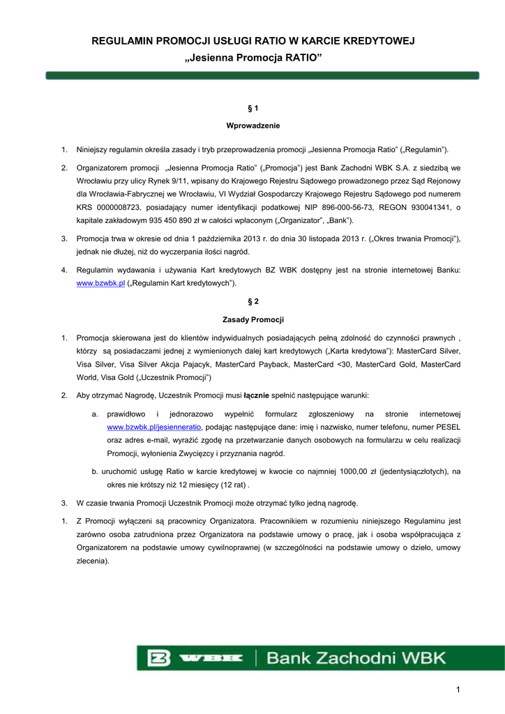 REGULAMIN PROMOCJI USŁUGI RATIO W KARCIE KREDYTOWEJ „Jesienna Promocja RATIO” §1 Wprowadzenie 1. Niniejszy regulamin określa zasady i tryb przeprowadzenia promocji „Jesienna Promocja Ratio” („Regulamin”). 2. Organizatorem promocji „Jesienna Promocja Ratio” („Promocja”) jest Bank Zachodni WBK S.A. z siedzibą we Wrocławiu przy ulicy Rynek 9/11, wpisany do Krajowego Rejestru Sądowego prowadzonego przez Sąd Rejonowy dla Wrocławia-Fabrycznej we Wrocławiu, VI Wydział Gospodarczy Krajowego Rejestru Sądowego pod numerem KRS 0000008723, posiadający numer identyfikacji podatkowej NIP 896-000-56-73, REGON 930041341, o kapitale zakładowym 935 450 890 zł w całości wpłaconym („Organizator”, „Bank”). 3. Promocja trwa w okresie od dnia 1 października 2013 r. do dnia 30 listopada 2013 r. („Okres trwania Promocji”), jednak nie dłuŜej, niŜ do wyczerpania ilości nagród. 4. Regulamin wydawania i uŜywania Kart kredytowych BZ WBK dostępny jest na stronie internetowej Banku: www.bzwbk.pl („Regulamin Kart kredytowych”). §2 Zasady Promocji 1. Promocja skierowana jest do klientów indywidualnych posiadających pełną zdolność do czynności prawnych , którzy są posiadaczami jednej z wymienionych dalej kart kredytowych („Karta kredytowa”): MasterCard Silver, Visa Silver, Visa Silver Akcja Pajacyk, MasterCard Payback, MasterCard <30, MasterCard Gold, MasterCard World, Visa Gold („Uczestnik Promocji”) 2. Aby otrzymać Nagrodę, Uczestnik Promocji musi łącznie spełnić następujące warunki: a. prawidłowo i jednorazowo wypełnić formularz zgłoszeniowy na stronie internetowej www.bzwbk.pl/jesienneratio, podając następujące dane: imię i nazwisko, numer telefonu, numer PESEL oraz adres e-mail, wyraŜić zgodę na przetwarzanie danych osobowych na formularzu w celu realizacji Promocji, wyłonienia Zwycięzcy i przyznania nagród. b. uruchomić usługę Ratio w karcie kredytowej w kwocie co najmniej 1000,00 zł (jedentysiączłotych), na okres nie krótszy niŜ 12 miesięcy (12 rat) . 3. W czasie trwania Promocji Uczestnik Promocji moŜe otrzymać tylko jedną nagrodę. 1. Z Promocji wyłączeni są pracownicy Organizatora. Pracownikiem w rozumieniu niniejszego Regulaminu jest zarówno osoba zatrudniona przez Organizatora na podstawie umowy o pracę, jak i osoba współpracująca z Organizatorem na podstawie umowy cywilnoprawnej (w szczególności na podstawie umowy o dzieło, umowy zlecenia). 1 REGULAMIN PROMOCJI USŁUGI RATIO W KARCIE KREDYTOWEJ „Jesienna Promocja RATIO” §3 Nagrody 1. Nagrodą w Promocji jest plecak sportowy z logo Banku („Nagroda”) – ilość ograniczona 300 sztuk. 2. Uczestnik Promocji, który spełni warunki Promocji określone w § 2 punkt 2, otrzyma Nagrodę, która zostanie przekazana za pośrednictwem firmy kurierskiej na adres pocztowy podany w formularzu zgłoszeniowym. Nagroda zostanie wysłana w ciągu 30 dni od zakończenia Promocji. 3. Uczestnik promocji nie moŜe domagać się zamiany Nagrody na inną. §4 Reklamacje 1. Reklamacje dotyczące Promocji mogą być przesyłane na adres: Bank Zachodni WBK S.A., Obszar Direct Banking, Zespół Kart Kredytowych, Pl. Andersa 5, 61-894 Poznań. Uczestnik moŜe równieŜ złoŜyć reklamację ustnie w siedzibie Banku, dowolnej jednostce organizacyjnej Banku zajmującej się obsługą klienta, pisemnie na adres Banku lub jego dowolnej jednostki organizacyjnej zajmującej się obsługą klienta, telefonicznie lub w formie elektronicznej. Odpowiednie adresy, w tym poczty elektronicznej, oraz numery telefonów dostępne są w jednostkach organizacyjnych Banku zajmujących się obsługa klienta oraz wskazane na stronie internetowej Banku www.bzwbk.pl 2. Reklamacja powinna zawierać: imię, nazwisko i dokładny adres Uczestnika jak równieŜ opis i wskazanie 3. Odpowiedź na reklamacje zostanie udzielona przez Bank pisemnie, telefonicznie, ustnie lub w formie przyczyny reklamacji. elektronicznej, bez zbędnej zwłoki, jednak nie później niŜ w terminie 30 dni od daty otrzymania reklamacji. W uzasadnionych przypadkach termin udzielenia odpowiedzi moŜe zostać wydłuŜony maksymalnie do 90 dni, po uprzednim wyjaśnieniu Uczestnikowi przyczyn opóźnienia i wskazania okoliczności wymagających dodatkowego ustalenia §5 Postanowienia końcowe 1. Niniejszy Regulamin dostępny będzie w okresie od dnia 1 października 2013 do dnia 31 grudnia 2013r. na stronie internetowej www.bzwbk.pl/jesienneratio oraz w kaŜdym oddziale Banku i kaŜdej placówce BZ WBK Partner. 2. Organizator jest odpowiedzialny za przeprowadzenie Promocji i jej prawidłowy przebieg. 3. W przypadku podania przez Uczestnika Promocji w formularzu informacyjnym błędnych lub nieaktualnych danych uniemoŜliwiających przekazanie Nagrody, Organizator rozstrzyga o losie nieodebranych Nagród. 4. Bank zastrzega sobie prawo do przedłuŜenia Promocji. 5. W sprawach nieuregulowanych w niniejszym Regulaminie zastosowanie mają powszechnie obowiązujące przepisy prawa. 2 REGULAMIN PROMOCJI USŁUGI RATIO W KARCIE KREDYTOWEJ „Jesienna Promocja RATIO” 6. Właściwym dla Banku organem nadzoru jest Komisja Nadzoru Finansowego. 7. Uczestnik Promocji moŜe zwrócić się o bezpłatną pomoc prawną do Miejskich lub Powiatowych Rzeczników Konsumenta. 8. Spory pomiędzy Uczestnikiem a Organizatorem mogą być rozstrzygane polubownie przed Arbitrem Bankowym przy Związku Banków Polskich, o ile wartość przedmiotu sporu nie jest wyŜsza niŜ 8000 zł. 3