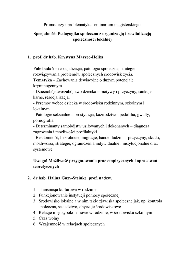 Promotorzy i problematyka seminarium magisterskiego Specjalność: Pedagogika społeczna z organizacją i rewitalizacją społeczności lokalnej 1. prof. dr hab. Krystyna Marzec-Holka Pole badań – resocjalizacja, patologia społeczna, strategie rozwiązywania problemów społecznych środowisk życia. Tematyka – Zachowania dewiacyjne o dużym potencjale kryminogennym - Dzieciobójstwo/zabójstwo dziecka – motywy i przyczyny, sankcje karne, resocjalizacja. - Przemoc wobec dziecka w środowisku rodzinnym, szkolnym i lokalnym. - Patologie seksualne – prostytucja, kazirodztwo, pedofilia, gwałty, pornografia. - Determinanty samobójstw usiłowanych i dokonanych – diagnoza zagrożenia i możliwości profilaktyki. - Bezdomność, bezrobocie, migracje, handel ludźmi – przyczyny, skutki, możliwości, strategie, ograniczenia indywidualne i instytucjonalne oraz systemowe. Uwaga! Możliwość przygotowania prac empirycznych i opracowań teoretycznych 2. dr hab. Halina Guzy-Steinke prof. nadzw. 1. Transmisja kulturowa w rodzinie 2. Funkcjonowanie instytucji pomocy społecznej 3. Środowisko lokalne a w nim takie zjawiska społeczne jak, np. kontrola społeczna, sąsiedztwo, obyczaje środowiskowe 4. Relacje międzypokoleniowe w rodzinie, w środowisku szkolnym 5. Czas wolny 6. Wzajemność w relacjach społecznych