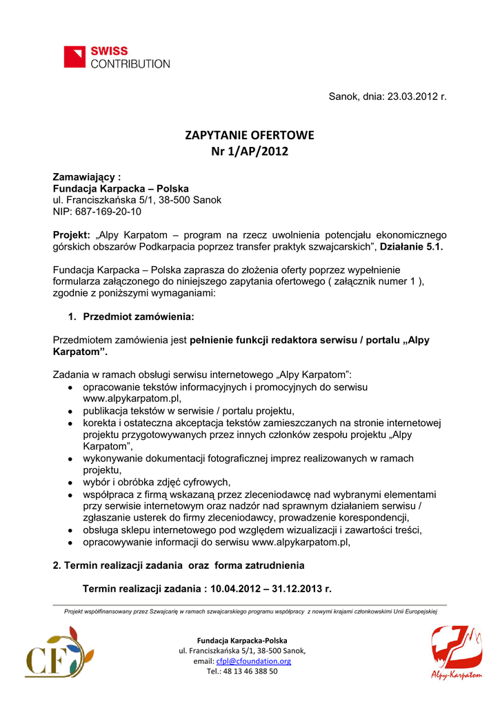 Sanok, dnia: 23.03.2012 r. ZAPYTANIE OFERTOWE Nr 1/AP/2012 Zamawiający : Fundacja Karpacka – Polska ul. Franciszkańska 5/1, 38-500 Sanok NIP: 687-169-20-10 Projekt: „Alpy Karpatom – program na rzecz uwolnienia potencjału ekonomicznego górskich obszarów Podkarpacia poprzez transfer praktyk szwajcarskich”, Działanie 5.1. Fundacja Karpacka – Polska zaprasza do złożenia oferty poprzez wypełnienie formularza załączonego do niniejszego zapytania ofertowego ( załącznik numer 1 ), zgodnie z poniższymi wymaganiami: 1. Przedmiot zamówienia: Przedmiotem zamówienia jest pełnienie funkcji redaktora serwisu / portalu „Alpy Karpatom”. Zadania w ramach obsługi serwisu internetowego „Alpy Karpatom”: opracowanie tekstów informacyjnych i promocyjnych do serwisu www.alpykarpatom.pl, publikacja tekstów w serwisie / portalu projektu, korekta i ostateczna akceptacja tekstów zamieszczanych na stronie internetowej projektu przygotowywanych przez innych członków zespołu projektu „Alpy Karpatom”, wykonywanie dokumentacji fotograficznej imprez realizowanych w ramach projektu, wybór i obróbka zdjęć cyfrowych, współpraca z firmą wskazaną przez zleceniodawcę nad wybranymi elementami przy serwisie internetowym oraz nadzór nad sprawnym działaniem serwisu / zgłaszanie usterek do firmy zleceniodawcy, prowadzenie korespondencji, obsługa sklepu internetowego pod względem wizualizacji i zawartości treści, opracowywanie informacji do serwisu www.alpykarpatom.pl, 2. Termin realizacji zadania oraz forma zatrudnienia Termin realizacji zadania : 10.04.2012 – 31.12.2013 r. Projekt współfinansowany przez Szwajcarię w ramach szwajcarskiego programu współpracy z nowymi krajami członkowskimi Unii Europejskiej Fundacja Karpacka-Polska ul. Franciszkańska 5/1, 38-500 Sanok, email: [email protected] Tel.: 48 13 46 388 50 Forma zatrudnienia: umowa zlecenie za czas realizacji zadania/ rozliczenie miesięczne 3. Miejsce realizacji zadania Fundacja Karpacka – Polska, ul. Rynek 7, 38-500 Sanok 4. Zamawiający nie dopuszcza możliwości składania ofert częściowych. 5. Wymagane kwalifikacje konieczne do spełnienia przez Oferentów: wyższe wykształcenie, znajomość obsługi pakietu MS Office, znajomość i umiejętność obsługi programów komputerowych do edycji grafiki (np. Corel, Photoshop), znajomość budowy stron internetowych (HTML, CMS), doświadczenie w obsłudze stron internetowych (portali używanych w jednostkach samorządowych i rządowych), znajomość języka angielskiego, umiejętność poprawnego redagowania tekstów w zakresie tematyki związanej z projektem zarówno w języku polskim jak i angielskim, doświadczenie przy obsłudze projektów krajowych i międzynarodowych, umiejętność pracy w zespole. 3. Opis kryteriów i sposobu oceny ofert: Przy wyborze ofert Zamawiający będzie kierował się następującymi kryteriami: cena brutto wykonania przedmiotu zamówienia (wynagrodzenie miesięczne, kwota umowy zlecenia) wykształcenie, doświadczenie zawodowe. 4. Wymagane dokumenty: 1. List motywacyjny zawierający m.in. opis posiadanego doświadczenia zawodowego oraz zakres wykonywanych obowiązków na dotychczasowym stanowisku, 2. Życiorys, 3. Zaświadczenia i certyfikaty potwierdzające kwalifikacje. 5. Termin i miejsce składania ofert: Powyższe dokumenty wraz z wypełnionym formularzem ofertowym (załącznik nr 1) należy przesłać do dnia 30 marca 2012 r., w formie elektronicznej na adres Projekt współfinansowany przez Szwajcarię w ramach szwajcarskiego programu współpracy z nowymi krajami członkowskimi Unii Europejskiej Fundacja Karpacka-Polska ul. Franciszkańska 5/1, 38-500 Sanok, email: [email protected] Tel.: 48 13 46 388 50 [email protected] lub papierowej na adres: Fundacja Karpacka-Polska, ul. Rynek 7, 38-500 Sanok (liczy się data wpływu). 6. W celu opracowania oferty Oferent może zapoznać się z wnioskiem projektu udostępnionym do wglądu przez Zleceniodawcę w siedzibie Zamawiającego. UWAGA: za terminowe dostarczenie oferty odpowiada oferent. Zaleca się potwierdzenie wpłynięcia oferty do Zamawiającego. Fundacja nie odpowiada za niedostarczone w terminie oferty. 1. Ocena ofert zostanie dokonana najpóźniej dnia 4 kwietnia 2012. 2. Oferent może przed upływem terminu składania ofert zmienić lub doprecyzować swoją ofertę. 3. W toku badania i oceny ofert Zamawiający może żądać od oferentów wyjaśnień dotyczących treści złożonych ofert. 7. OPIS SPOSOBU OBLICZENIA CENY 1. Cena oferty winna obejmować wszystkie koszty związane z realizacją przedmiotu Zamówienia. 2. Cena powinna zawierać przekazanie praw autorskich Zamawiającego, na wszystkich płaszczyznach eksploatacji. i pokrewnych na 3. Cenę oferty będzie stanowić: cena brutto. 8. INFORMACJE DOTYCZĄCE WYBORU NAJKORZYSTNIEJSZEJ OFERTY O wyborze lub odrzuceniu danej oferty Zamawiający zawiadomi każdego z oferentów drogą e-mailową lub telefoniczną do dnia 6 kwietnia 2012 r. Projekt współfinansowany przez Szwajcarię w ramach szwajcarskiego programu współpracy z nowymi krajami członkowskimi Unii Europejskiej Fundacja Karpacka-Polska ul. Franciszkańska 5/1, 38-500 Sanok, email: [email protected] Tel.: 48 13 46 388 50 ZAŁACZNIK Nr 1 Załącznik nr 1 do Zapytania Ofertowego numer ………… z dnia 23.03.2012 r. ................................................... ........................................... Imię i nazwisko oraz adres Oferenta, miejscowość i data FORMULARZ OFERTOWY Odpowiadając na zapytanie ofertowe dotyczące pełnienia funkcji redaktora serwisu / portalu „Alpy Karpatom” 1. Oferuję cenę ryczałtową brutto wykonania przedmiotu zamówienia w formie umowy zlecenia (wynagrodzenie miesięczne) w wysokości : ..............................................zł brutto. 2. Ponadto oświadczam, iż: a) zobowiązuję się do wykonywania zadań wyszczególnionych w zapytaniu ofertowym w okresie realizacji projektu tj. od 
