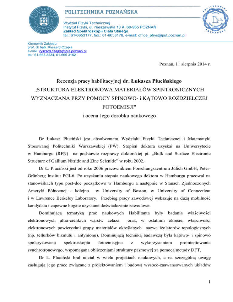 Wydział Fizyki Technicznej Instytut Fizyki, ul. Nieszawska 13 A, 60-965 POZNAŃ Zakład Spektroskopii Ciała Stałego tel.: 61-6653177, fax.: 61-6653178, e-mail: [email protected] Kierownik Zakładu: prof. dr hab. Ryszard Czajka e-mail: [email protected] tel.: 61-665 3234, 61-665 3162 Poznań, 11 sierpnia 2014 r. Recenzja pracy habilitacyjnej dr. Łukasza Plucińskiego „STRUKTURA ELEKTRONOWA MATERIAŁÓW SPINTRONICZNYCH WYZNACZANA PRZY POMOCY SPINOWO- i KĄTOWO ROZDZIELCZEJ FOTOEMISJI" i ocena Jego dorobku naukowego Dr Łukasz Pluciński jest absolwentem Wydziału Fizyki Technicznej i Matematyki Stosowanej Politechniki Warszawskiej (PW). Stopień doktora uzyskał na Uniwersytecie w Hamburgu (RFN) na podstawie rozprawy doktorskiej pt. „Bulk and Surface Electronic Structure of Gallium Nitride and Zinc Selenide” w roku 2002. Dr Ł. Pluciński jest od roku 2006 pracownikiem Forschungszentrum Jülich GmbH, PeterGrünberg Institut PGI-6. Po uzyskaniu stopnia naukowego doktora w Hamburgu pracował na stanowiskach typu post-doc początkowo w Hamburgu a następnie w Stanach Zjednoczonych Ameryki Północnej - kolejno w University of Boston, w University of Connecticut i w Lawrence Berkeley Laboratory. Przebieg pracy zawodowej wskazuje na dużą mobilność kandydata i zapewne bogate uzyskane doświadczenie zawodowe. Dominującą tematyką prac naukowych elektronowych ultra-cienkich warstw żelaza Habilitanta były badania właściwości oraz, w ostatnim okresie, właściwości elektronowych powierzchni grupy materiałów określanych nazwą izolatorów topologicznych (np. tellurków bizmutu i antymonu). Dominującą techniką badawczą była kątowo- i spinowo spolaryzowana spektroskopia fotoemisyjna z wykorzystaniem promieniowania synchrotronowego, wspomagana obliczeniami struktury pasmowej za pomocą metody DFT. Dr Ł. Pluciński brał udział w wielu projektach naukowych, a na szczególną uwagę zasługują jego prace związane z projektowaniem i budową wysoce-zaawansowanych układów 1 pomiarowych umożliwiających pomiary w wysokiej rozdzielczości energetycznej, pracujących w różnych ośrodkach naukowych na całym świecie (USA, RFN, Japonia). Obecnie Habilitant koncentruje się nad badaniami cienkich warstw izolatorów topologicznych i cienkich warstw materiałów magnetycznych. Dr. Ł. Pluciński jest współautorem 42 publikacji w czasopismach z tzw. listy filadelfijskiej, o sumarycznym „Impact Factor” ponad 178, liczba cytowań przekracza już 900, a Indeks Hirscha wynosi 15. Ponadto, Habilitant jest współautorem kilku publikacji w innych czasopismach oraz wielu niepublikowanych raportów z badań prowadzonych w ośrodkach synchrotronowych czy w kolejnych miejscach zatrudnienia. Dr Pluciński wygłosił także kilkanaście referatów podczas konferencji międzynarodowych i na zaproszenie różnych instytucji naukowych. Habilitant był jednym z głównych wykonawców w grantach realizowanych w USA, RFN, Szwecji i Japonii, a obecnie kieruje wspólnym projektem FZ Jülich i AGH pt.; „Spintronic properties of metal/metal-oxide monolayer superlattices”. Jestem pewien, że z łatwością będzie uzyskiwał projekty badawcze także i w Polsce. Dr Pluciński recenzował już 20 artykułów naukowych dla takich czasopism, jak Journal of Crystal Growth, Physica Status Solidi B, Physical Review B (8 !), Physical Review Letters! i Surface Science, co świadczy o tym, że jest rozpoznawalny jako ekspert w zakresie fizyki powierzchni i materiałów. Działalność dydaktyczna Habilitanta obejmuje opiekę naukową nad dwoma dyplomantami kursu magisterskiego oraz promotorstwo pomocnicze w trzech przewodach doktorskich w Niemczech. Brak informacji o innych zajęciach dydaktycznych czy promocyjnych, jednak ilość referatów konferencyjnych i referatów wygłaszanych na zaproszenie instytucji naukowych na całym Świecie, moim zdaniem, świadczy o zdolnościach habilitanta do prowadzenia zajęć dydaktycznych z fizyki ciała stałego i dziedzin pokrewnych. Już ten wstępny opis kariery zawodowej dr. Ł. Plucińskiego wskazuje, że mamy do czynienia z naukowcem klasy światowej o dużych osiągnięciach udokumentowanych publikacjami naukowymi w bardzo dobrych czasopismach naukowych oraz skonstruowanymi przez Habilitanta układami badawczymi o najwyższych światowych parametrach. Przechodząc do oceny osiągnięcia naukowego, które stanowi podstawę do przeprowadzenia postępowania habilitacyjnego, czyli cyklu artykułów pt.: „Struktura elektronowa materiałów spintronicznych wyznaczana przy pomocy spinowo- i kątowo rozdzielczej fotoemisji” nie mam wątpliwości, co do aktualności i ważności wyników 2 osiągniętych przez dr. Ł. Plucińskiego. Badania mają głównie charakter badań podstawowych, ale dotyczą dziedziny wiedzy ważnej, i to w najbliższej przyszłości, także dla aplikacji w szeroko rozumianej nanoelektronice. W skład „cyklu habilitacyjnego” wchodzi 7 publikacji. Pierwsze trzy prace, opublikowane w Phys. Rev. B (H1, H2 i H3), poświęcone są badaniom właściwości elektronowych ultracienkich warstw lub powierzchni materiałów magnetycznych na bazie żelaza. W pracy H1 autorzy wskazali na brak niemagnetycznej warstwy Fe w obrębie interfejsu z MgO, przynajmniej po napyleniu jednej monowarstwy MgO oraz występowanie plazmonu powierzchniowego w podłożu Fe(001). W pracy H2 rozwinięto temat stanów interfejsowym pod kątem układów wykorzystujących efekt tunelowej magneto-rezystancji (TMR). Warto podkreślić uzyskanie bardzo dobrej rozdzielczości energetycznej pomiaru fotoemisyjnego oraz połączenie wysokiej klasy eksperymentu z samodzielnie wykonanymi obliczeniami teoretycznymi struktury elektronowej, co ułatwiło interpretację dotyczącą mniejszościowego stanu powierzchniowego w warstwie Fe(001). W kolejnej pracy, H3, habilitant wykorzystał zjawisko magnetycznego liniowego dichroizmu w spektroskopii stanów rdzeniowych do wyznaczenia 