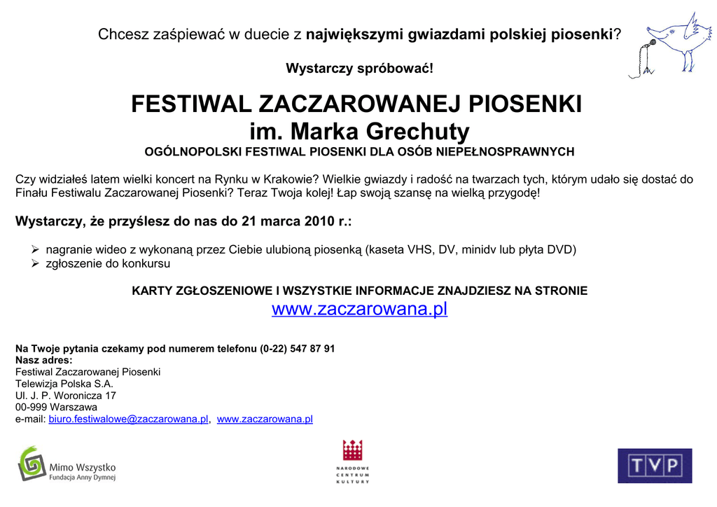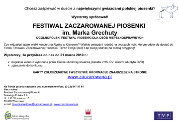 Chcesz zaśpiewać w duecie z największymi gwiazdami polskiej piosenki? Wystarczy spróbować! FESTIWAL ZACZAROWANEJ PIOSENKI im. Marka Grechuty OGÓLNOPOLSKI FESTIWAL PIOSENKI DLA OSÓB NIEPEŁNOSPRAWNYCH Czy widziałeś latem wielki koncert na Rynku w Krakowie? Wielkie gwiazdy i radość na twarzach tych, którym udało się dostać do Finału Festiwalu Zaczarowanej Piosenki? Teraz Twoja kolej! Łap swoją szansę na wielką przygodę! Wystarczy, że przyślesz do nas do 21 marca 2010 r.: nagranie wideo z wykonaną przez Ciebie ulubioną piosenką (kaseta VHS, DV, minidv lub płyta DVD) zgłoszenie do konkursu KARTY ZGŁOSZENIOWE I WSZYSTKIE INFORMACJE ZNAJDZIESZ NA STRONIE www.zaczarowana.pl Na Twoje pytania czekamy pod numerem telefonu (0-22) 547 87 91 Nasz adres: Festiwal Zaczarowanej Piosenki Telewizja Polska S.A. Ul. J. P. Woronicza 17 00-999 Warszawa e-mail: [email protected], www.zaczarowana.pl