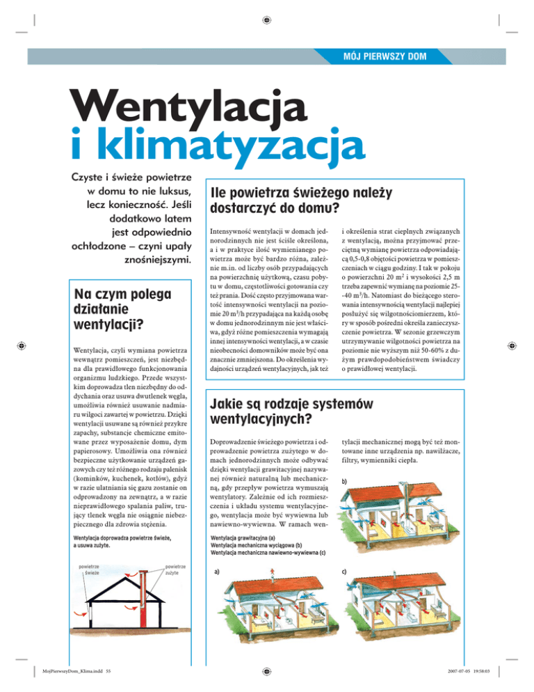 MÓJ PIERWSZY DOM Wentylacja i klimatyzacja Czyste i świeże powietrze w domu to nie luksus, lecz konieczność. Jeśli dodatkowo latem jest odpowiednio ochłodzone – czyni upały znośniejszymi. Na czym polega działanie wentylacji? Wentylacja, czyli wymiana powietrza wewnątrz pomieszczeń, jest niezbędna dla prawidłowego funkcjonowania organizmu ludzkiego. Przede wszystkim doprowadza tlen niezbędny do oddychania oraz usuwa dwutlenek węgla, umożliwia również usuwanie nadmiaru wilgoci zawartej w powietrzu. Dzięki wentylacji usuwane są również przykre zapachy, substancje chemiczne emitowane przez wyposażenie domu, dym papierosowy. Umożliwia ona również bezpieczne użytkowanie urządzeń gazowych czy też różnego rodzaju palenisk (kominków, kuchenek, kotłów), gdyż w razie ulatniania się gazu zostanie on odprowadzony na zewnątrz, a w razie nieprawidłowego spalania paliw, trujący tlenek węgla nie osiągnie niebezpiecznego dla zdrowia stężenia. Wentylacja doprowadza powietrze świeże, a usuwa zużyte. powietrze świeże MojPierwszyDom_Klima.indd 55 powietrze zużyte Ile powietrza świeżego należy dostarczyć do domu? Intensywność wentylacji w domach jednorodzinnych nie jest ściśle określona, a i w praktyce ilość wymienianego powietrza może być bardzo różna, zależnie m.in. od liczby osób przypadających na powierzchnię użytkową, czasu pobytu w domu, częstotliwości gotowania czy też prania. Dość często przyjmowana wartość intensywności wentylacji na poziomie 20 m3/h przypadająca na każdą osobę w domu jednorodzinnym nie jest właściwa, gdyż różne pomieszczenia wymagają innej intensywności wentylacji, a w czasie nieobecności domowników może być ona znacznie zmniejszona. Do określenia wydajności urządzeń wentylacyjnych, jak też i określenia strat cieplnych związanych z wentylacją, można przyjmować przeciętną wymianę powietrza odpowiadającą 0,5-0,8 objętości powietrza w pomieszczeniach w ciągu godziny. I tak w pokoju o powierzchni 20 m2 i wysokości 2,5 m trzeba zapewnić wymianę na poziomie 25-40 m3/h. Natomiast do bieżącego sterowania intensywnością wentylacji najlepiej posłużyć się wilgotnościomierzem, który w sposób pośredni określa zanieczyszczenie powietrza. W sezonie grzewczym utrzymywanie wilgotności powietrza na poziomie nie wyższym niż 50-60% z dużym prawdopodobieństwem świadczy o prawidłowej wentylacji. Jakie są rodzaje systemów wentylacyjnych? Doprowadzenie świeżego powietrza i odprowadzenie powietrza zużytego w domach jednorodzinnych może odbywać dzięki wentylacji grawitacyjnej nazywanej również naturalną lub mechaniczną, gdy przepływ powietrza wymuszają wentylatory. Zależnie od ich rozmieszczenia i układu systemu wentylacyjnego, wentylacja może być wywiewna lub nawiewno-wywiewna. W ramach wen- tylacji mechanicznej mogą być też montowane inne urządzenia np. nawilżacze, filtry, wymienniki ciepła. b) Wentylacja grawitacyjna (a) Wentylacja mechaniczna wyciągowa (b) Wentylacja mechaniczna nawiewno-wywiewna (c) a) c) 2007-07-05 19:58:03 MÓJ PIERWSZY DOM Jak działa wentylacja grawitacyjna? Wentylacja grawitacyjna funkcjonuje dzięki różnicy temperatur wewnątrz pomieszczeń i na zewnątrz. Cieplejsze powietrze wewnętrzne jako lżejsze unosi się do góry, a na jego miejsce różnymi drogami (przez nieszczelności w stolarce okiennej i drzwiowej, nawiewnikami) napływa świeże powietrze zewnętrzne. Intensywność takiej wentylacji zależy więc głównie od warunków atmosferycznych – przy mrozach wentylacja działa bardzo intensywnie, a w czasie upałów w ogóle – oraz od oddziaływania wiatru, który może wywoływać efekt ssania w wylotach kanałów wentylacyjnych na dachu i wzrost parcia na elementy nawiewne. A to zwiększa dopływ powietrza zewnętrznego. Sterowalność wentylacją grawitacyjną jest bardzo ograniczona i sprowadza się do regulacji przepływu powietrza w kratkach wentylacyjnych (ich otwierania lub przymykania) bądź w nawiewnikach, jeżeli zostały zamontowane. Kłopotliwą regulację ręczną można zastąpić regulacją automatyczną, która w zależności od wilgotności powietrza wewnętrznego steruje otwarciem przysłon w kratkach lub nawiewnikach. Przy temperaturach zewnętrznych zbliżonych do panujących wewnątrz, wentylacja grawitacyjna przestaje funkcjonować, choć łatwo można ją wtedy zastąpić uchylaniem okien. W przedziale temperatur zewnętrznych 5-15°C intensywność wymiany powietrza przy zamkniętych oknach może być niewystarczająca i wtedy efekt wentylacji mogą poprawić nasadki umieszczane na wylocie kanałów wentylacyjnych wykorzystujące wiatr jako czynnik zwiększający podciśnienie w kanałach wentylacyjnych. Dużą zaletą wentylacji grawitacyjnej jest niezawodność jej funkcjonowania (oczywiście przy odpowiedniej różnicy temperatur) oraz brak zużycia energii do jej pracy. Tak wygląda przepływ powietrza w pomieszczeniach REKLAMA 56 2007 7-8 MojPierwszyDom_Klima.indd 56 2007-07-05 19:58:04 WENTYLACJA I KLIMATYZACJA Gruntowe wymienniki ciepła (GWC) służą do wykorzystywania ciepła ziemi w mechanicznych systemach wentylacji. Wykorzystywane mogą być przez cały rok – zimą pobierają ciepło z gruntu, a latem oddają je do ziemi. Wymienniki gruntowe nie są gotowym urządzeniem, buduje się je jako system rurowy lub złoże żwirowe. Ich funkcjonowanie polega na wymianie ciepła między przepływającym powietrzem a gruntem, a efektywność pracy zależy od powierzchni przejmowania ciepła, intensywności przepływu powietrza, głębokości umieszczenia wymiennika w gruncie. Przy ich budowie istotne jest zapewnienie odpowiedniej czystości biologicznej przepływającego powietrza, ochrona przed przenoszeniem nieprzyjemnych zapachów, odprowadzenie kondensującej wilgoci. Trudno jednoznacznie określić ich przydatność i zysk energetyczny w instalacjach wentylacyjnych i pra