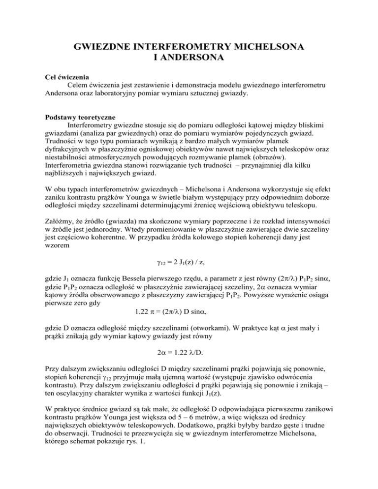GWIEZDNE INTERFEROMETRY MICHELSONA I ANDERSONA Cel ćwiczenia Celem ćwiczenia jest zestawienie i demonstracja modelu gwiezdnego interferometru Andersona oraz laboratoryjny pomiar wymiaru sztucznej gwiazdy. Podstawy teoretyczne Interferometry gwiezdne stosuje się do pomiaru odległości kątowej między bliskimi gwiazdami (analiza par gwiezdnych) oraz do pomiaru wymiarów pojedynczych gwiazd. Trudności w tego typu pomiarach wynikają z bardzo małych wymiarów plamek dyfrakcyjnych w płaszczyźnie ogniskowej obiektywów nawet największych teleskopów oraz niestabilności atmosferycznych powodujących rozmywanie plamek (obrazów). Interferometria gwiezdna stanowi rozwiązanie tych trudności – przynajmniej dla kilku najbliższych i największych gwiazd. W obu typach interferometrów gwiezdnych – Michelsona i Andersona wykorzystuje się efekt zaniku kontrastu prążków Younga w świetle białym występujący przy odpowiednim doborze odległości między szczelinami determinującymi źrenicę wejściową obiektywu teleskopu. Załóżmy, że źródło (gwiazda) ma skończone wymiary poprzeczne i że rozkład intensywności w źródle jest jednorodny. Wtedy promieniowanie w płaszczyźnie zawierające dwie szczeliny jest częściowo koherentne. W przypadku źródła kołowego stopień koherencji dany jest wzorem γ12 = 2 J1(z) / z, gdzie J1 oznacza funkcję Bessela pierwszego rzędu, a parametr z jest równy (2π/λ) P1P2 sinα, gdzie P1P2 oznacza odległość w płaszczyźnie zawierającej szczeliny, 2α oznacza wymiar kątowy źródła obserwowanego z płaszczyzny zawierającej P1P2. Powyższe wyrażenie osiąga pierwsze zero gdy 1.22 π = (2π/λ) D sinα, gdzie D oznacza odległość między szczelinami (otworkami). W praktyce kąt α jest mały i prążki znikają gdy wymiar kątowy gwiazdy jest równy 2α = 1.22 λ/D. Przy dalszym zwiększaniu odległości D między szczelinami prążki pojawiają się ponownie, stopień koherencji γ12 przyjmuje małą ujemną wartość (występuje zjawisko odwrócenia kontrastu). Przy dalszym zwiększaniu odległości d prążki pojawiają się ponownie i znikają – ten oscylacyjny charakter wynika z wartości funkcji J1(z). W praktyce średnice gwiazd są tak małe, że odległość D odpowiadająca pierwszemu zanikowi kontrastu prążków Younga jest większa od 5 – 6 metrów, a więc większa od średnicy największych obiektywów teleskopowych. Dodatkowo, prążki byłyby bardzo gęste i trudne do obserwacji. Trudności te przezwycięża się w gwiezdnym interferometrze Michelsona, którego schemat pokazuje rys. 1. P1 D P2 αD Rys. 1 Schemat gwiezdnego interferometru Michelsona. Światło od gwiazdy pada na zwierciadła zewnętrzne M1 i M2 i poprzez zwierciadła M3 i M4 jest kierowane do szczelin (otworków) P1 i P2. Stopień koherencji między interferującymi zaburzeniami zależy od odległości D między M1 i M2, a okres prążków determinuje odległość P1P2. Odległość między zewnętrznymi zwierciadłami M1 i M2 należy zwiększać do wystąpienia zaniku prążków, następuje to gdy wymiar gwiazdy osiąga wartość 2α = 1.22 λ/D. Nawiązując do powyższego rysunku prążki znikają gdy różnica dróg optycznych αD = 1.22λ gdzie α, a nie 2α, oznacza wymiar kątowy gwiazdy. Stosowanie zwierciadeł i szczelin o relatywnie małych wymiarach redukuje wpływ efektów atmosferycznych na jakość obrazu. Interferometr Andersona jest mechanicznie prostszy od interferometru Michelsona gdyż wymaga stosowania tylko jednej przysłony z dwiema szczelinami przesuwanej między obiektywem a płaszczyzną obrazu (płaszczyzną ogniska obrazowego obiektywu). Przy przesuwie poosiowym diafragma wybiera obszary źrenicy obiektywu coraz bardziej odległe od siebie, a więc zmienia się efektywna odległość między szczelinami. To rozwiązanie interferometru nie nadaje się do pomiaru bardzo małych wymiarów kątowych rzeczywistych gwiazd, ale dobrze nadaje się do pomiaru znacznie większych odległości kątowych w parach gwiazd. W laboratorium stosowanie interferometru Andersona do pomiaru średnicy sztucznej gwiazdy jest znacznie wygodniejsze. W laboratorium trudnością jest znalezienie odpowiednio małej gwiazdy, a nie odwrotnie. Aby zilustrować to zagadnienie można łatwo udowodnić, że teleskop o średnicy obiektywu równej 75 cm powinien, przy idealnych warunkach, rozdzielać dwie gwiazdy o odległości kątowej 9 ⋅ 10-6 rad (1.8 sekundy kątowej). Wynika z tego, że sztuczna gwiazda znajdująca się w odległości 10 metrów powinna mieć wymiar tylko kilku dziesiątych milimetra, nawet dla bardzo małego interferometru. Części składowe stanowiska laboratoryjnego 1) Sztuczna gwiazda Sztuczną gwiazdę stanowi otworek o średnicy 1 mm, podświetlony lampą halogenową, umieszczony w odległości – 144 mm od obiektywu mikroskopowego o powiększeniu 5x pracującego w „sprzężeniu odwrotnym” dla odległości przedmiot – obraz = 189 mm (standard PZO), patrz rysunek poniżej. 144 mm φ1 mm lampa halogenowa gwiazda obiektyw mikroskopowy 5x Rys. 2 Wytwarzanie sztucznej gwiazdy. Laboratoryjne stanowisko sztucznej gwiazdy 2) Obiektyw lunetowy Dublet achromatyczny, φ 50÷75 mm, f’ ≈ 500 mm, odległość przedmiotu od obiektywu około 5 ÷ 10 m. 3) Okular Mikroskop o małym powiększeniu, około 40x. 4) Podwójna szczelina Patrz rysunek. Rys. 3 Szkic dwuszczelinowej źrenicy obiektywu 5) Schemat układu optycznego interferometr sztuczna gwiazda 5 m lub więcej Rys. 4 Schemat zestawianego układu doświadczalnego. Realizacja ćwiczenia Justowanie wstępne • uzyskać optymalny obraz sztucznej gwiazdy bez stosowania przysłony dwuszczelinowej • unieruchomić mikroskop obserwacyjny • wstawić przysłonę dwuszczelinową i przesuwać wzdłuż osi układu. Obserwować prążki interferencyjne i zmianę ich okresu zachowując symetrię rozkładu intensywności w obrazie prążkowym. Pomiar • znaleźć położenie pr
