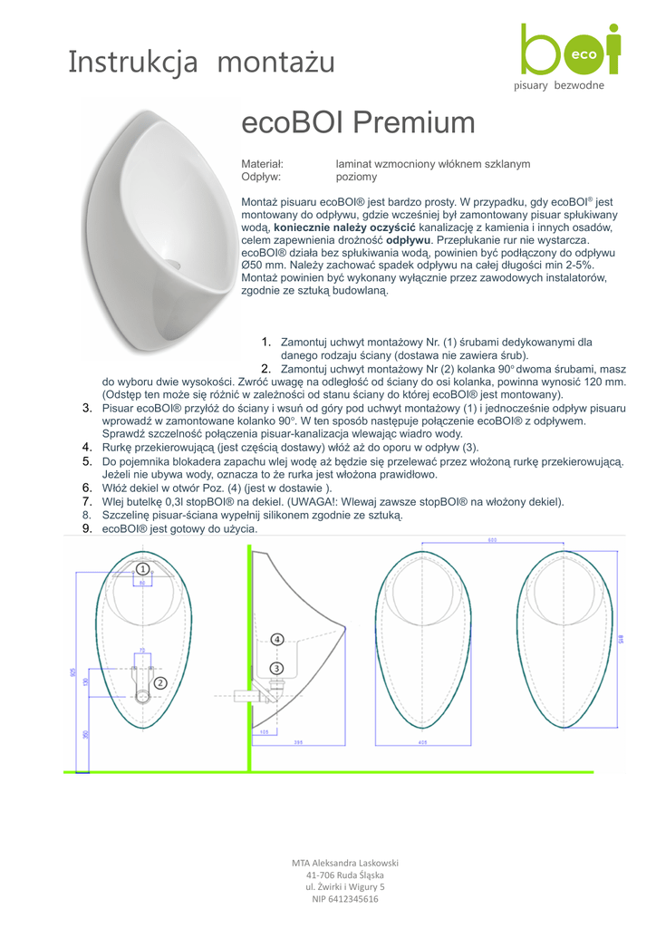 Instrukcja montażu pisuary bezwodne ecoBOI Premium Materiał: Odpływ: laminat wzmocniony włóknem szklanym poziomy Montaż pisuaru ecoBOI® jest bardzo prosty. W przypadku, gdy ecoBOI® jest montowany do odpływu, gdzie wcześniej był zamontowany pisuar spłukiwany wodą, koniecznie należy oczyścić kanalizację z kamienia i innych osadów, celem zapewnienia drożność odpływu. Przepłukanie rur nie wystarcza. ecoBOI® działa bez spłukiwania wodą, powinien być podłączony do odpływu Ø50 mm. Należy zachować spadek odpływu na całej długości min 2-5%. Montaż powinien być wykonany wyłącznie przez zawodowych instalatorów, zgodnie ze sztuką budowlaną. 1. Zamontuj uchwyt montażowy Nr. (1) śrubami dedykowanymi dla danego rodzaju ściany (dostawa nie zawiera śrub). 2. Zamontuj uchwyt montażowy Nr (2) kolanka 90o dwoma śrubami, masz 3. 4. 5. 6. 7. 8. 9. do wyboru dwie wysokości. Zwróć uwagę na odległość od ściany do osi kolanka, powinna wynosić 120 mm. (Odstęp ten może się różnić w zależności od stanu ściany do której ecoBOI® jest montowany). Pisuar ecoBOI® przyłóż do ściany i wsuń od góry pod uchwyt montażowy (1) i jednocześnie odpływ pisuaru wprowadź w zamontowane kolanko 90o. W ten sposób następuje połączenie ecoBOI® z odpływem. Sprawdź szczelność połączenia pisuar-kanalizacja wlewając wiadro wody. Rurkę przekierowującą (jest częścią dostawy) włóż aż do oporu w odpływ (3). Do pojemnika blokadera zapachu wlej wodę aż będzie się przelewać przez włożoną rurkę przekierowującą. Jeżeli nie ubywa wody, oznacza to że rurka jest włożona prawidłowo. Włóż dekiel w otwór Poz. (4) (jest w dostawie ). Wlej butelkę 0,3l stopBOI® na dekiel. (UWAGA!: Wlewaj zawsze stopBOI® na włożony dekiel). Szczelinę pisuar-ściana wypełnij silikonem zgodnie ze sztuką. ecoBOI® jest gotowy do użycia. MTA Aleksandra Laskowski 41-706 Ruda Śląska ul. Żwirki i Wigury 5 NIP 6412345616