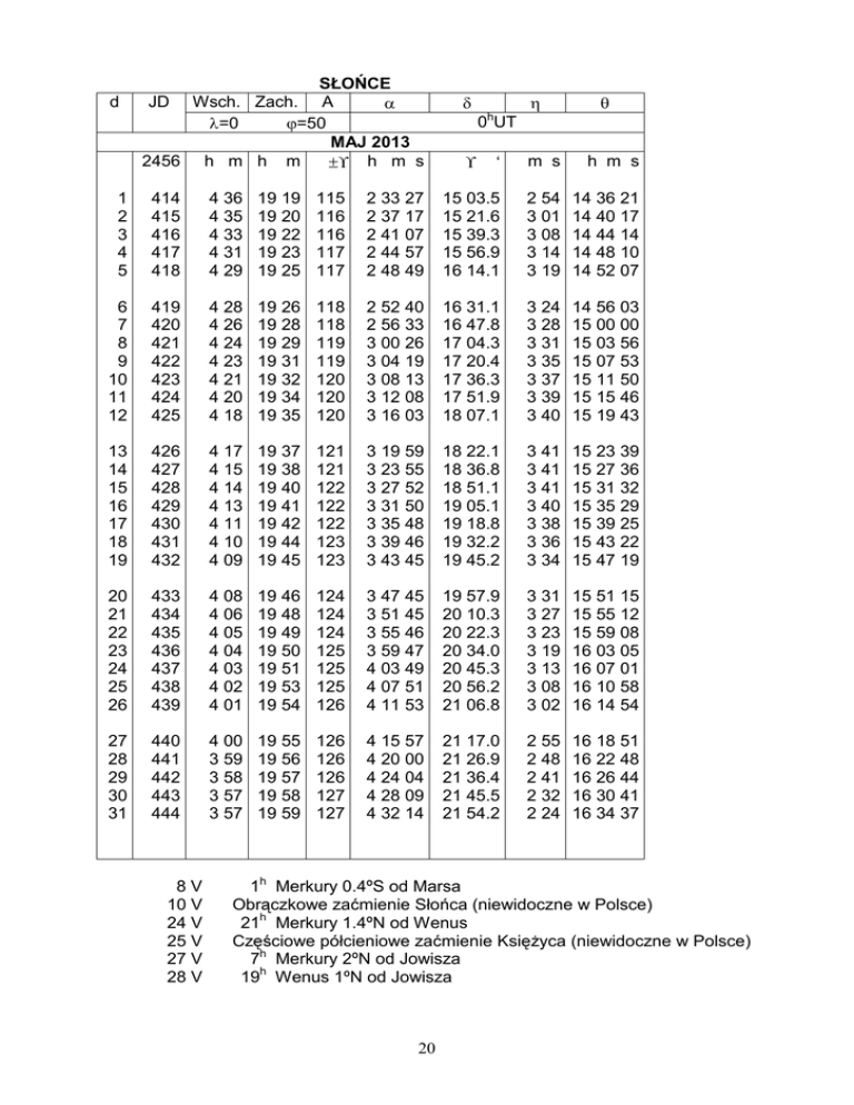 d SŁOŃCE JD Wsch. Zach. A α λ=0 ϕ=50 MAJ 2013 2456 h m h m ±° h m s δ η h θ 0 UT ° ‘ m s h m s 1 2 3 4 5 414 415 416 417 418 4 36 4 35 4 33 4 31 4 29 19 19 19 20 19 22 19 23 19 25 115 116 116 117 117 2 33 27 2 37 17 2 41 07 2 44 57 2 48 49 15 03.5 15 21.6 15 39.3 15 56.9 16 14.1 2 54 3 01 3 08 3 14 3 19 14 36 21 14 40 17 14 44 14 14 48 10 14 52 07 6 7 8 9 10 11 12 419 420 421 422 423 424 425 4 28 4 26 4 24 4 23 4 21 4 20 4 18 19 26 19 28 19 29 19 31 19 32 19 34 19 35 118 118 119 119 120 120 120 2 52 40 2 56 33 3 00 26 3 04 19 3 08 13 3 12 08 3 16 03 16 31.1 16 47.8 17 04.3 17 20.4 17 36.3 17 51.9 18 07.1 3 24 3 28 3 31 3 35 3 37 3 39 3 40 14 56 03 15 00 00 15 03 56 15 07 53 15 11 50 15 15 46 15 19 43 13 14 15 16 17 18 19 426 427 428 429 430 431 432 4 17 4 15 4 14 4 13 4 11 4 10 4 09 19 37 19 38 19 40 19 41 19 42 19 44 19 45 121 121 122 122 122 123 123 3 19 59 3 23 55 3 27 52 3 31 50 3 35 48 3 39 46 3 43 45 18 22.1 18 36.8 18 51.1 19 05.1 19 18.8 19 32.2 19 45.2 3 41 3 41 3 41 3 40 3 38 3 36 3 34 15 23 39 15 27 36 15 31 32 15 35 29 15 39 25 15 43 22 15 47 19 20 21 22 23 24 25 26 433 434 435 436 437 438 439 4 08 4 06 4 05 4 04 4 03 4 02 4 01 19 46 19 48 19 49 19 50 19 51 19 53 19 54 124 124 124 125 125 125 126 3 47 45 3 51 45 3 55 46 3 59 47 4 03 49 4 07 51 4 11 53 19 57.9 20 10.3 20 22.3 20 34.0 20 45.3 20 56.2 21 06.8 3 31 3 27 3 23 3 19 3 13 3 08 3 02 15 51 15 15 55 12 15 59 08 16 03 05 16 07 01 16 10 58 16 14 54 27 28 29 30 31 440 441 442 443 444 4 00 3 59 3 58 3 57 3 57 19 55 19 56 19 57 19 58 19 59 126 126 126 127 127 4 15 57 4 20 00 4 24 04 4 28 09 4 32 14 21 17.0 21 26.9 21 36.4 21 45.5 21 54.2 2 55 2 48 2 41 2 32 2 24 16 18 51 16 22 48 16 26 44 16 30 41 16 34 37 8V 10 V 24 V 25 V 27 V 28 V 1h Merkury 0.4ºS od Marsa Obrączkowe zaćmienie Słońca (niewidoczne w Polsce) 21h Merkury 1.4ºN od Wenus Częściowe półcieniowe zaćmienie Księżyca (niewidoczne w Polsce) 7h Merkury 2ºN od Jowisza 19h Wenus 1ºN od Jowisza 20