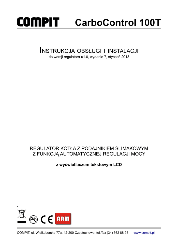CarboControl 100T INSTRUKCJA OBSŁUGI I INSTALACJI do wersji regulatora u1.0, wydanie 7, styczeń 2013 REGULATOR KOTŁA Z PODAJNIKIEM ŚLIMAKOWYM Z FUNKCJĄ AUTOMATYCZNEJ REGULACJI MOCY z wyświetlaczem tekstowym LCD - Pb COMPIT, ul. Wielkoborska 77a, 42-200 Częstochowa, tel./fax (34) 362 88 95 www.compit.pl Spis treści 1 Opis regulatora........................................................................................................................3 1.1 Realizowane funkcje........................................................................................................3 1.2 Skład zestawu..................................................................................................................4 1.3 Schemat instalacji obsługiwanej przez regulator CarboControl 100T.............................4 1.4 Dane techniczne..............................................................................................................5 2 Zasady bezpieczeństwa..........................................................................................................5 3 Pozbywanie się urządzeń elektrycznych i elektronicznych.....................................................6 4 Montaż.....................................................................................................................................6 4.1 Warunki środowiskowe....................................................................................................6 4.2 Instalowanie panelu sterującego.....................................................................................6 4.3 Instalowanie modułu wykonawczego...............................................................................7 4.4 Podłączenie zasilania i obwodów 230V...........................................................................8 4.5 Przewody uziemiające.....................................................................................................8 4.6 Montaż i podłączenie czujnika ......................................................................................10 4.7 Podłączenie termostatu pokojowego.............................................................................10 4.8 Podłączenie cyfrowego modułu sterującego NANO......................................................10 4.9 Podłączenie zabezpieczenie termicznego STB.............................................................11 5 Obsługa regulatora i opis działania.......................................................................................12 5.1 Opis panelu sterującego................................................................................................12 5.2 Sygnalizacja trybu pracy................................................................................................12 5.3 Ustawianie temperatury zadanej kotła...........................................................................13 5.4 Funkcja LATO – praca kotła tylko do ładowania CW.....................................................13 5.5 Ustawianie parametrów regulatora................................................................................14 5.6 Powrót do nastaw fabrycznych......................................................................................14 5.7 Opis trybów pracy..........................................................................................................15 5.7.1 Tryb Wyłączenie.....................................................................................................15 5.7.2 Tryb Rozpalanie......................................................................................................15 5.7.3 Tryb Praca...............................................................................................................16 5.7.4 Bieg0.......................................................................................................................18 5.7.5 Tryb PRZEGRZANIE..............................................................................................18 5.7.6 Tryb WYGASZENIE................................................................................................19 5.8 Praca pompy CO............................................................................................................19 5.9 Obsługa zasobnika CW.................................................................................................19 5.10 Sterylizacja zasobnika CW..........................................................................................20 5.11 Praca z termostatem pokojowym.................................................................................20 5.12 Zabezpieczenie przed przegrzaniem podajnika..........................................................20 5.13 Opis stanów alarmowych.............................................................................................20 5.14 Lista parametrów..........................................................................................................22 DEKLARACJA ZGODNOŚCI...................................................................................................27 2 Instrukcja obsługi regulatora CarboControl 100T u1.0, wydanie 7, styczeń 2013 1 Opis regulatora 1.1 Realizowane funkcje Regulator CarboControl 100T jest przeznaczony do sterowania kotłem na paliwo stałe z podajnikiem ślimakowym (retortowym). ✔ System automatycznego dobierania biegu kotła – dostosowuje moc kotła do zmieniającego się zapotrzebowania. Dzięki temu proces spalania staje się bardziej ekonomiczny, a obsługa kotła nie wymaga ręcznego dobierania nastaw. ✔ Podświetlany tekstowy wyświetlacz LCD, ułatwia obsługę regulatora. ✔ Sterowanie obiegiem CO - regulator steruje pracą pompy CO, zabezpieczając kocioł przed zbyt niską temperaturą, co wydatnie zwiększa żywotność kotła. ✔ Sterowanie ładowaniem zasobnika CWU - temperatura zasobnika ciepłej wody jest stale mierzona i jeśli zajdzie tak