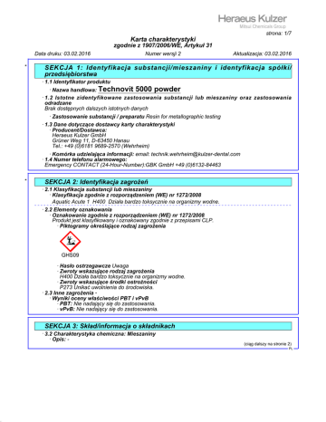 42.0.11 strona: 1/7 Karta charakterystyki zgodnie z 1907/2006/WE, Artykuł 31 Data druku: 03.02.2016 * Numer wersji 2 Aktualizacja: 03.02.2016 SEKCJA 1: Identyfikacja substancji/mieszaniny i identyfikacja spółki/ przedsiębiorstwa · 1.1 Identyfikator produktu · Nazwa handlowa: Technovit 5000 powder · 1.2 Istotne zidentyfikowane zastosowania substancji lub mieszaniny oraz zastosowania odradzane Brak dostępnych dalszych istotnych danych · Zastosowanie substancji / preparatu Resin for metallographic testing · 1.3 Dane dotyczące dostawcy karty charakterystyki · Producent/Dostawca: Heraeus Kulzer GmbH Grüner Weg 11, D-63450 Hanau Tel.: +49 (0)6181 9689-2570 (Wehrheim) · Komórka udzielająca informacji: email: [email protected] · 1.4 Numer telefonu alarmowego: Emergency CONTACT (24-Hour-Number):GBK GmbH +49 (0)6132-84463 * SEKCJA 2: Identyfikacja zagrożeń · 2.1 Klasyfikacja substancji lub mieszaniny · Klasyfikacja zgodnie z rozporządzeniem (WE) nr 1272/2008 Aquatic Acute 1 H400 Działa bardzo toksycznie na organizmy wodne. · 2.2 Elementy oznakowania · Oznakowanie zgodnie z rozporządzeniem (WE) nr 1272/2008 Produkt jest klasyfikowany i oznakowany zgodnie z przepisami CLP. · Piktogramy określające rodzaj zagrożenia GHS09 · Hasło ostrzegawcze Uwaga · Zwroty wskazujące rodzaj zagrożenia H400 Działa bardzo toksycznie na organizmy wodne. · Zwroty wskazujące środki ostrożności P273 Unikać uwolnienia do środowiska. · 2.3 Inne zagrożenia · Wyniki oceny właściwości PBT i vPvB · PBT: Nie nadający się do zastosowania. · vPvB: Nie nadający się do zastosowania. SEKCJA 3: Skład/informacja o składnikach · 3.2 Charakterystyka chemiczna: Mieszaniny · Opis: - (ciąg dalszy na stronie 2) PL 42.0.11 Karta charakterystyki strona: 2/7 zgodnie z 1907/2006/WE, Artykuł 31 Data druku: 03.02.2016 Nazwa handlowa: Technovit Numer wersji 2 Aktualizacja: 03.02.2016 5000 powder (ciąg dalszy od strony 1) · Składniki niebezpieczne: CAS: 7440-50-8 copper Aquatic Acute 1, H400 CAS: 94-36-0 nadtlenek dibenzoilu Reg.nr.: 01-2119511472-50 Self-react. B, H241; Org. Perox. B, H241; Aquatic Acute 1, H400; Eye Irrit. 2, H319; Skin Sens. 1, H317 · Wskazówki dodatkowe: Pełna treść przytoczonych wskazówek dotyczących zagrożeń znajduje się w rozdziale 16. * > 90% < 1% SEKCJA 4: Środki pierwszej pomocy · 4.1 Opis środków pierwszej pomocy · Wskazówki ogólne: Środki specjalne nie są konieczne. · Po styczności ze skórą: Natychmiast zmyć wodą i mydłem i dobrze spłukać. W przypadku trwałego podrażnienia skóry zgłosić się do lekarza. · Po styczności z okiem: Przepłukać oczy z otwartą powieką przez kilka minut pod bieżącą wodą i zasięgnąć porady lekarza. · Po przełknięciu: Przepłukać jamę ustną i obficie popić wodą. Przy trwałych dolegliwościach porozumieć się z lekarzem. · 4.2 Najważniejsze ostre i opóźnione objawy oraz skutki narażenia Brak dostępnych dalszych istotnych danych · 4.3 Wskazania dotyczące wszelkiej natychmiastowej pomocy lekarskiej i szczególnego postępowania z poszkodowanym Brak dostępnych dalszych istotnych danych * SEKCJA 5: Postępowanie w przypadku pożaru · 5.1 Środki gaśnicze · Przydatne środki gaśnicze: CO2, proszek gaśniczy lub strumień wody. Większy pożar zwalczać strumieniem wody lub pianą odporną na działanie alkoholu. · 5.2 Szczególne zagrożenia związane z substancją lub mieszaniną Brak dostępnych dalszych istotnych danych · 5.3 Informacje dla straży pożarnej · Specjalne wyposażenie ochronne: Środki specjalne nie są konieczne. · Inne dane - * SEKCJA 6: Postępowanie w przypadku niezamierzonego uwolnienia do środowiska · 6.1 Indywidualne środki ostrożności, sprzęt ochronny i procedury w sytuacjach awaryjnych Nosić ubranie ochronne. Osoby żagrozone przenieść w bezpieczne miejsce. · 6.2 Środki ostrożności w zakresie ochrony środowiska: Nie dopuścić do przeniknięcia do kanalizacji /wód powierzchniowych /wód gruntowych. Nie dopuścić do przedostania się do podłoża /ziemi. (ciąg dalszy na stronie 3) PL 42.0.11 Karta charakterystyki strona: 3/7 zgodnie z 1907/2006/WE, Artykuł 31 Data druku: 03.02.2016 Nazwa handlowa: Technovit Numer wersji 2 Aktualizacja: 03.02.2016 5000 powder (ciąg dalszy od strony 2) · 6.3 Metody i materiały zapobiegające rozprzestrzenianiu się skażenia i służące do usuwania skażenia: Zdjąć mechanicznie. · 6.4 Odniesienia do innych sekcji Informacje na temat osobistego wyposażenia ochronnego patrz rozdział 8. * SEKCJA 7: Post ępowanie z substancjami i mieszaninami oraz ich magazynowanie · 7.1 Środki ostrożności dotyczące bezpiecznego postępowania Nosić ubranie ochronne. Osoby żagrozone przenieść w bezpieczne miejsce. · Wskazówki dla ochrony przeciwpożarowej i przeciwwybuchowej: Nie są potrzebne szczególne zabiegi. · 7.2 Warunki bezpiecznego magazynowania, w tym informacje dotyczące wszelkich wzajemnych niezgodności · Składowanie: · Wymagania w stosunku do pomieszczeń składowych i zbiorników: Brak szczególnych wymagań. · Wskazówki odnośnie wspólnego składowania: Nie konieczne. · Dalsze wskazówki odnośnie warunków składowania: Przechowywać w chłodnym miejscu (poniżej temperatury pokojowej) · 7.3 Szczególne zastosowanie(-a) końcowe Brak dostępnych dalszych istotnych danych * SEKCJA 8: Kontrola narażenia/środki ochrony indywidualnej · Dodatkowe wskazówki dla wykonania urządzeń technicznych: Brak dalszych danych, patrz punkt 7. · 8.1 Parametry dotyczące kontroli · Składniki wraz z kontrolowanymi wartościami granicznymi zależnymi od miejsca pracy: Produkt nie zawiera znaczących ilości materiałów, których wartości graniczne musiałyby być kontrolowane pod kątem warunków miejsca pracy. · Wskazówki dodatkowe: Podstawą były aktualnie obowiązujące wykazy. · 8.2 Kontrola narażenia · Osobiste wyposażenie ochronne: · Ogólne środki ochrony i higieny