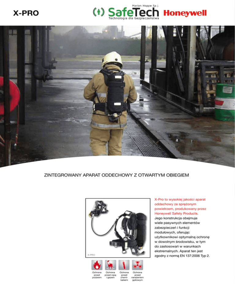 X-PRO ZINTEGROWANY APARAT ODDECHOWY Z OTWARTYM OBIEGIEM X-Pro to wysokiej jakości aparat oddechowy ze sprężonym powietrzem, produkowany przez Honeywell Safety Products. Jego konstrukcja obejmuje wiele pasywnych elementów zabezpieczeń i funkcji modułowych, oferując użytkownikowi optymalną ochronę w dowolnym środowisku, w tym do zastosowań w warunkach ekstremalnych. Aparat ten jest zgodny z normą EN 137:2006 Typ 2. X-PRO Ochrona przed pożarem Ochrona przed ropą i gazem Ochrona przed chemi kaliami Ochrona przed narażeniem jądrowym Opracowany z myślą o potrzebach profesjonalistów Materiały użyte do produkcji aparatu X-Pro to połączenie komfortu i wysokiej jakości. Są one odporne na nieprzyjazne warunki, takie jak ekstremalnie wysoka temperatura lub ochlapanie chemikaliami i zapewniają niezrównaną trwałość oraz długi okres użytkowania. KOMFORT • Ultralekki stelaż na plecy, o regulowanej wysokości zapewnia dostosowanie do każdego kształtu ciała • Wygodne poduszki na ramiona oraz pas na talię i górne paski na barki wykonano z włókien poddanych termokompresji PROSTOTA BEZPIECZEŃSTWO • Wiele uszu kotwicznych na akcesoria • Ruchoma i składana stopa chroni cylinder i system wysokiego ciśnienia przed uderzeniami • Regulowane sprzączki szybkozaciskowe • Regulowany pasek cylindra • Reduktor z wbudowanym wyjściem dla drugiego użytkownika, umożliwiający dostarczanie tlenu do dodatkowej maski ratowniczej, pełnej maski na twarz lub do podłączenia przewodu oddechowego • Przy minimalnej obsłudze, aparat X-Pro pozwala na oszczędność czasu przeznaczonego na czynności konserwacyjne, aby aparat był zawsze gotowy do użycia, co zmniejsza koszty cyklu życia • Paski zaokrąglone na ramionach, zaprojektowane specjalnie do przenoszenia aparatu na ramionach, niezależnie od tego, w jakiej pozycji znajduje się użytkownik lub jak się porusza • Pełna maska na twarz Opti-Pro, z przezroczystą osłoną z poliwęglanu odporną na uderzenia i powłoką chroniącą przed zarysowaniami, zapewnia szerokie pole widzenia bez optycznych zniekształceń. Element twarzowy i wewnętrzna półmaska wykonane z wysokiej jakości silikonu, zapewniającego większą trwałość i optymalny komfort użytkowania. • Nadciśnieniowy zawór dozujący Sx-Pro do szybkiego montażu jest aktywowany przy pierwszym oddechu. Kompaktowy, ergonomiczny i trwały, zapewnia doskonały komfort oddychania przy dowolnym tempie pracy dzięki minimalnej oporności oddechowej. Wyposażony jest w dwa duże punkty mocowania i dzięki temu można go łatwo przymocować lub usunąć, nawet w rękawicach. www.honeywellsafety.com • Antystatyczne i giętkie węże HP i MP wbudowane w tylny stelaż zapewniają optymalną ochronę i bezpieczeństwo • Ognioodporne i fotoluminescencyjne paski na ramiona i pas na talię System regulacji w tylnym stelażu Wystarczy jeden ruch: dwie regulowane wysokości Wbudowana oś umożliwia dostosowanie aparatu do ruchów użytkownika Tylny stelaż zaprojektowany dla optymalnego komfortu użytkowania Tylny stelaż X-Pro, wykonany z antystatycznego żywicznego polimeru, został opracowany podczas badań morfologicznych, tak aby pasował do kształtu ciała, zapewniając idealne rozłożenie masy i optymalny komfort. Ruchoma stopa chroni system wysokiego ciśnienia Boczne uchwyty do przenoszenia Ruchoma i składana stopa amortyzuje uderzenia, które w innym wypadku mogłyby uszkodzić system wysokiego ciśnienia. Zapewnia też kluczowe bezpieczeństwo, przez redukcję ryzyka uszkodzenia zaworu cylindra lub reduktora. Obracający się pas na udo Ruchomy tylny stelaż umożliwiający ruch użytkownika. www.honeywellsafety.com Wbudowane węże HP i MP Dla lepszej ochrony węże wysokiego i średniego ciśnienia są wbudowane w tylny stelaż, co ogranicza ryzyko uszkodzenia. DANE TECHNICZNE Całkowita masa kompletnego aparatu bez cylindra z powietrzem Około 3,9 kg Miernik pneumatyczny wysokiego ciśnienia 0–400 barów, miernik fotoluminescencyjny, gumowe zabezpieczenie i zintegrowany gwizdek alarmu Aktywacja alarmu 55 ± 5 barów Głośność alarmu > 90 dBA Zakres temperatur, w jakich działa aparat -30°C/+60°C Aparaty spełniają wymagania norm EN 137 Typ 2: 2006, SOLAS, MED, IMO, MSC, AS/NZS 2003 Zatwierdzone do użytku jako pełna maska na twarz Klasa III według normy EN 136 INFORMACJE DOTYCZĄCE ZAMAWIANIA NUMER ODNIESIENIA Aparat X-Pro z zaworem Sx-Pro (LDV) i pełną maską na twarz Opti-Pro, z 5-punktowym paskiem na głowę i szybkim złączem MP 1824219 6-litrowy stalowy cylinder powietrza pod ciśnieniem 300 barów (pusty) 1822552 6,9-litrowy kompozytowy (20 lat) cylinder powietrza pod ciśnieniem 300 barów (pusty) 1819661 Drugie wyjście pod średnim ciśnieniem, CEJN 1822500 Dodatkowa maska ratownicza CEJN 1823182 Inne dostępne opcje: aby uzyskać szczegółowe informacje, skontaktuj się z nami. Dostępna jest wersja ATEX Dostępna jest wersja z miernikiem elektronicznym Prowadź do bezpieczeństwa – zbuduj trwałą kulturę bezpieczeństwa, w której pracownicy chętnie korzystają z bezpieczniejszych rozwiązań: honeywellsafety.com HONEYWELL SAFETY PRODUCTS POLSKA Honeywell Sp. z o. o. ul. Kalwaryjska 69 30-504 Kraków Phone: + 48 12 656 57 31 Fax: + 48 12 656 14 54 Email: [email protected] www.honeywellsafety.com DOC3082 - 11/2013 © 2013 Honeywell International Inc.