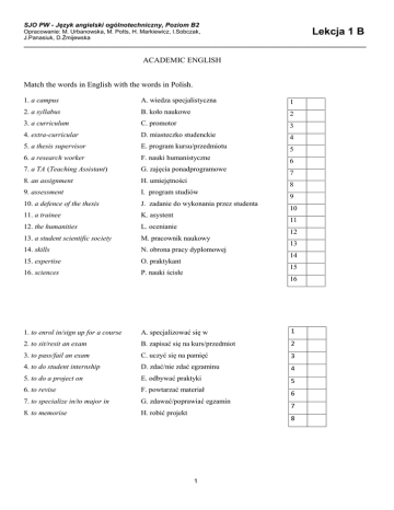 SJO PW - Język angielski ogólnotechniczny, Poziom B2 Lekcja 1 B Opracowanie: M. Urbanowska, M. Potts, H. Markiewicz, I.Sobczak, J.Panasiuk, D.Żmijewska _____________________________________________________________________________________________ ACADEMIC ENGLISH Match the words in English with the words in Polish. 1. a campus A. wiedza specjalistyczna 1 2. a syllabus B. koło naukowe 2 3. a curriculum C. promotor 3 4. extra-curricular D. miasteczko studenckie 4 5. a thesis supervisor E. program kursu/przedmiotu 5 6. a research worker F. nauki humanistyczne 7. a TA (Teaching Assistant) G. zajęcia ponadprogramowe 8. an assignment H. umiejętności 9. assessment I. program studiów 10. a defence of the thesis J. zadanie do wykonania przez studenta 11. a trainee K. asystent 12. the humanities L. ocenianie 13. a student scientific society M. pracownik naukowy 14. skills N. obrona pracy dyplomowej 15. expertise O. praktykant 16. sciences P. nauki ścisłe 6 7 8 9 10 11 12 13 14 15 16 1. to enrol in/sign up for a course A. specjalizować się w 1 2. to sit/resit an exam B. zapisać się na kurs/przedmiot 2 3. to pass/fail an exam C. uczyć się na pamięć 3 4. to do student internship D. zdać/nie zdać egzaminu 4 5. to do a project on E. odbywać praktyki 5 6. to revise F. powtarzać materiał 6 7. to specialize in/to major in G. zdawać/poprawiać egzamin 7 8. to memorise H. robić projekt 8 1 SJO PW - Język angielski ogólnotechniczny, Poziom B2 Lekcja 1 B Opracowanie: M. Urbanowska, M. Potts, H. Markiewicz, I.Sobczak, J.Panasiuk, D.Żmijewska _____________________________________________________________________________________________ TASKS 1. Complete each space with a suitable word. The first letter of each word is given. (adapted from Advanced Language Practice) 1. I left school without any q................................, and with no real job p................................ . But then I decided to a................................ to our local university and now I’m a proud g................................ of Modern Languages Department. 2. I was never good at exams. For my A levels I r................................ solidly for three months, but despite all this preparation I got disappointing g................................: D for Physics, E for Chemistry and E for Maths. The school suggested that I r................................ the exams but I gave up. 3. In the company I work for I was the only one without a diploma, so I made up my mind to start e................................ studies. S.......................... at weekends was hard. But now d................................ in Electrical Engineering. 2. Decide which answer A, B, C or D best fits each space: 1. If you fail an exam, you have to … … … . it. a) sit b) resit c) memorise d) revise 2. I’m really interested in this course. I’m planning to … … … . it tomorrow. a) sign up for b) enrol up c) enrol d) sign off for 3. I need some help in writing my thesis, so next week I’m meeting my … … … .. . a) research worker b) supervisor c) dean d) graduate c) full-time d) postgraduate c) campus d) student book 4. Do you prefer … … … . or extramural studies? a) PhD b) MSc 5. I have all my credit written in my … … … .. . a) hall of residence b) internship 6. I’m afraid we don’t have analytical chemistry in our… … … . . a) syllabus b) curriculum c) assignment d) assessment 7. Jim would like to live in a … … … . to be independent of his family. a) student’s hostel b) faculty c) hall of residence d) lab 8. In an undergraduate course of study we’re working on our … … … . degree. a) PhD b) master’s c) bachelor’s d) graduate 9. The pub? Sure, but not today. I have to … … … . before the exam. a) memorise b) repeat c) resit d) revise 10. I’ve applied for a/an … … … . at Toyota and hope I can do it there. a) internship b) project c) defence 2 d) scholarship I have a SJO PW - Język angielski ogólnotechniczny, Poziom B2 Opracowanie: M. Urbanowska, M. Potts, H. Markiewicz, I.Sobczak, J.Panasiuk, D.Żmijewska Lekcja 1 B _____________________________________________________________________________________________ Try to guess the answers to the following questions: 1. What does WUT stand for? 2. What is the name of your faculty? 3. When did WUT start (century)? 4. When did classes start again after WWII? 5. How many faculties are there? 6. What is the name of the current Rector? 7. How many Vice-Rectors are there? 8. What are the 3 oldest faculties? 3