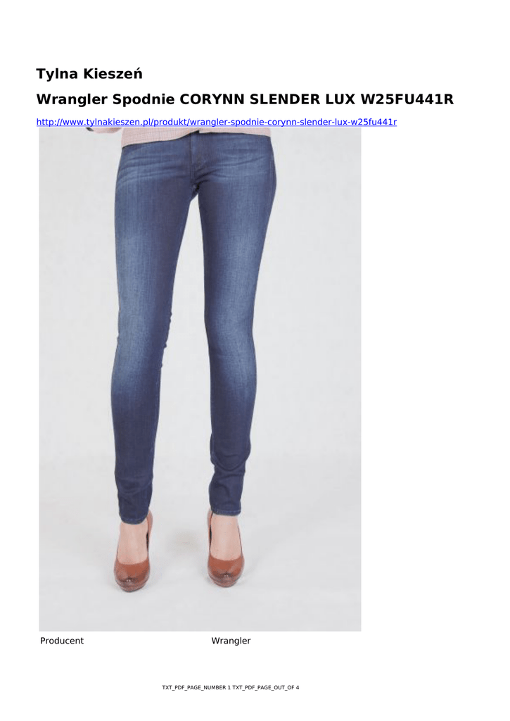 Tylna Kieszeń Wrangler Spodnie CORYNN SLENDER LUX W25FU441R http://www.tylnakieszen.pl/produkt/wrangler-spodnie-corynn-slender-lux-w25fu441r Producent Wrangler TXT_PDF_PAGE_NUMBER 1 TXT_PDF_PAGE_OUT_OF 4 Cena 239.00 PLN Cena netto 194.31 PLN L-Model Jade 0 Jade Zip 0 Logger 0 Lynn Skinny 0 Lynn Straight 0 Marion Straight 0 Marlin 0 Scarlett 0 Lynn Narrow 0 Capri 0 Hotpant 0 Jade Seasonal 0 Scarlett Cropped 0 Skyler 0 Pixley 0 L-Fason Bardzo dopasowana nogawka (Skinny Fit) 0 Prosta nogawka (Straight Fit) 0 Lekko rozszerzana nogawka (Boot Fit) 0 Luźna nogawka (Loose Fit) 0 Krótkie spodenki 0 Komfortowa nogawka (Ralaxed Fit) 0 Rozszerzana nogawka (Boot Cut) 0 Boyfriend 0 W-Model Bridget 0 Corynn 1 Courtney 0 Drew 0 TXT_PDF_PAGE_NUMBER 2 TXT_PDF_PAGE_OUT_OF 4 Molly 0 Sara 0 Shennan 0 Tina 0 Sara Narrow 0 Jaclyn 0 W-Fason Bardzo dopasowana nogawka (Skinny) 1 Dopasowana nogawka (Slim) 0 Regularna nogawka (Regular) 0 Lekko rozszerzana nogawka (Bootcut) 0 Krótkie spodenki 0 Numer katalogowy Numer katalogowy W25FU441R Stan Niski 0 Średni 1 Wysoki 1 Kolor Ciemny jeans 1 Pośredni jeans 0 Jasny jeans 0 Kolorowy 0 Czarny 0 Nazwa koloru Nazwa koloru SLENDER LUX Wytarcie Mocne 0 Pośrednie 1 Delikatne 0 Brak 0 Skład materiału TXT_PDF_PAGE_NUMBER 3 TXT_PDF_PAGE_OUT_OF 4 Bawełna 90% Elastan 10% Stretch Jest 1 Stretch Deluxe 0 Super Stretch 0 Stretch Power 0 Brak 0 Live in Denim 0 TXT_PDF_PAGE_NUMBER 4 TXT_PDF_PAGE_OUT_OF 4