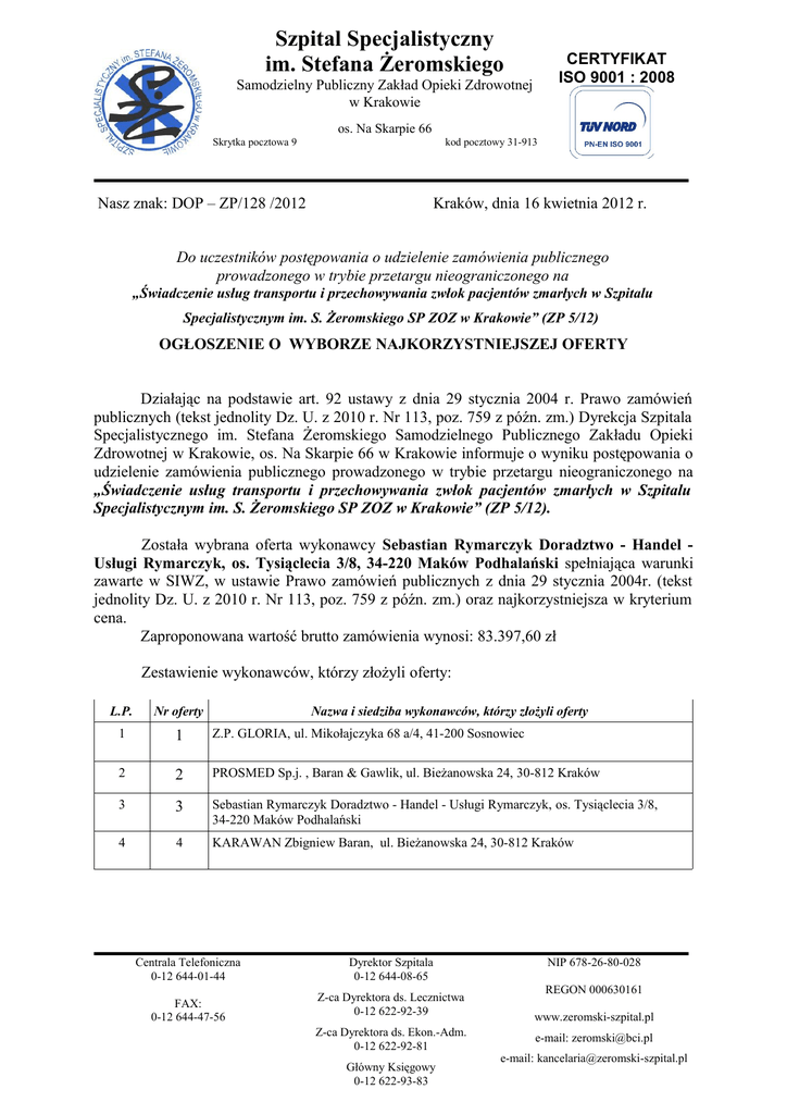 Szpital Specjalistyczny im. Stefana Żeromskiego CERTYFIKAT ISO 9001 : 2008 Samodzielny Publiczny Zakład Opieki Zdrowotnej w Krakowie os. Na Skarpie 66 Skrytka pocztowa 9 Nasz znak: DOP – ZP/128 /2012 kod pocztowy 31-913 Kraków, dnia 16 kwietnia 2012 r. Do uczestników postępowania o udzielenie zamówienia publicznego prowadzonego w trybie przetargu nieograniczonego na „Świadczenie usług transportu i przechowywania zwłok pacjentów zmarłych w Szpitalu Specjalistycznym im. S. Żeromskiego SP ZOZ w Krakowie” (ZP 5/12) OGŁOSZENIE O WYBORZE NAJKORZYSTNIEJSZEJ OFERTY Działając na podstawie art. 92 ustawy z dnia 29 stycznia 2004 r. Prawo zamówień publicznych (tekst jednolity Dz. U. z 2010 r. Nr 113, poz. 759 z późn. zm.) Dyrekcja Szpitala Specjalistycznego im. Stefana Żeromskiego Samodzielnego Publicznego Zakładu Opieki Zdrowotnej w Krakowie, os. Na Skarpie 66 w Krakowie informuje o wyniku postępowania o udzielenie zamówienia publicznego prowadzonego w trybie przetargu nieograniczonego na „Świadczenie usług transportu i przechowywania zwłok pacjentów zmarłych w Szpitalu Specjalistycznym im. S. Żeromskiego SP ZOZ w Krakowie” (ZP 5/12). Została wybrana oferta wykonawcy Sebastian Rymarczyk Doradztwo - Handel Usługi Rymarczyk, os. Tysiąclecia 3/8, 34-220 Maków Podhalański spełniająca warunki zawarte w SIWZ, w ustawie Prawo zamówień publicznych z dnia 29 stycznia 2004r. (tekst jednolity Dz. U. z 2010 r. Nr 113, poz. 759 z późn. zm.) oraz najkorzystniejsza w kryterium cena. Zaproponowana wartość brutto zamówienia wynosi: 83.397,60 zł Zestawienie wykonawców, którzy złożyli oferty: L.P. Nr oferty Nazwa i siedziba wykonawców, którzy złożyli oferty 1 1 Z.P. GLORIA, ul. Mikołajczyka 68 a/4, 41-200 Sosnowiec 2 2 PROSMED Sp.j. , Baran & Gawlik, ul. Bieżanowska 24, 30-812 Kraków 3 3 Sebastian Rymarczyk Doradztwo - Handel - Usługi Rymarczyk, os. Tysiąclecia 3/8, 34-220 Maków Podhalański 4 4 KARAWAN Zbigniew Baran, ul. Bieżanowska 24, 30-812 Kraków Centrala Telefoniczna 0-12 644-01-44 FAX: 0-12 644-47-56 Dyrektor Szpitala 0-12 644-08-65 Z-ca Dyrektora ds. Lecznictwa 0-12 622-92-39 Z-ca Dyrektora ds. Ekon.-Adm. 0-12 622-92-81 Główny Księgowy 0-12 622-93-83 NIP 678-26-80-028 REGON 000630161 www.zeromski-szpital.pl e-mail: [email protected] e-mail: [email protected] Szpital Specjalistyczny im. Stefana Żeromskiego CERTYFIKAT ISO 9001 : 2008 Samodzielny Publiczny Zakład Opieki Zdrowotnej w Krakowie os. Na Skarpie 66 Skrytka pocztowa 9 kod pocztowy 31-913 Zestawienie wykonawców wraz ze streszczeniem oceny i porównaniem złożonych ofert: L.P. 1 Nr oferty 1 2 3 Nazwa i siedziba wykonawców, którzy złożyli oferty Z.P. GLORIA, ul. Mikołajczyka 68 a/4, 41- Punktacja w kryterium cena 43,33 pkt. Łączna punktacja 100 pkt. 100 pkt. 200 Sosnowiec Sebastian Rymarczyk Doradztwo - Handel Usługi Rymarczyk, os. Tysiąclecia 3/8, 34220 Maków Podhalański 43,33 pkt. Ogłoszenie powyższe przekazane zostanie wszystkim uczestnikom postępowania, zamieszczone na stronie internetowej Szpitala oraz umieszczone na tablicy ogłoszeń w siedzibie Zamawiającego od dnia 17 kwietnia 2012 r. Działając na podstawie art. 92 ust. 4 ustawy z dnia 29 stycznia 2004 r. Prawo zamówień publicznych (tekst jednolity Dz. U. z 2010 r. Nr 113, poz. 759 z późn. zm.) Dyrekcja Szpitala informuje, że umowa zostanie zawarta zgodnie z art. 94 ustawy Prawo zamówień publicznych tj 23 kwietnia 2012 r. Dziękujemy za udział w procedurze przetargowej. Centrala Telefoniczna 0-12 644-01-44 FAX: 0-12 644-47-56 Dyrektor Szpitala 0-12 644-08-65 Z-ca Dyrektora ds. Lecznictwa 0-12 622-92-39 Z-ca Dyrektora ds. Ekon.-Adm. 0-12 622-92-81 Główny Księgowy 0-12 622-93-83 NIP 678-26-80-028 REGON 000630161 www.zeromski-szpital.pl e-mail: [email protected] e-mail: [email protected]