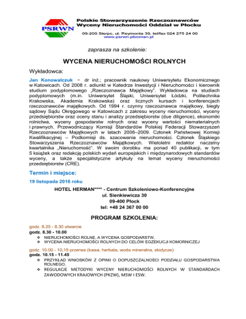zaprasza na szkolenie: WYCENA NIERUCHOMOŚCI ROLNYCH Wykładowca: Jan Konowalczuk − dr inż.; pracownik naukowy Uniwersytetu Ekonomicznego w Katowicach. Od 2008 r. adiunkt w Katedrze Inwestycji i Nieruchomości i kierownik studium podyplomowego „Rzeczoznawca Majątkowy”. Wykładowca na studiach podyplomowych (m.in. Uniwersytet Śląski, Uniwersytet Łódzki, Politechnika Krakowska, Akademia Krakowska) oraz licznych kursach i konferencjach rzeczoznawców majątkowych. Od 1994 r. czynny rzeczoznawca majątkowy, biegły sądowy Sądu Okręgowego w Katowicach z zakresu wyceny nieruchomości, wyceny przedsiębiorstw oraz oceny stanu i analizy przedsiębiorstw (due diligence), ekonomiki rolnictwa, wyceny gospodarstw rolnych oraz wyceny wartości niematerialnych i prawnych. Przewodniczący Komisji Standardów Polskiej Federacji Stowarzyszeń Rzeczoznawców Majątkowych w latach 2006–2009. Członek Państwowej Komisji Kwalifikacyjnej – Podkomisji ds. szacowania nieruchomości. Członek Śląskiego Stowarzyszenia Rzeczoznawców Majątkowych. Wieloletni redaktor naczelny kwartalnika „Nieruchomość”. W swoim dorobku ma ponad 40 publikacji, w tym 5 książek oraz redakcję polskich wydań europejskich i międzynarodowych standardów wyceny, a także specjalistyczne artykuły na temat wyceny nieruchomości przedsiębiorstw (CRE). Termin i miejsce: 19 listopada 2016 roku HOTEL HERMAN**** - Centrum Szkoleniowo-Konferencyjne ul. Sienkiewicza 30 09-400 Płock tel: +48 24 367 00 00 PROGRAM SZKOLENIA: godz. 8.25 - 8.30 otwarcie godz. 8.30 - 10.00 NIERUCHOMOŚCI ROLNE, A WYCENA GOSPODARSTW, WYCENA NIERUCHOMOŚCI ROLNYCH DO CELÓW EGZEKUCJI KOMORNICZEJ godz. 10.00 - 10,15 przerwa (kawa, herbata, woda mineralna, słodycze) godz. 10.15 - 11.45 PRZYKŁAD WNIOSKÓW Z OPINII O DOPUSZCZALNOŚCI PODZIAŁU GOSPODARSTWA ROLNEGO, REGULACJE METODYKI WYCENY NIERUCHOMOŚCI ROLNYCH W STANDARDACH ZAWODOWYCH KRAJOWYCH (PKZW), MSW I ESW. godz. 11.45 - 12.15 obiad godz. 12.15 - 13.45 REGULACJE METODYKI WYCENY NIERUCHOMOŚCI ROLNYCH W STANDARDACH ZAWODOWYCH KRAJOWYCH (PKZW), MSW I ESW (CD), ZASADY STOSOWANIA PODEJŚCIA PORÓWNAWCZEGO DO WYCENY NIERUCHOMOŚCI ROLNYCH - UWZGLĘDNIANIE W OPERATACH SZACUNKOWYCH ZMIAN PRAWA OGRANICZAJĄCEGO WOLNOKONKURENCYJNY OBRÓT GRUTAMI ROLNYMI. godz. 13.45 - 14,00 przerwa (kawa, herbata, woda mineralna, słodycze) godz. 14,00 - 15.30 ZASADY STOSOWANIA PODEJŚCIA PORÓWNAWCZEGO DO WYCENY NIERUCHOMOŚCI ROLNYCH (CD), WYCENA NIERUCHOMOŚCI Z AKTYWAMI BIOLOGICZNYMI (DRZEWA I INNE ROŚLINY JAKO CZĘŚCI SKŁADOWE NIERUCHOMOŚCI). Łączny czas szkolenia - 8 godz. Odpłatność za szkolenie: 190 zł - rzeczoznawcy majątkowi (członkowie PSRWN Oddział w Płocku 160 zł), 233,70 zł brutto (190 zł + podatek VAT 23%) - pozostali uczestnicy, obejmuje koszty organizacyjne, materiały szkoleniowe, obiad, kawę, herbatę, wodę mineralną i słodycze. Zgłoszenia wraz z kopią przelewu należności na konto, podane w załączonej karcie zgłoszenia, prosimy przesłać w nieprzekraczalnym terminie do dnia 10.11.2016 r. (ilość miejsc ograniczona) na adres: Sebastian Gaza 09 - 500 Gostynin, ul. Kutnowska 81 lub pocztą elektroniczną na adres e-mail: [email protected] tel. kom. 793 555 988 Mapka dojazdowa (uwaga - ulica Sienkiewicza jednokierunkowa !!!) HOTEL HERMAN**** w Płocku to wielofunkcyjne Centrum Szkoleniowo Konferencyjne, mieszczące się w pięknej, zabytkowej kamienicy, w samym centrum Płocka, w sąsiedztwie najważniejszych atrakcji kulturalnych miasta. Prezes PSRWN Oddział Płock Adam Iller ZAPRASZAMY