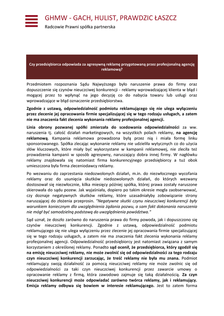 GHMW - GACH, HULIST, PRAWDZIC ŁASZCZ Radcowie Prawni spółka partnerska Czy przedsiębiorca odpowiada za agresywną reklamę przygotowaną przez profesjonalną agencję reklamową? Przedmiotem rozpoznania Sądu Najwyższego było naruszenie prawa do firmy oraz dopuszczenie się czynów nieuczciwej konkurencji - reklamy wprowadzającej klienta w błąd i mogącej przez to wpłynąć na jego decyzję co do nabycia towaru lub usługi oraz wprowadzające w błąd oznaczenie przedsiębiorstwa. Zgodnie z ustawą, odpowiedzialność podmiotu reklamującego się nie ulega wyłączeniu przez zlecenie jej opracowania firmie specjalizującej się w tego rodzaju usługach, a zatem nie ma znaczenia fakt zlecenia wykonania reklamy profesjonalnej agencji. Linia obrony pozwanej spółki zmierzała do scedowania odpowiedzialności za ww. naruszenia tj. całość działań marketingowych, na wszystkich polach reklamy, na agencję reklamową. Kampania reklamowa prowadzona byłą przez nią i miała formę linku sponsorowanego. Spółka zlecając wykonanie reklamy nie udzieliła wytycznych co do użycia słów kluczowych, które miały być wykorzystane w kampanii reklamowej, nie zleciła też prowadzenia kampanii w sposób agresywny, naruszający dobra innej firmy. W nagłówku reklamy znajdowała się natomiast firma konkurencyjnego przedsiębiorcy a tuż obok umieszczona była firma zleceniodawcy reklamy. Po wezwaniu do zaprzestania niedozwolonych działań, m.in. do niezwłocznego wycofania reklamy oraz do usunięcia skutków niedozwolonych działań, do których wezwany dostosował się niezwłocznie, kilka miesięcy później spółka, której prawa zostały naruszone skierowała do sądu pozew. Jak wyjaśniała, dopiero po takim okresie mogła zaobserwować, czy doznaje negatywnych skutków reklamy, które uzasadniałyby zobowiązanie strony naruszającej do złożenia przeprosin. "Negatywne skutki czynu nieuczciwej konkurencji były warunkiem koniecznym dla uwzględnienia żądania pozwu, a sam fakt dokonania naruszenia nie mógł być samodzielną podstawą do uwzględnienia powództwa." Sąd uznał, że doszło zarówno do naruszenia prawa do firmy powoda, jak i dopuszczono się czynów nieuczciwej konkurencji. Zgodnie z ustawą, odpowiedzialność podmiotu reklamującego się nie ulega wyłączeniu przez zlecenie jej opracowania firmie specjalizującej się w tego rodzaju usługach, a zatem nie ma znaczenia fakt zlecenia wykonania reklamy profesjonalnej agencji. Odpowiedzialność przedsiębiorcy jest natomiast związana z samym korzystaniem z określonej reklamy. Ponadto sąd ocenił, że przedsiębiorca, który zgodził się na emisję nieuczciwej reklamy, nie może zwolnić się od odpowiedzialności za tego rodzaju czyn nieuczciwej konkurencji zarzucając, że treść reklamy nie była mu znana. Podmiot reklamujący swoją działalność za pomocą nieuczciwej reklamy nie może zwolnic się od odpowiedzialności za taki czyn nieuczciwej konkurencji przez zawarcie umowy o opracowanie reklamy z firmą, która zawodowo zajmuje się taką działalnością. Za czyn nieuczciwej konkurencji może odpowiadać zarówno twórca reklamy, jak i reklamujący. Emisja reklamy odbywa się bowiem w interesie reklamującego. Jest to zatem forma GACH, HULIST, PRAWDZIC ŁASZCZ – RADCOWIE PRAWNI SP.P. korzystania z reklamy przez reklamującego i stanowi jego własne działanie także wówczas, gdy od strony technicznej emisją reklamy zajmuje się inny podmiot. Wyrok SN z dnia 9 kwietnia 2015 r. sygn. akt II CSK 338/14 Autor: Joanna Gaik, aplikant radcowski w Kancelarii GHMW – Gach, Hulist, Prawdzic Łaszcz – radcowie prawni spółka partnerska.