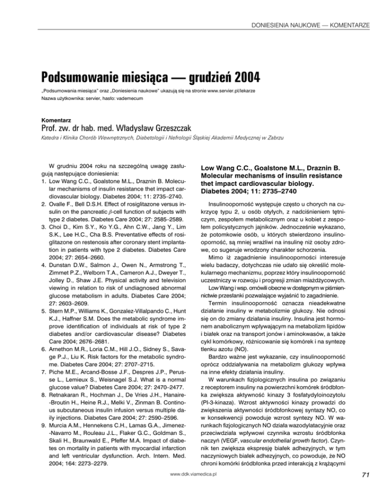 DONIESIENIA NAUKOWE — KOMENTARZE Podsumowanie miesiąca — grudzień 2004 „Podsumowania miesiąca” oraz „Doniesienia naukowe” ukazują się na stronie www.servier.pl/lekarze Nazwa użytkownika: servier, hasło: vademecum Komentarz Prof. zw. dr hab. med. Władysław Grzeszczak Katedra i Klinika Chorób Wewnętrznych, Diabetologii i Nefrologii Śląskiej Akademii Medycznej w Zabrzu W grudniu 2004 roku na szczególną uwagę zasługują następujące doniesienia: 1. Low Wang C.C., Goalstone M.L., Draznin B. Molecular mechanisms of insulin resistance thet impact cardiovascular biology. Diabetes 2004; 11: 2735–2740. 2. Ovalle F., Bell D.S.H. Effect of rosiglitazone versus insulin on the pancreatic b-cell function of subjects with type 2 diabetes. Diabetes Care 2004; 27: 2585–2589. 3. Choi D., Kim S.Y., Ko Y.G., Ahn C.W., Jang Y., Lim S.K., Lee H.C., Cha B.S. Preventative effects of rosiglitazone on restenosis after coronary stent implantation in patients with type 2 diabetes. Diabetes Care 2004; 27: 2654–2660. 4. Dunstan D.W., Salmon J., Owen N., Armstrong T., Zimmet P.Z., Welborn T.A., Cameron A.J., Dweyer T., Jolley D., Shaw J.E. Physical activity and television viewing in relation to risk of undiagnosed abnormal glucose metabolism in adults. Diabetes Care 2004; 27: 2603–2609. 5. Stern M.P., Williams K., Gonzalez-Villalpando C., Hunt K.J., Haffner S.M. Does the metabolic syndrome improve identification of individuals at risk of type 2 diabetes and/or cardiovascular disease? Diabetes Care 2004; 2676–2681. 6. Arnethon M.R., Loria C.M., Hill J.O., Sidney S., Savage P.J., Liu K. Risk factors for the metabolic syndrome. Diabetes Care 2004; 27: 2707–2715. 7. Piche M.E., Arcand-Bosse J.F., Despres J.P., Perusse L., Lemieux S., Weisnagel S.J. What is a normal glucose value? Diabetes Care 2004; 27: 2470–2477. 8. Retnakaran R., Hochman J., De Vries J.H., Hanaire-Broutin H., Heine R.J., Melki V., Zinman B. Continous subcutaneous insulin infusion versus multiple daily injections. Diabetes Care 2004; 27: 2590–2596. 9. Murcia A.M., Hennekens C.H., Lamas G.A., Jimenez-Navarro M., Rouleau J.L., Flaker G.C., Goldman S., Skali H., Braunwald E., Pfeffer M.A. Impact of diabetes on mortality in patients with myocardial infarction and left ventricular dysfunction. Arch. Intern. Med. 2004; 164: 2273–2279. Low Wang C.C., Goalstone M.L., Draznin B. Molecular mechanisms of insulin resistance thet impact cardiovascular biology. Diabetes 2004; 11: 2735–2740 Insulinooporność występuje często u chorych na cukrzycę typu 2, u osób otyłych, z nadciśnieniem tętniczym, zespołem metabolicznym oraz u kobiet z zespołem policystycznych jajników. Jednocześnie wykazano, że potomkowie osób, u których stwierdzono insulinooporność, są mniej wrażliwi na insulinę niż osoby zdrowe, co sugeruje wrodzony charakter schorzenia. Mimo iż zagadnienie insulinooporności interesuje wielu badaczy, dotychczas nie udało się określić molekularnego mechanizmu, poprzez który insulinooporność uczestniczy w rozwoju i progresji zmian miażdżycowych. Low Wang i wsp. omówili obecne w dostępnym w piśmiennictwie przesłanki pozwalające wyjaśnić to zagadnienie. Termin insulinooporność oznacza nieadekwatne działanie insuliny w metabolizmie glukozy. Nie odnosi się on do zmiany działania insuliny. Insulina jest hormonem anabolicznym wpływającym na metabolizm lipidów i białek oraz na transport jonów i aminokwasów, a także cykl komórkowy, różnicowanie się komórek i na syntezę tlenku azotu (NO). Bardzo ważne jest wykazanie, czy insulinooporność oprócz oddziaływania na metabolizm glukozy wpływa na inne efekty działania insuliny. W warunkach fizjologicznych insulina po związaniu z receptorem insuliny na powierzchni komórek śródbłonka zwiększa aktywność kinazy 3 fosfatydyloinozytolu (PI-3-kinaza). Wzrost aktywności kinazy prowadzi do zwiększenia aktywności śródbłonkowej syntazy NO, co w konsekwencji powoduje wzrost syntezy NO. W warunkach fizjologicznych NO działa wazodylatacyjnie oraz przeciwdziała wpływowi czynnika wzrostu śródbłonka naczyń (VEGF, vascular endothelial growth factor). Czynnik ten zwiększa ekspresję białek adhezyjnych, w tym naczyniowych białek adhezyjnych, co powoduje, że NO chroni komórki śródbłonka przed interakcją z krążącymi www.ddk.viamedica.pl 71 Diabetologia Doświadczalna i Kliniczna rok 2005, tom 5, nr 1 monocytami. Insulina wpływa na syntezę NO oraz na ilość NO, poprawiając czynność śródbłonka oraz działając antyaterogennie. Kompensacyjna hiperinsulinemia zwiększa interakcję krążących monocytów z komórek śródbłonka. Prowadzi to do postępu zmian aterogennych. W warunkach fizjologicznych insulina ma działanie antyaterogenne, a w komórkach mięśni gładkich naczyń antagonizuje działanie płytkowego czynnika wzrostu (PDGF, platelet derived growth factor). Czynnik ten odgrywa bardzo istotną rolę w nasilaniu proliferacji komórek mięśniówki naczyń (VCMC, vascular smooth muscle cells). Jednocześnie insulina działa silnie proaterogennie, ponieważ aktywuje prenyltransferazę i fornesyltransferazę. Enzymy te powodują farmezylację białek Ras i Rho. Zmiany struktury tych enzymów pozwalają im wbudować się w błonę komórkową. Komórki stają się „przygotowane” do aktywacji przez GTP pod wpływem różnych czynników wzrostowych. Tak więc sygnał z Shc lub poprzez kinazę MAP (mitogen-activated protein) albo inną drogą prowadzi do nasilenia prenylacji wymienionych czynników. Zatem insulinooporność powoduje zmniejszenie aktywności PI-3-kinazy oraz nasilenie aktywności prenyltransferaz (prowadzących do farmezylacji Ras i Rho). Występowanie tych zmienionych enzymów Ras i Rho prowadzi z kolei do nasilenia odpowiedzi komórek na insulinopodobny czynnik wzrostu (IGF-1, insulin-like growth factor), śródbłonkowy czynnik wzrostu (EGF, endothelial growth factor), PDGF i angi