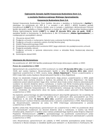 Ogłoszenie Zarządu Spółki Korporacja Budowlana Dom S.A. o zwołaniu Nadzwyczajnego Walnego Zgromadzenia Korporacja Budowlana Dom S.A. Zarząd Korporacja Budowlana Dom Spółka Akcyjna z siedzibą w Kartoszynie („Spółka”), działając na podstawie art. 399 § 1 w związku z art. 402[1] i 402[2] Kodeksu spółek handlowych („KSH”) i § 13 Statutu Spółki, oraz w związku z żądaniem akcjonariusza Polnord Spółki Akcyjnej z siedzibą w Gdyni, złożonym w trybie art. 400 § 1 KSH zwołuje Nadzwyczajne Walne Zgromadzenie Spółki („NWZ”) na dzień 29 stycznia 2016 roku na godz. 10.00 w siedzibie Spółki w Kartoszynie, ul. Budowlana 3, 84-110 Krokowa („Walne Zgromadzenie”), z następującym porządkiem obrad: 1) 2) 3) 4) 5) 6) 7) Otwarcie obrad NWZ. Podjęcie uchwały o wyłączeniu tajności przy wyborze Komisji Skrutacyjnej. Podjęcie uchwały w sprawie wyboru Komisji Skrutacyjnej. Wybór Przewodniczącego NWZ. Stwierdzenie prawidłowości zwołania NWZ i jego zdolności do podejmowania uchwał. Przyjęcie porządku obrad. Podjęcie uchwały w sprawie dokonania zmian w składzie Rady Nadzorczej obecnej kadencji. 8) Zamknięcie obrad NWZ. Informacja dla Akcjonariuszy Na podstawie art. 4022 KSH Spółka przekazuje informacje dotyczące udziału w NWZ: Prawo do uczestnictwa w NWZ Uprawnionym do uczestnictwa w NWZ zwołanym na dzień 29 stycznia 2016 roku, na godzinę 10.00, jest osoba będąca Akcjonariuszem Spółki w dniu 13 stycznia 2016 roku (dzień rejestracji uczestnictwa w NWZ, zwany dalej „Dniem Rejestracji”). Prawo uczestniczenia w NWZ mają tylko osoby będące Akcjonariuszami Spółki w Dniu Rejestracji. Akcje na okaziciela mające postać dokumentu dają prawo uczestniczenia w NWZ, jeżeli dokumenty akcji zostaną złożone w Spółce nie później niż w Dniu Rejestracji i nie będą odebrane przed zakończeniem tego dnia. Zamiast akcji może zostać złożone zaświadczenie wydane na dowód złożenia akcji u notariusza, w banku lub firmie inwestycyjnej mających siedzibę lub oddział na terytorium Unii Europejskiej lub państwa będącego stroną umowy o Europejskim Obszarze Gospodarczym. W zaświadczeniu wskazuje się numery dokumentów akcji i stwierdza, że dokumenty akcji nie będą wydane przed upływem Dnia Rejestracji uczestnictwa w NWZ. Na żądanie uprawnionego ze zdematerializowanych akcji Spółki zgłoszone nie wcześniej niż po ogłoszeniu o zwołaniu NWZ i nie później niż w pierwszym dniu powszednim po Dniu Rejestracji, tj. do dnia 14 stycznia 2016 roku, podmiot prowadzący rachunek papierów wartościowych wystawi imienne zaświadczenie o prawie uczestnictwa w NWZ. Rekomenduje się Akcjonariuszom zabranie ze sobą na NWZ imiennego zaświadczenia o prawie uczestnictwa w NWZ. Spółka ustala listę Akcjonariuszy uprawnionych do uczestnictwa w NWZ na podstawie akcji lub zaświadczeń wydanych na dowód złożenia akcji u notariusza, w banku lub firmie inwestycyjnej, złożonych w Spółce oraz wykazu przekazanego Spółce przez Krajowy Depozyt Papierów Wartościowych („KDPW”), sporządzonego na podstawie wystawionych przez podmioty prowadzące rachunki papierów wartościowych imiennych zaświadczeń o prawie uczestnictwa w NWZ. Lista Akcjonariuszy uprawnionych do udziału w NWZ zostanie sporządzona przez Zarząd i wyłożona w Biurze Zarządu w siedzibie Spółki pod adresem: ul. Budowlana 3, Kartoszyno, 84- 110 Krokowa, przez 3 dni powszednie przed odbyciem NWZ tj. w dniach od 26 stycznia 2016 roku do dnia 28 stycznia 2016 roku, w godzinach od 8:00 do 16:00. Akcjonariusz Spółki może żądać przysłania mu listy Akcjonariuszy nieodpłatnie pocztą elektroniczną, podając adres, na który lista powinna być wysłana. Akcjonariusz Spółki może zgłosić powyższe żądanie za pośrednictwem poczty elektronicznej na adres [email protected] Statut oraz Regulamin Walnych Zgromadzeń Spółki nie przewidują możliwości uczestniczenia i wypowiadania się w trakcie NWZ przy wykorzystaniu środków komunikacji elektronicznej, a także nie przewidują możliwości wykonywania prawa głosu przy wykorzystaniu środków komunikacji elektronicznej. Wybrane uprawnienia Akcjonariuszy dotyczące NWZ Akcjonariusz lub Akcjonariusze reprezentujący co najmniej jedną dwudziestą kapitału zakładowego Spółki mogą żądać umieszczenia określonych spraw w porządku obrad NWZ. Żądanie powinno zostać zgłoszone Zarządowi Spółki nie później niż na dwadzieścia jeden dni przed wyznaczonym terminem Zgromadzenia, tj. do dnia 8 stycznia 2016 roku. Żądanie powinno zawierać uzasadnienie lub projekt uchwały dotyczącej proponowanego punktu porządku obrad. Żądanie może zostać złożone w postaci elektronicznej na adres [email protected] Do zgłoszonego żądania Akcjonariusz lub zgłaszający Akcjonariusze zobowiązani są dołączyć dokumenty potwierdzające reprezentowanie przez tego Akcjonariusza lub Akcjonariuszy co najmniej jednej dwudziestej kapitału zakładowego Spółki. Akcjonariusz lub Akcjonariusze reprezentujący co najmniej jedną dwudziestą kapitału zakładowego Spółki mogą przed terminem NWZ zgłaszać Spółce na piśmie lub przy wykorzystaniu środków komunikacji elektronicznej, na adres poczty elektronicznej Spółki [email protected] projekty uchwał dotyczące spraw wprowadzonych do porządku obrad NWZ lub spraw, które mają zostać wprowadzone do porządku obrad. Do zgłoszonego żądania Akcjonariusz lub Akcjonariusze zobowiązani są dołączyć dokumenty potwierdzające reprezentowanie przez tego Akcjonariusza lub Akcjonariuszy co najmniej jednej dwudziestej kapitału zakładowego Spółki. Każdy z Akcjonariuszy Spółki może podczas NWZ zgłaszać projekty uchwał dotyczące spraw wprowadzonych do porządku obrad. Projekty te składa się Przewodniczącemu NWZ. Sposób uczestnictwa w NWZ oraz wykonywania prawa głosu Akcjonariusze mogą uczestniczyć w NWZ i wykonywać prawo głosu osobiści