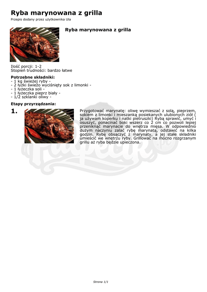 Ryba marynowana z grilla Przepis dodany przez użytkownika Ula Ryba marynowana z grilla Ilość porcji: 1-2 Stopień trudności: bardzo łatwe Potrzebne składniki: - 1 kg świeżej ryby - 2 łyżki świeżo wyciśnięty sok z limonki - 1 łyżeczka soli - 1 łyżeczka pieprz biały - 1/2 szklanki oliwy Etapy przyrządzania: 1. Przygotować marynatę: oliwę wymieszać z solą, pieprzem, sokiem z limonki i mieszanką posiekanych ulubionych ziół ( ja używam koperku i natki pietruszki) Rybą sprawić, umyć i osuszyć, ponacinać boki wszerz co 2 cm co pozwoli lepiej przeniknąć marynacie do wnętrza mięsa. W odpowiednio dużym naczyniu zalać rybę marynatą, odstawić na kilka godzin. Rybę obsączyć z marynaty, a jej stałe składniki umieścić we wnętrzu ryby. Grillować na mocno rozgrzanym grillu aż ryba będzie upieczona. Strona 1/1