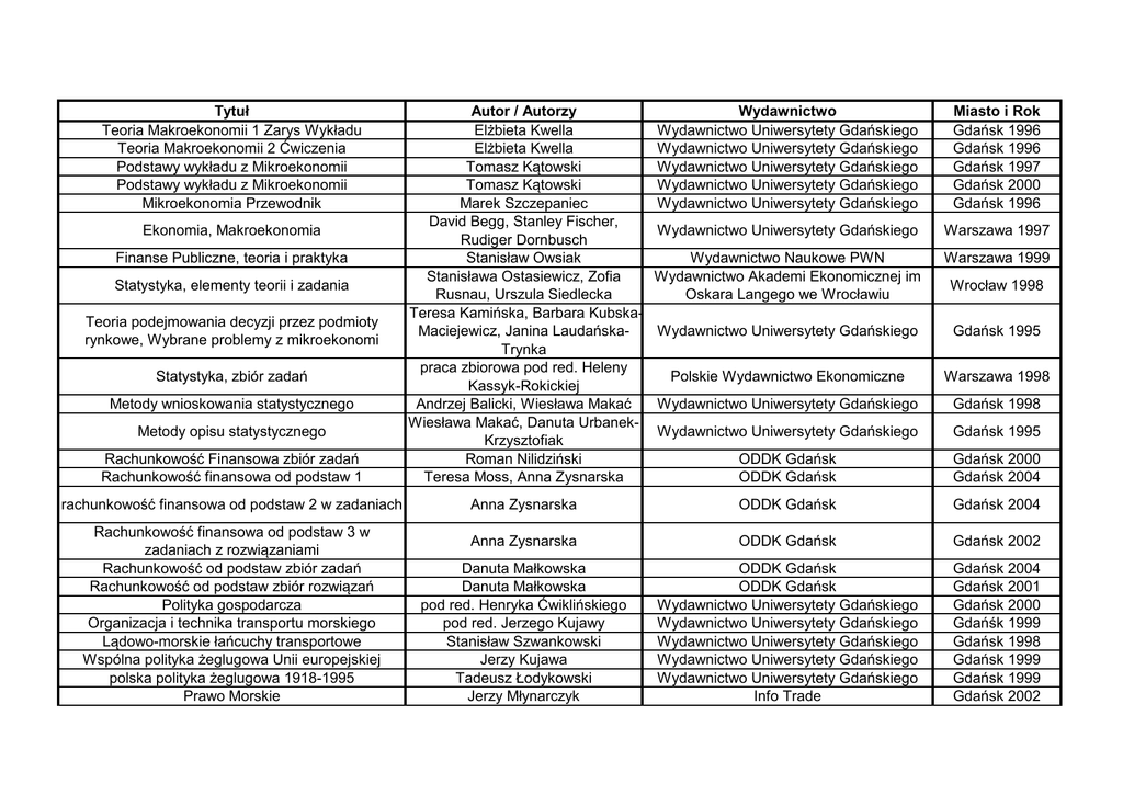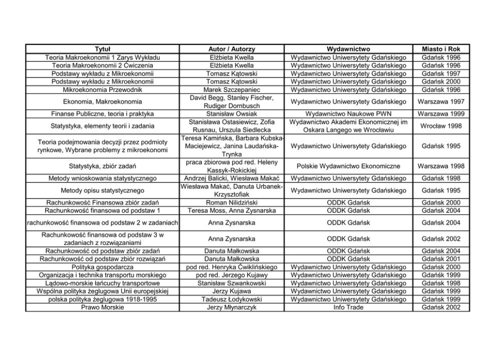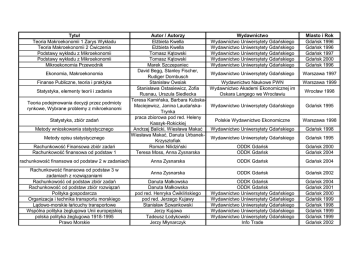 Tytuł Teoria Makroekonomii 1 Zarys Wykładu Teoria Makroekonomii 2 Ćwiczenia Podstawy wykładu z Mikroekonomii Podstawy wykładu z Mikroekonomii Mikroekonomia Przewodnik Rachunkowość Finansowa zbiór zadań Rachunkowość finansowa od podstaw 1 Autor / Autorzy Elżbieta Kwella Elżbieta Kwella Tomasz Kątowski Tomasz Kątowski Marek Szczepaniec David Begg, Stanley Fischer, Rudiger Dornbusch Stanisław Owsiak Stanisława Ostasiewicz, Zofia Rusnau, Urszula Siedlecka Teresa Kamińska, Barbara KubskaMaciejewicz, Janina LaudańskaTrynka praca zbiorowa pod red. Heleny Kassyk-Rokickiej Andrzej Balicki, Wiesława Makać Wiesława Makać, Danuta UrbanekKrzysztofiak Roman Nilidziński Teresa Moss, Anna Zysnarska rachunkowość finansowa od podstaw 2 w zadaniach Anna Zysnarska ODDK Gdańsk Gdańsk 2004 Anna Zysnarska ODDK Gdańsk Gdańsk 2002 Danuta Małkowska Danuta Małkowska pod red. Henryka Ćwiklińskiego pod red. Jerzego Kujawy Stanisław Szwankowski Jerzy Kujawa Tadeusz Łodykowski Jerzy Młynarczyk ODDK Gdańsk ODDK Gdańsk Wydawnictwo Uniwersytety Gdańskiego Wydawnictwo Uniwersytety Gdańskiego Wydawnictwo Uniwersytety Gdańskiego Wydawnictwo Uniwersytety Gdańskiego Wydawnictwo Uniwersytety Gdańskiego Info Trade Gdańsk 2004 Gdańsk 2001 Gdańsk 2000 Gdańśk 1999 Gdańsk 1998 Gdańsk 1999 Gdańsk 1999 Gdańsk 2002 Ekonomia, Makroekonomia Finanse Publiczne, teoria i praktyka Statystyka, elementy teorii i zadania Teoria podejmowania decyzji przez podmioty rynkowe, Wybrane problemy z mikroekonomi Statystyka, zbiór zadań Metody wnioskowania statystycznego Metody opisu statystycznego Rachunkowość finansowa od podstaw 3 w zadaniach z rozwiązaniami Rachunkowość od podstaw zbiór zadań Rachunkowość od podstaw zbiór rozwiązań Polityka gospodarcza Organizacja i technika transportu morskiego Lądowo-morskie łańcuchy transportowe Wspólna polityka żeglugowa Unii europejskiej polska polityka żeglugowa 1918-1995 Prawo Morskie Wydawnictwo Wydawnictwo Uniwersytety Gdańskiego Wydawnictwo Uniwersytety Gdańskiego Wydawnictwo Uniwersytety Gdańskiego Wydawnictwo Uniwersytety Gdańskiego Wydawnictwo Uniwersytety Gdańskiego Miasto i Rok Gdańsk 1996 Gdańsk 1996 Gdańsk 1997 Gdańsk 2000 Gdańsk 1996 Wydawnictwo Uniwersytety Gdańskiego Warszawa 1997 Wydawnictwo Naukowe PWN Wydawnictwo Akademi Ekonomicznej im Oskara Langego we Wrocławiu Warszawa 1999 Wydawnictwo Uniwersytety Gdańskiego Gdańsk 1995 Polskie Wydawnictwo Ekonomiczne Warszawa 1998 Wydawnictwo Uniwersytety Gdańskiego Gdańsk 1998 Wydawnictwo Uniwersytety Gdańskiego Gdańsk 1995 ODDK Gdańsk ODDK Gdańsk Gdańsk 2000 Gdańsk 2004 Wrocław 1998 Organizacja i eksploatacja portów morskich, Podręcznik do ćwiczeń Konkurencyjnośc transportu morskiego Polski Strategia rozwoju transportu morskiego Polski Organizacja i eksploatacja portów morskich, zarządzanie, organizacja, eksploatacja Funkcjonowanie i rozwój portów morskich Przewodnik po Uni Europejskiej Prawo Handlowe dla ekonomistów Prawo Międzynarodowe Publiczne Prawo Międzynarodowe Publiczne, testy, kazusy, tablice Prawo Handlowe zarys wykładu Organizacja i zarządzanie Operacje handlu zagranicznego Narzędzia informatyczne w projektowaniu działalności portów morskich, zbiór zadań Matematyka i jej zastosowanie w naukach ekonomicznych Podstawy ekonomii matematycznej Hanna Klimek, Marek Nowicki Wydawnictwo Uniwersytety Gdańskiego Ekonomika Transportu Morskiego Zeszyty naukowe Uniwersytetu Gdańskiego Instytut Transportu i Handlu Morskiego Konrad Misztal, Stanisław Szwańkowski Stanisław Szwankowski Dick Leonard Kazimierz Kruczak Remigiusz Bierzanek, Janusz Symonides Gdańsk 1998 Gdańsk 1999 Studia i materiały Uniwersytet Gdański Gdańsk 1998 Wydawnictwo Uniwersytety Gdańskiego Gdańsk 2001 Wydawnictwo Uniwersytety Gdańskiego The Economist, studio Emka Polskie Wydawnictwo Ekonomiczne Gdańsk 2000 Warszawa 1998 Warszawa 1998 Wydawnictwo Prawnicze Lexis Nexis Warszawa 2003 Paweł Filipek, Brygida Kuźniak Wydawnictwo CH. Beck Warszawa 2004 Kazimierz Kruczak Alfred Czermiński, Małgorzata Czerska, Bogdan Nogalski, Ryszard Rutka Klemens P. Białecki Wydawnictwo prawnicze PWN Warszawa 1997 Wydawnictwo Uniwersytety Gdańskiego Gdańsk 1996 Polskie Wydawnictwo Ekonomiczne Warszawa 1999 Karol Kreft, Adam Salomon Wydawnictwo Uniwersytety Gdańskiego Gdańsk 1998 Janusz Piszczała Akademia ekonomiczna w Poznaniu Poznań 1996 Alpha C. Chiang Polskie Wydawnictwo Ekonomiczne Warszawa 1994
