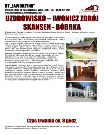 BT „JAWORZYNA” Krynica Zdrój, ul. Pułaskiego 4, Willa „CIS”, tel. +48 18 471 6171 www.btjaworzyna.pl, www.ekrynica.com UZDROWISKO – IWONICZ ZDRÓJ SKANSEN - BÓBRKA W programie: Zwiedzanie Muzeum Przemysłu Naftowego i Gazowniczego w Bóbrce , spacer po uzdrowisku Iwonicz Zdrój, czas wolny około 1 h. Muzeum Przemysłu Naftowego i Gazowniczego im. Ignacego Łukasiewicza w Bóbrce posiada bardzo zróżnicowany zbiór obiektów, dokumentów i kolekcji reprezentujących liczne specjalności naukowo-techniczne. Jest to jedyne muzeum położone na terenie czynnej do dzisiaj kopalni ropy naftowej. Można tam zobaczyć ropę naftową w stanie naturalnym, XIX wieczne kopanki (szyby naftowe) oraz pospacerować pięknymi alejkami pośród lasu. Do najcenniejszych zabytków muzealnych należą obiekty, pochodzące z czasów Ignacego Łukasiewicza. Kopalnia Bóbrka jest jedną z najstarszych kopalni ropy naftowej na świecie. Tu rodziły się różnorodne techniki, technologie i konstrukcje, które dały podwaliny rozwoju wielu branż przemysłu naftowego - od geologii i poszukiwań, wiertnictwa i eksploatacji, przemysłu rafineryjnego - do dystrybucji ropy i jej produktów. Tu zrodziła się gałąź przemysłu, która przyniosła światu ogromny rozwój cywilizacyjny Iwonicz Zdrój - położony jest w południowo-wschodniej części Polski w województwie podkarpackim. Geograficznie Iwonicz leży w Beskidzie Niskim, w dolinie Iwonickiego Potoku na wysokości 380-450 m n.p.m. Na jego atrakcyjność wpływa przede wszystkim malownicze położenie wśród wzniesień porośniętych zielonymi lasami jodłowo - bukowymi, bogate złoża wód leczniczych oraz klimat o potwierdzonych właściwościach leczniczych. Zabytkowy charakter uzdrowiska wraz z pięknem architektury budynków sanatoryjnych wkomponowanych w dziewiczy krajobraz dostarcza przybyłym tu kuracjuszom i wczasowiczom niezapomnianych wrażeń. Czas trwania ok. 8 godz. Dla klientów indywidualnych wycieczka organizowana jest w następujących terminach kliknij tutaj Dla grup wycieczka realizowana w dowolnym terminie.