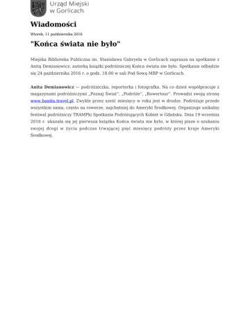 Wiadomości Wtorek, 11 października 2016 "Końca świata nie było" Miejska Biblioteka Publiczna im. Stanisława Gabryela w Gorlicach zaprasza na spotkanie z Anitą Demianowicz, autorką książki podróżniczej Końca świata nie było. Spotkanie odbędzie się 24 października 2016 r. o godz. 18.00 w sali Pod Sową MBP w Gorlicach. Anita Demianowicz — podróżniczka, reporterka i fotografka. Na co dzień współpracuje z magazynami podróżniczymi „Poznaj Świat”, „Podróże”, „Rowertour”. Prowadzi swoją stronę www.banita.travel.pl. Zwykle przez sześć miesięcy w roku jest w drodze. Podróżuje przede wszystkim sama, często na rowerze, najchętniej do Ameryki Środkowej. Organizuje unikalny festiwal podróżniczy TRAMPki Spotkania Podróżujących Kobiet w Gdańsku. Dnia 19 września 2016 r. ukazała się jej pierwsza książka Końca świata nie było, w której pisze o szukaniu swojej drogi w życiu podczas trwającej pięć miesięcy podróży przez kraje Ameryki Środkowej.