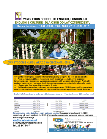 WIMBLEDON SCHOOL OF ENGLISH, LONDON, UK Kurs w terminach: 18.04 - 28.04; 7.08 - 18.08 i 2.10 -13.10 .2017 Bardzo lubiany przez studentów kurs skonstruowany specjalnie dla osób po czterdziestce. Praca nad językiem 20 lekcji tygodniowo - język związany z popołudniowymi zajęciami i komunikacja oraz 1 całodzienna wycieczka z nauczycielem i 6 wycieczek półdniowych. Wycieczki zależą od wyboru grupy i stwarzają okazję do praktycznego zastosowania wiedzy zdobytej w klasie. Maksymalna ilość studentów w grupie to 10 osób. Najdogodniejszy poziom – minimum średniozaawansowany, (B1-B2)osoby na niższym poziomie mogą uczestniczyć w przedpołudniowych zajęciach GE i popołudniowych Kursu English & Culture. Zakwaterowanie płatne dodatkowo wedle ogólnego cennika. Do dyspozycji apartamenty (od £290 tygodniowo) lub pobyt w rodzinie (od £195). W przypadku apartamentów wymagana wczesna rezerwacja Informacje/rezerwacje [email protected] [email protected] Tel. 22 8471487