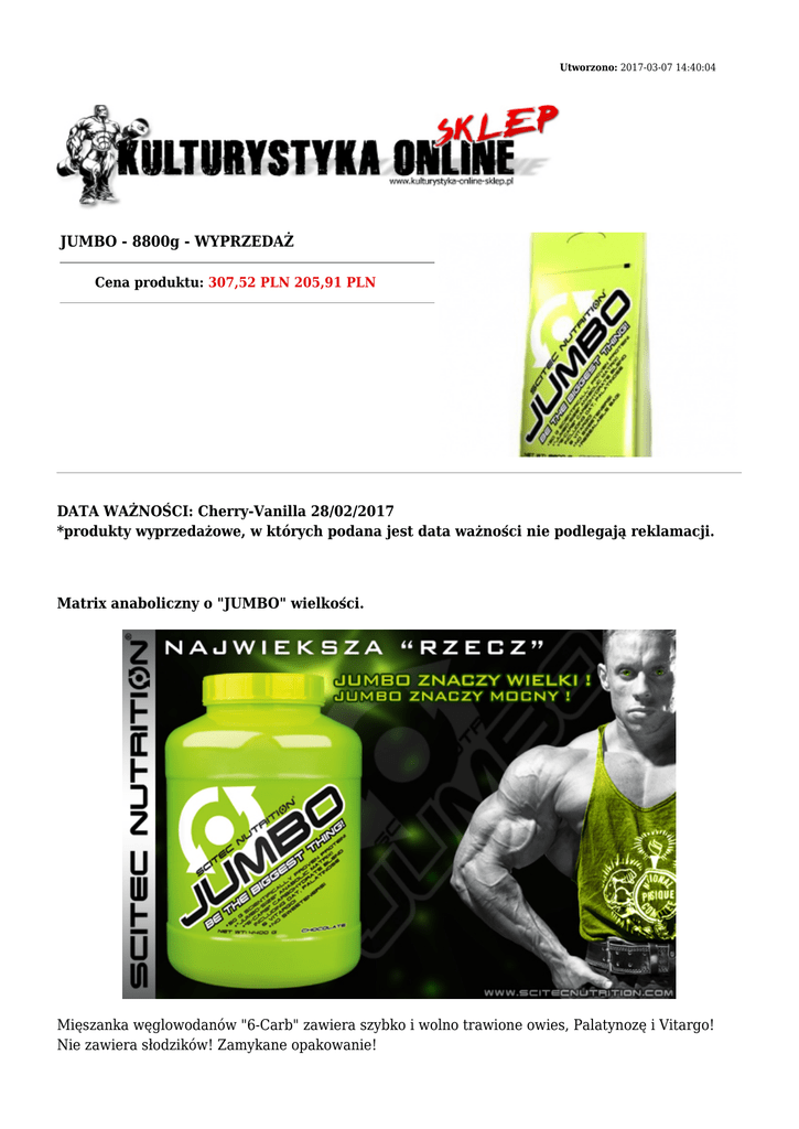 Utworzono: 2017-03-07 14:40:04 JUMBO - 8800g - WYPRZEDAŻ Cena produktu: 307,52 PLN 205,91 PLN DATA WAŻNOŚCI: Cherry-Vanilla 28/02/2017 *produkty wyprzedażowe, w których podana jest data ważności nie podlegają reklamacji. Matrix anaboliczny o "JUMBO" wielkości. Mięszanka węglowodanów "6-Carb" zawiera szybko i wolno trawione owies, Palatynozę i Vitargo! Nie zawiera słodzików! Zamykane opakowanie! Jumbo oznacza duży! Jumbo oznacza siłę! Dowiedziono naukowo, że ludzie nie doceniają przyjmowania substancji odżywczych podczas diety ale także przeceniają faktyczną konsumpcję żywności gdy chcą zyskać masę mięśniową i siłę. Inaczej mówiąc jedzą mniej niż sądzą i potrzebują dla stałego i znacącego postępu w treningu. Każdy poszukuje złotego środka, ignorując fakt, iż nie ma niczego mocniejszego niż ciągła konsumpcja właściwych ilości kalorii, energetycznych węglowodanów i budującyc mięśnie protein. Jeśli weźmiemy pod uwagę fakt, iż wielu trenujących nie przeznacza wystarczającej ilości czasu i energii na prowadzenie dziennika diety (jako sprawdzonej metody) wtedy jedynym praktycznym rozwiązaniem jest codzienne stosowanie JUMBO ktory zapewnia w dużym stoopniu wystarczająca ilość składników odżywczych aby osiągnąć doskonałe wyniki. 50 gramów protein najwyższej jakości w jednej porcji, duża dawka szybko i wolno uwalniających się węglowodanów zapewnia zwiększone odżywianie Twojego organizmu. Jumbo zawiera szybkodziałającą serwatkę proteinową, która jest przydatna przed, w trakcie i po treningu jako recepta zawierająca najnowocześniejsze składniki odżywcze jakie zna nauka. Dodatkowo regularne odżywianie się powoduje, że substancje zawierające wolno trawioe proteiny wydzielają aminokwasy do krwioobiegu przez około 4 do 6 godzin. Z tego też powodu suplementy diety powinny zawierać szybko wchłanialne proteiny, w szczególności jeśli chcemy korzystać z nich podczas treningu z maksymalnym efektem. Jumbo nie zawiera żadnych słodzików. Skład: Porcja: 220 g Porcji w opakowaniu: 40 Opakowanie: 8800 g Wartość odżywcza Wartość energetyczna w 1 porcji 915 kcal Białko 50 g Węglowodany 155 g - w tym cukry 37 g Tłuszcz: 6g - w tym tłuszcz nasycony 2g - w tym cholesterol 50mg Sód 68mg Potas 122mg Błonnik 6-Carb Matrix: 5g 147 g dekstroza, Palatynoza™ (izomaltuloza – węglowodan o niskim indeksie glikemicznym), mąka owsiana, maltodekstryna, fruktoza, Waxy maize starch JUMBO-SIZE MATRIKS ZAWIERAJĄCY DODATKOWE SKŁADNIKI w tym : 8780 mg zastrzeżony wieloskładnikowy matriks CREA-BOMB 5610 mg monohydrat kreatyny, MicronTec (mikronizowany monohydrat kreatyny), cytrynian kreatyny, fosforan kreatyny, pirogronian kreatyny - HEMO-NO matriks : 1056 mg L-arginina, L-ornityna, alfa-ketoglutaran wapnia - JUMBO AMINO SELECT matriks : 957 mg L-glutamina, L-alanina - BCAA XPRESS 100% matriks : 940 mg L-leucyna, L-izoleucyna, L-walina - Kompleks wspomagający : magnez (15% ZDS)*, BioPerina® (piperyna; ekstrakt Piper nigrum) Dawkowanie: Spożywać jedną pełną porcję ( pięć miarek ) dziennie w zależności od masy i aktywności fizycznej. Mozna popijać JUMBO w ciągu dnia, przed w trakcie lub po treningu. Wymięszać wybraną ilość proszku ze 100ml płynu na każdą łyżkę. Adres: http://www.ko.sklep.pl/ Telefon: kom. 782 010 880 Email: [email protected]