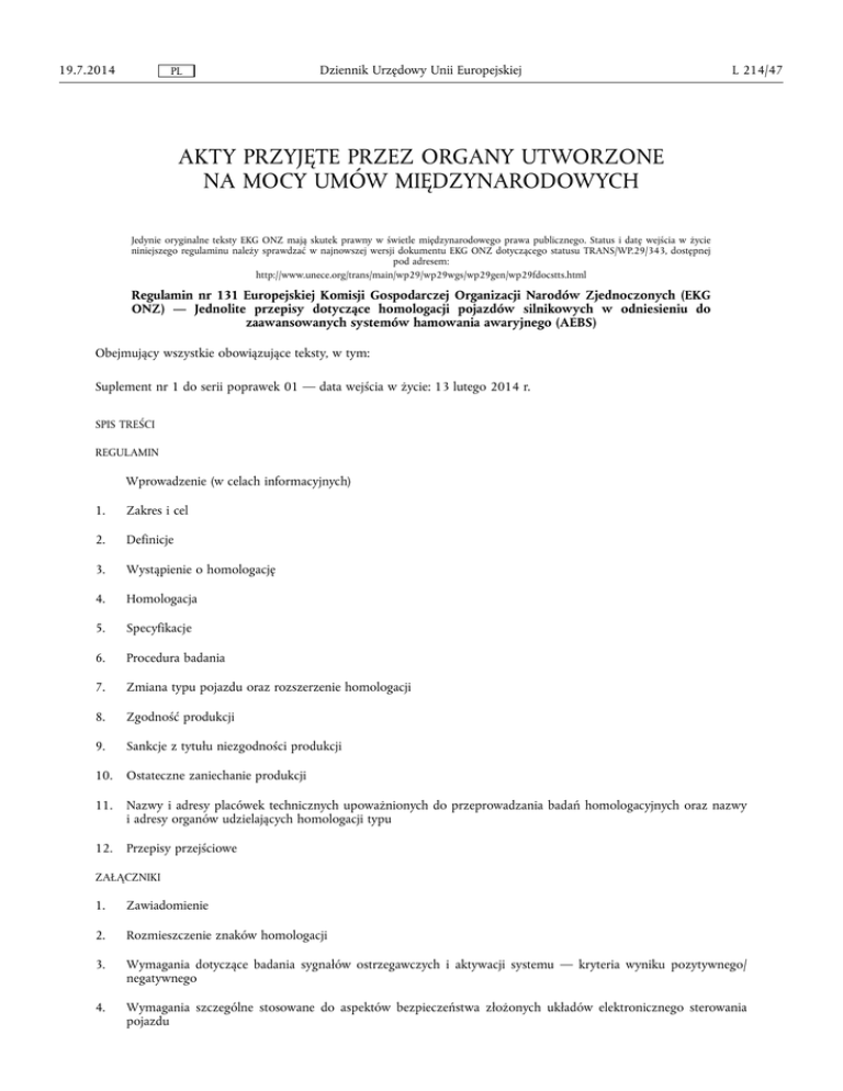 19.7.2014 PL Dziennik Urzędowy Unii Europejskiej L 214/47 AKTY PRZYJĘTE PRZEZ ORGANY UTWORZONE NA MOCY UMÓW MIĘDZYNARODOWYCH Jedynie oryginalne teksty EKG ONZ mają skutek prawny w świetle międzynarodowego prawa publicznego. Status i datę wejścia w życie niniejszego regulaminu należy sprawdzać w najnowszej wersji dokumentu EKG ONZ dotyczącego statusu TRANS/WP.29/343, dostępnej pod adresem: http://www.unece.org/trans/main/wp29/wp29wgs/wp29gen/wp29fdocstts.html Regulamin nr 131 Europejskiej Komisji Gospodarczej Organizacji Narodów Zjednoczonych (EKG ONZ) — Jednolite przepisy dotyczące homologacji pojazdów silnikowych w odniesieniu do zaawansowanych systemów hamowania awaryjnego (AEBS) Obejmujący wszystkie obowiązujące teksty, w tym: Suplement nr 1 do serii poprawek 01 — data wejścia w życie: 13 lutego 2014 r. SPIS TREŚCI REGULAMIN Wprowadzenie (w celach informacyjnych) 1. Zakres i cel 2. Definicje 3. Wystąpienie o homologację 4. Homologacja 5. Specyfikacje 6. Procedura badania 7. Zmiana typu pojazdu oraz rozszerzenie homologacji 8. Zgodność produkcji 9. Sankcje z tytułu niezgodności produkcji 10. Ostateczne zaniechanie produkcji 11. Nazwy i adresy placówek technicznych upoważnionych do przeprowadzania badań homologacyjnych oraz nazwy i adresy organów udzielających homologacji typu 12. Przepisy przejściowe ZAŁĄCZNIKI 1. Zawiadomienie 2. Rozmieszczenie znaków homologacji 3. Wymagania dotyczące badania sygnałów ostrzegawczych i aktywacji systemu — kryteria wyniku pozytywnego/ negatywnego 4. Wymagania szczególne stosowane do aspektów bezpieczeństwa złożonych układów elektronicznego sterowania pojazdu L 214/48 PL Dziennik Urzędowy Unii Europejskiej 19.7.2014 Wprowadzenie (w celach informacyjnych) Celem niniejszego regulaminu jest ustanowienie jednolitych przepisów dotyczących zaawansowanych systemów hamowania awaryjnego (Advanced Emergency Braking Systems — AEBS) montowanych w pojaz dach silnikowych kategorii M2, M3, N2 i N3 (1) wykorzystywanych głównie na drogach szybkiego ruchu. Podczas gdy w przypadku tych kategorii pojazdów zamontowanie zaawansowanego systemu hamowania awaryjnego przyniesie zasadniczo korzyści, istnieją podgrupy pojazdów, w przypadku których korzyści są raczej wątpliwe, gdyż pojazdy te są głównie wykorzystywane w warunkach innych niż panujące na drogach szybkiego ruchu (np. autobusy z miejscami stojącymi dla pasażerów, tj. pojazdy należące do klas I, II i A (1)). Niezależnie od kwestii ewentualnych korzyści istnieją inne podgrupy pojazdów, w przypadku których zamon towanie AEBS byłoby trudne technicznie (np. w związku z położeniem czujnika w pojazdach kategorii G i pojazdach specjalnego przeznaczenia itp.). Ponadto systemy przeznaczone dla pojazdów, które nie są wyposażone w pneumatyczne zawieszenie tylnej osi, wymagają zaawansowanej technologii w zakresie czujników w celu uwzględnienia zmiany kąta pochylenia pojazdu. Umawiające się Strony, które zamierzają stosować niniejszy regulamin w odniesieniu do tego rodzaju pojazdów, powinny zapewnić w związku z tym wystarczająco dużo czasu. System musi automatycznie wykrywać możliwość zderzenia z przodu, ostrzegać kierowcę oraz uruchamiać układ hamulcowy pojazdu, aby zmniejszyć prędkość pojazdu w celu uniknięcia zderzenia lub ograniczenia jego skutków w przypadku, gdy kierowca nie reaguje na ostrzeżenie. System musi zadziałać jedynie w tych sytuacjach podczas jazdy, w których hamowanie doprowadzi do unik nięcia wypadku lub ograniczenia jego skutków i nie może zadziałać w normalnych sytuacjach podczas jazdy. Awaria systemu nie może zagrażać bezpiecznemu działaniu pojazdu. System musi zapewniać co najmniej akustyczny lub wyczuwalny sygnał ostrzegawczy, którym może być również znaczne zmniejszenie prędkości, służący zwróceniu uwagi nieuważnego kierowcy na krytyczną sytuację. W trakcie wszelkich działań wykonywanych przez system (faza ostrzegania o zderzeniu i faza hamowania awaryjnego) kierowca może w dowolnym momencie w drodze świadomego działania, np. poprzez działanie kierujące lub gwałtowne naciśnięcie pedału gazu, przejąć kontrolę i uchylić działanie systemu. Regulamin nie może uwzględniać wszystkich możliwych warunków ruchu i elementów infrastruktury w ramach procesu homologacji typu. Warunki i elementy występujące w rzeczywistości nie powinny prowadzić do błędnych sygnałów ostrzegawczych lub błędnego hamowania w stopniu, który mógłby skłonić kierowcę do wyłączenia systemu. 1. ZAKRES I CEL Niniejszy regulamin stosuje się do homologacji pojazdów kategorii M2, N2, M3 i N3 (1) w odniesieniu do pokła dowego systemu służącego do zapobiegania zderzeniom w postaci najechania z tyłu na tym samym pasie ruchu lub do ograniczenia skutków takich zderzeń. 2. DEFINICJE 2.1. „Zaawansowany system hamowania awaryjnego (AEBS)” oznacza system, który może automatycznie wykrywać możliwość zderzenia z przodu i uruchamiać układ hamulcowy pojazdu, aby zmniejszyć prędkość pojazdu w celu uniknięcia zderzenia lub ograniczenia jego skutków. 2.2. „Typ pojazdu w odniesieniu do jego zaawansowanego systemu hamowania awaryjnego” oznacza kategorię pojazdów, które nie różnią się między sobą pod takimi zasadniczymi względami jak: a) nazwa handlowa lub znak towarowy producenta; b) cechy pojazdu, które znacząco wpływają na działanie AEBS; c) rodzaj i budowa AEBS. 2.3. „Przedmiotowy pojazd” oznacza pojazd poddawany badaniom. (1) Zgodnie z definicją zawartą w ujednoliconej rezolucji w sprawie budowy pojazdów (R.E.3), dokument ECE/TRANS/WP.29/78/Rev.3, pkt 2. 19.7.2014 PL Dziennik Urzędowy Unii Europejskiej L 214/49 2.4. „Cel” oznacza produkowany seryjnie w dużych ilościach samochód osobowy kategorii M1 AA kareta (sedan) (1) lub, w przypadku celu miękkiego, obiekt reprezentujący taki pojazd pod względem jego możliwoś
